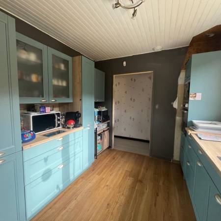 un hall d'entrée desservant une cuisine aménagée, équipée, un salon/salle à manger spacieux et lumineux avec son poêle à granules, trois chambres, une salle de douche à l'italienne, et un wc.