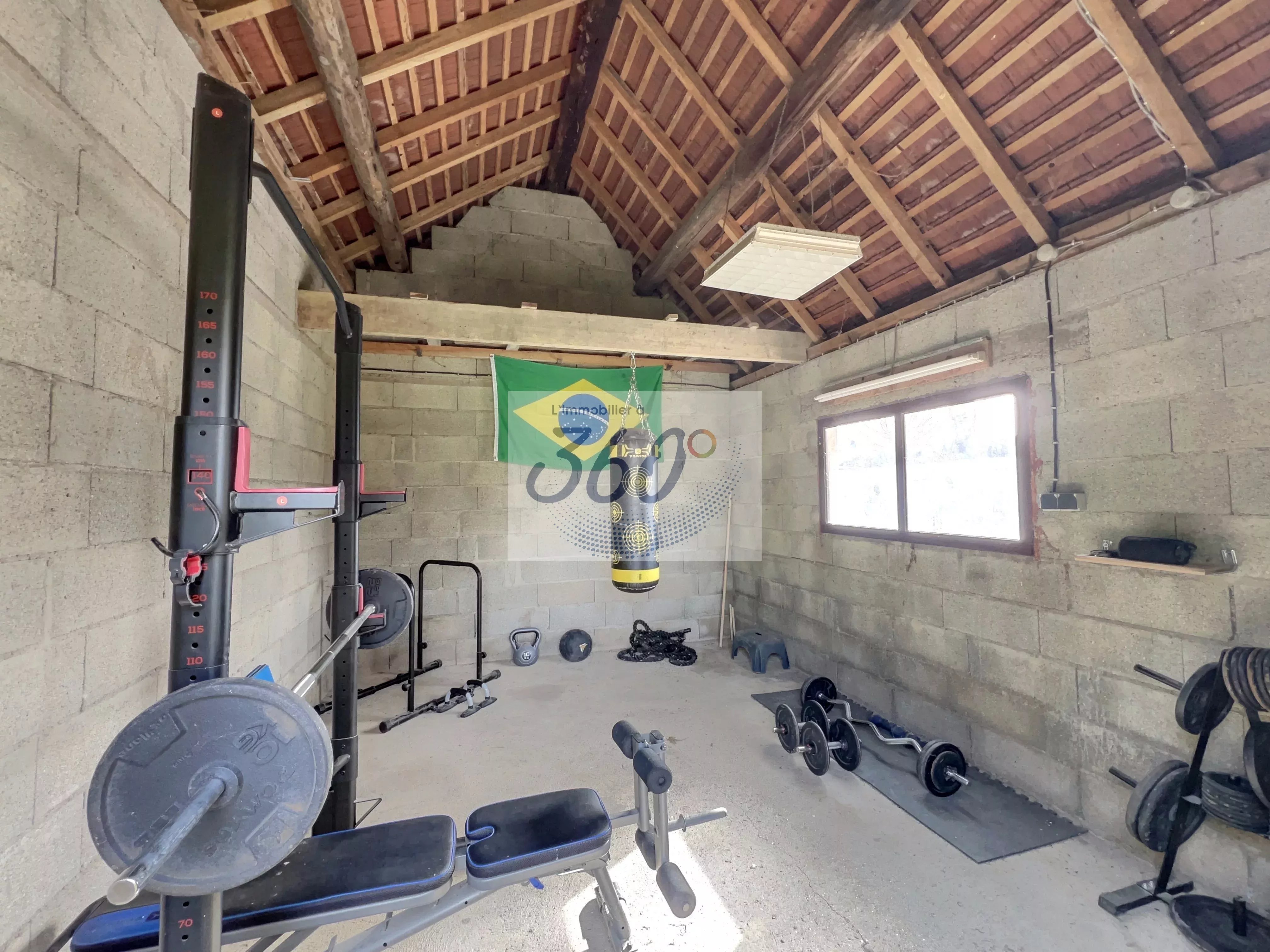 une agréable piscine, un coin barbecue convivial, un atelier actuellement aménagé en salle de sport, un espace dédié à l’entretien du jardin et de la piscine.