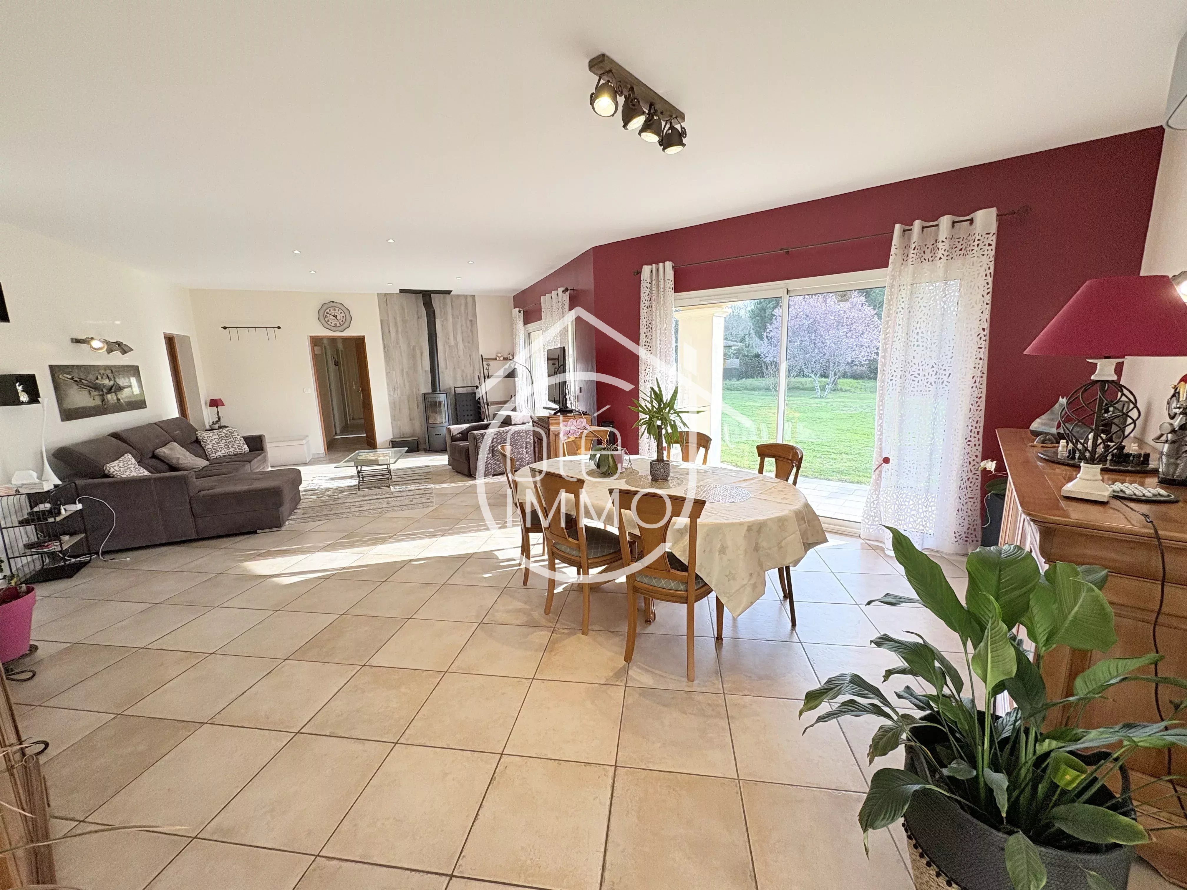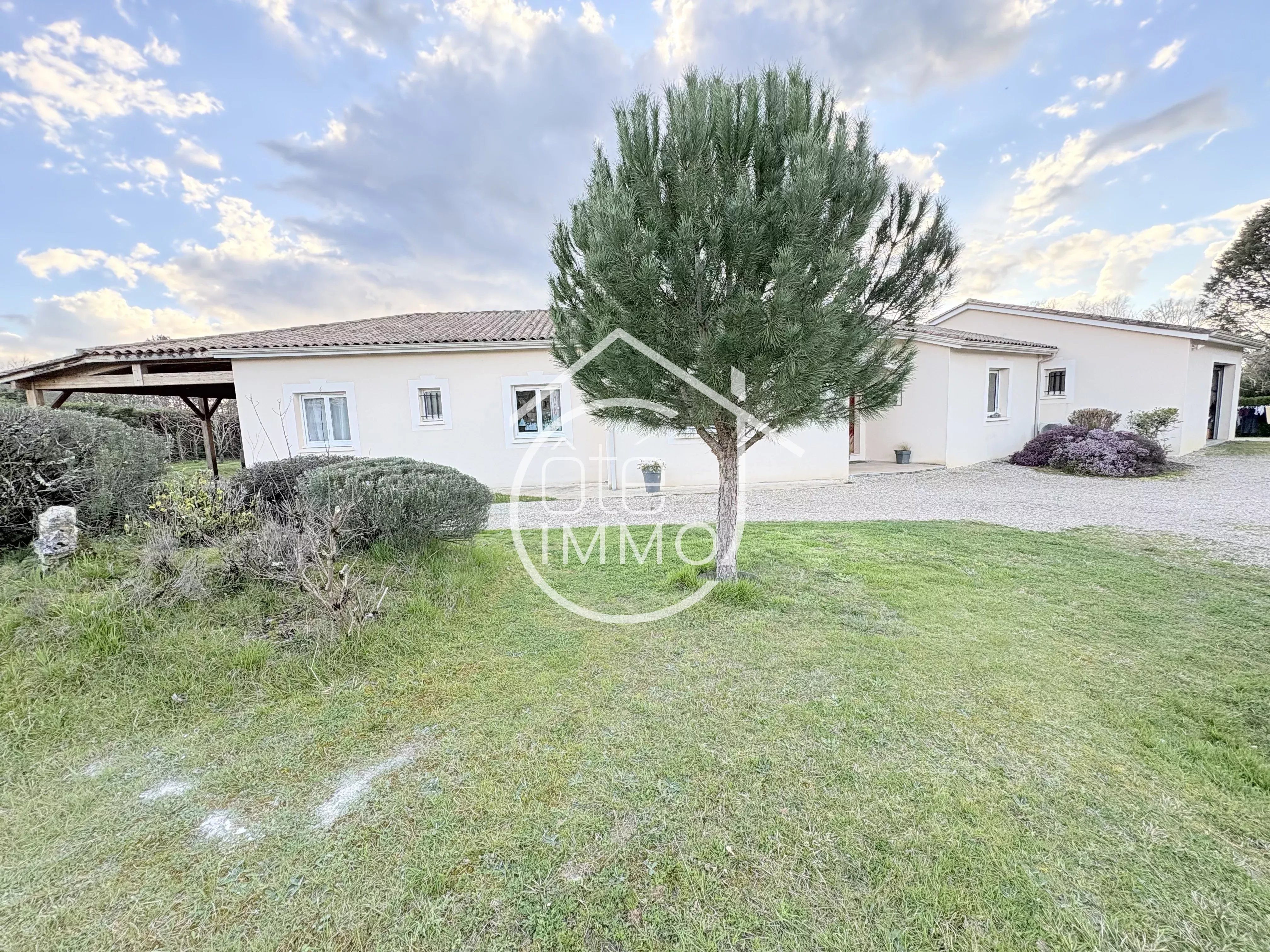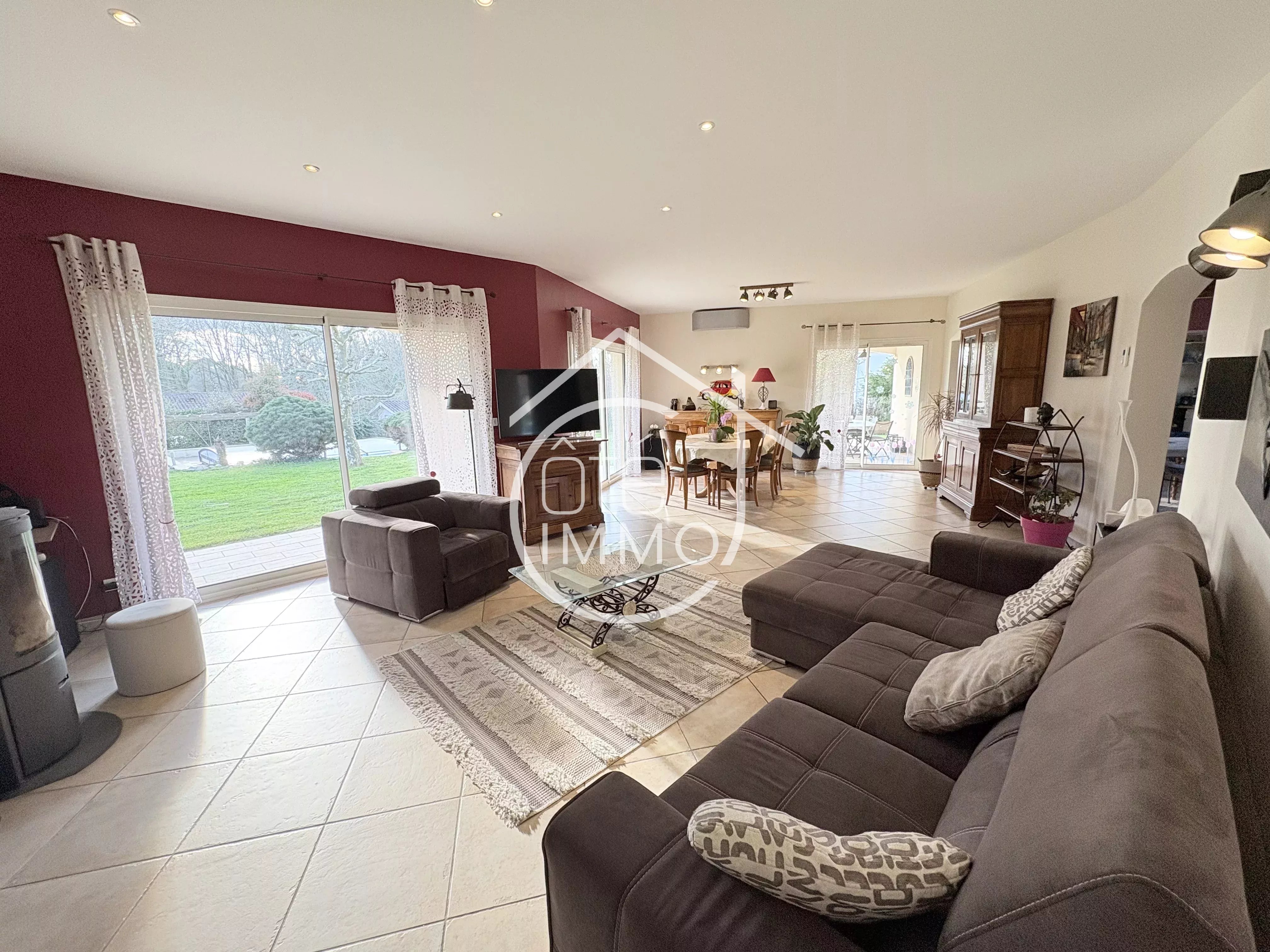 Côté Immo Prigonrieux vous présente cette agréable maison de plain-pied, située dans un environnement paisible, idéal pour se ressourcer, tout en restant proche des commodités du quotidien. Un cadre de vie harmonieux entre tranquillité et praticité. Construite en 2002, cette maison offre une surface habitable d’environ 166m². Dès l’entrée, vous découvrirez un espace fonctionnel desservant un WC indépendant, un cellier, une cuisine lumineuse entièrement équipée de 18m² ainsi qu’une buanderie de 10m². Le garage attenant de 22m² permet un accès direct à une cave. Le séjour, spacieux et baigné de lumière avec ses 48m², constitue un véritable espace de vie convivial, idéal pour recevoir. Il donne également accès à un bureau de 11m², pouvant facilement être aménagé en chambre supplémentaire. L’espace nuit se compose d’une suite parentale de 20m² avec salle d’eau et dressing, de trois chambres confortables entre 10m² et 12m², d’une salle de bains équipée d’une douche et d’une baignoire, ainsi que d’un WC séparé. À l’extérieur, vous profiterez d’un jardin clos et arboré, agrémenté d’une terrasse couverte, d’un carport attenant de 41m², d’un abri de jardin et d’une piscine couverte de 5x10. L’ensemble est implanté sur un terrain de 2735m². Une maison familiale aux beaux volumes, idéale pour profiter d’un cadre de vie serein. Points techniques : - Chauffage au sol par géothermie - Climatisation réversible par PAC air/air - Poêle à bois - Double vitrage PVC - Portail électrique - Tout à l'égout