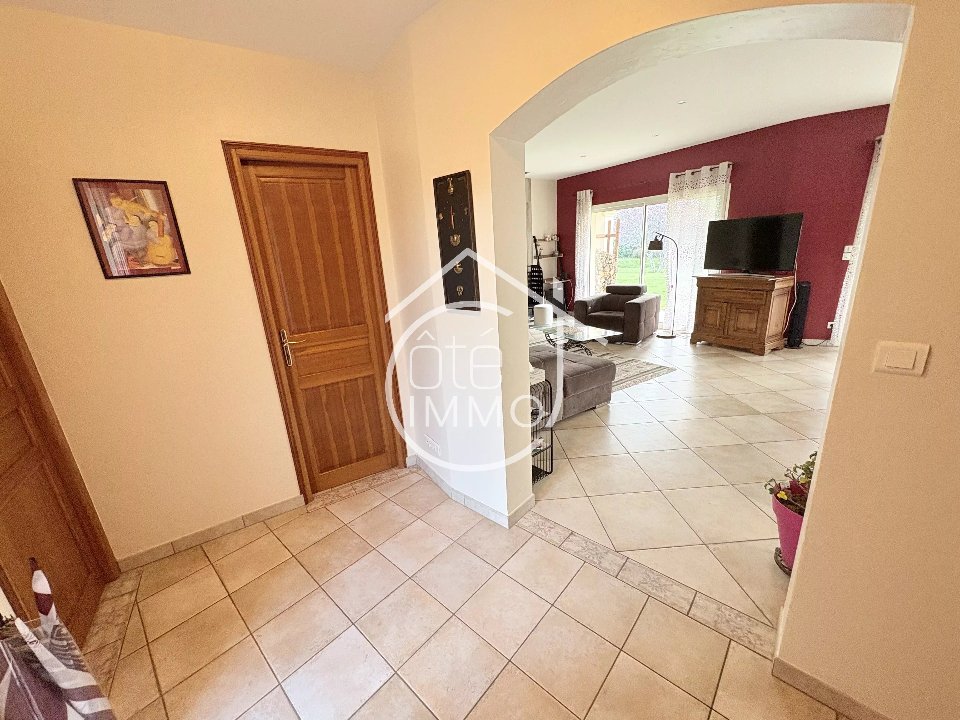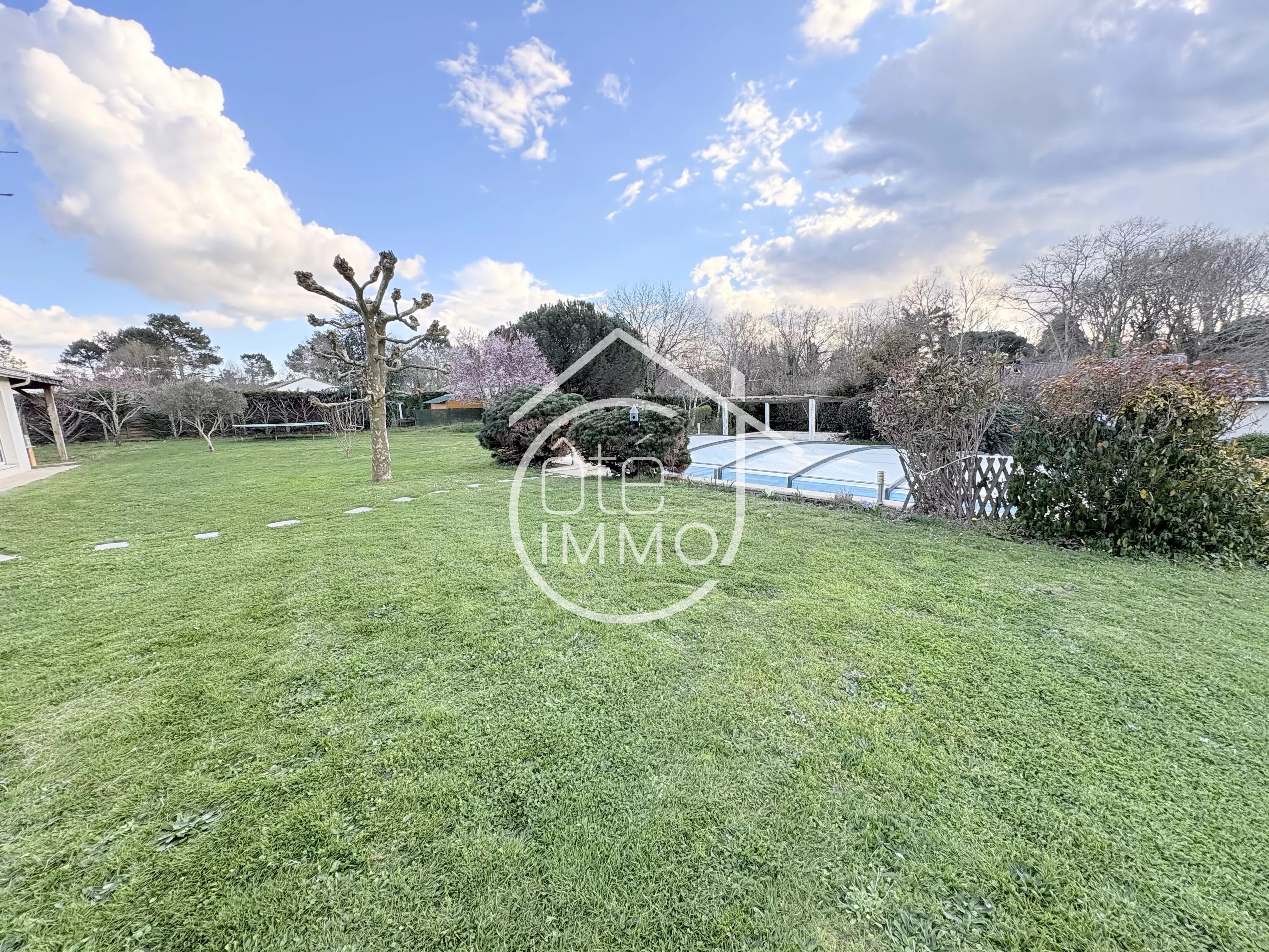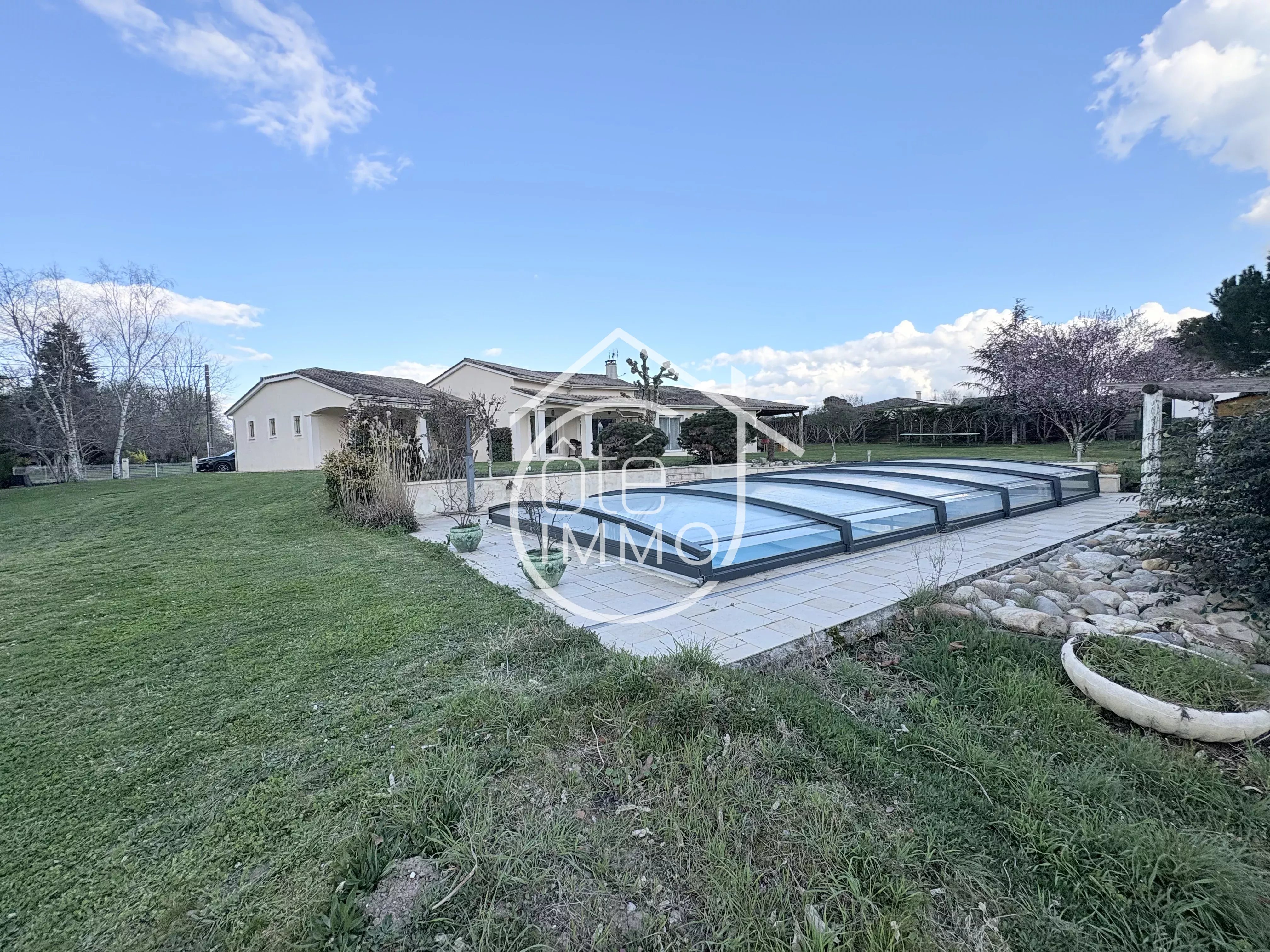 Côté Immo Prigonrieux vous présente cette agréable maison de plain-pied, située dans un environnement paisible, idéal pour se ressourcer, tout en restant proche des commodités du quotidien. Un cadre de vie harmonieux entre tranquillité et praticité. Construite en 2002, cette maison offre une surface habitable d’environ 166m². Dès l’entrée, vous découvrirez un espace fonctionnel desservant un WC indépendant, un cellier, une cuisine lumineuse entièrement équipée de 18m² ainsi qu’une buanderie de 10m². Le garage attenant de 22m² permet un accès direct à une cave. Le séjour, spacieux et baigné de lumière avec ses 48m², constitue un véritable espace de vie convivial, idéal pour recevoir. Il donne également accès à un bureau de 11m², pouvant facilement être aménagé en chambre supplémentaire. L’espace nuit se compose d’une suite parentale de 20m² avec salle d’eau et dressing, de trois chambres confortables entre 10m² et 12m², d’une salle de bains équipée d’une douche et d’une baignoire, ainsi que d’un WC séparé. À l’extérieur, vous profiterez d’un jardin clos et arboré, agrémenté d’une terrasse couverte, d’un carport attenant de 41m², d’un abri de jardin et d’une piscine couverte de 5x10. L’ensemble est implanté sur un terrain de 2735m². Une maison familiale aux beaux volumes, idéale pour profiter d’un cadre de vie serein. Points techniques : - Chauffage au sol par géothermie - Climatisation réversible par PAC air/air - Poêle à bois - Double vitrage PVC - Portail électrique - Tout à l'égout
