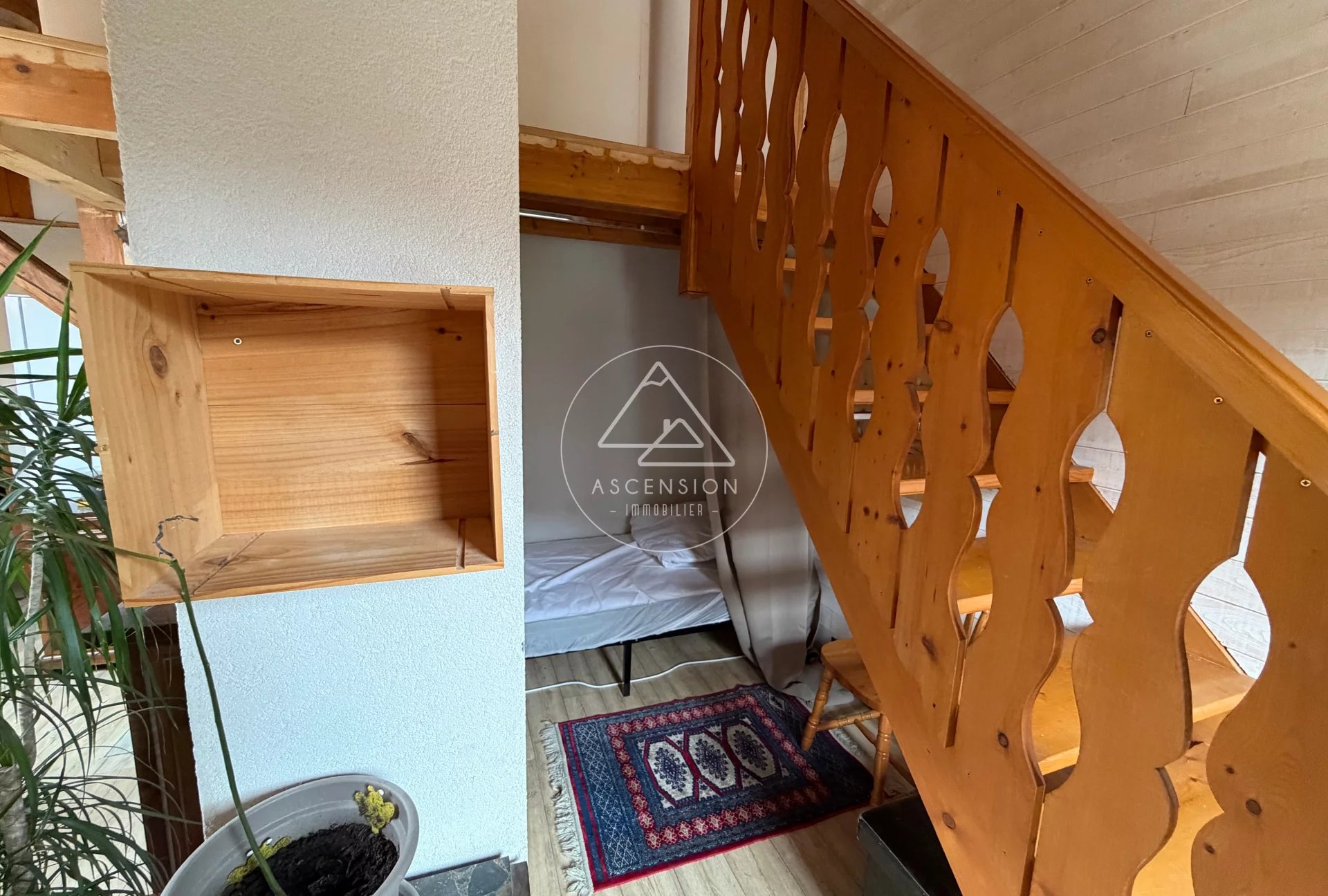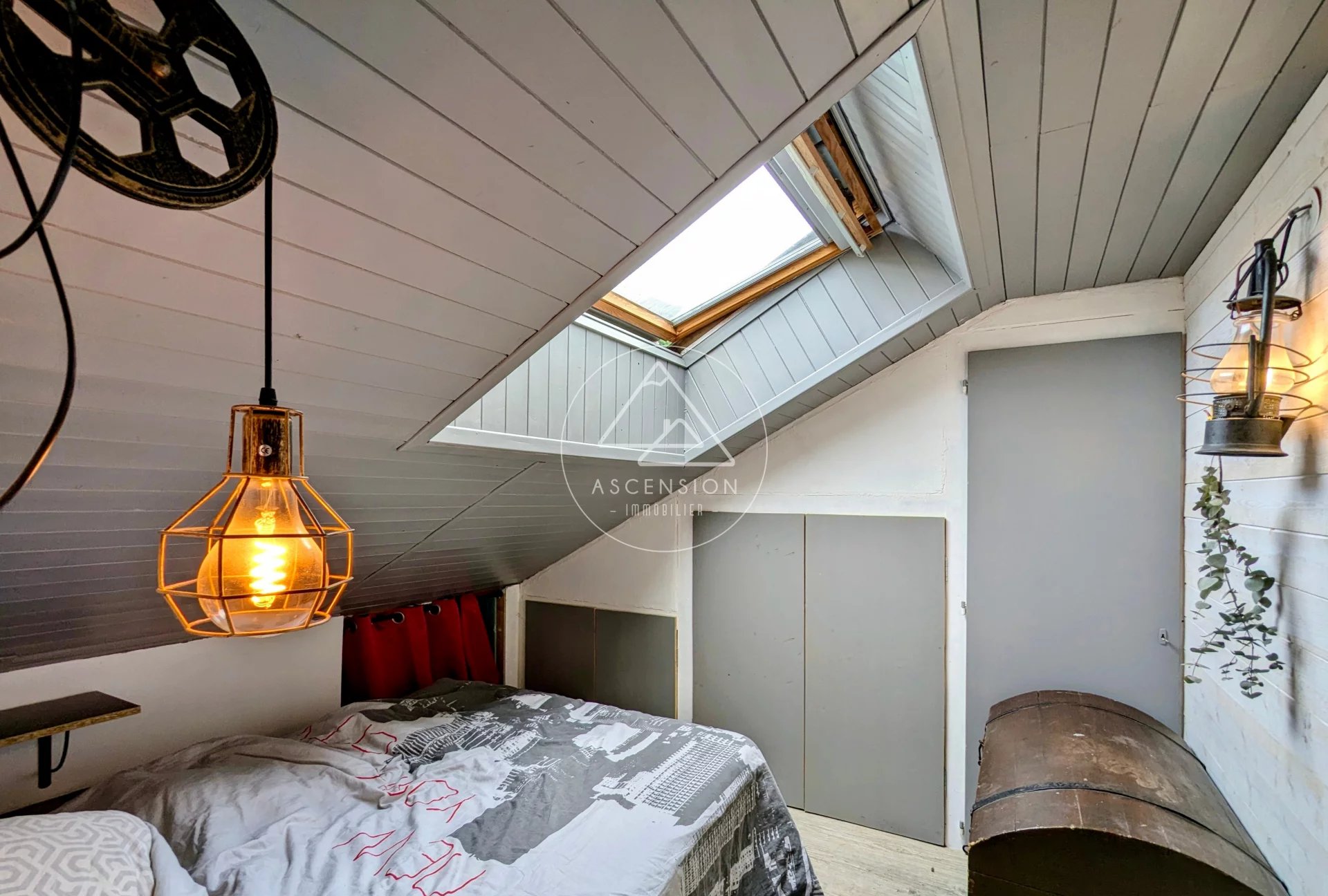 La pièce de vie, lumineuse grâce à ses deux velux, séduit par sa belle hauteur sous plafond. Elle accueille également une cuisine et un espace nuit intelligemment aménagé sous l’escalier, pouvant être transformé en dressing.