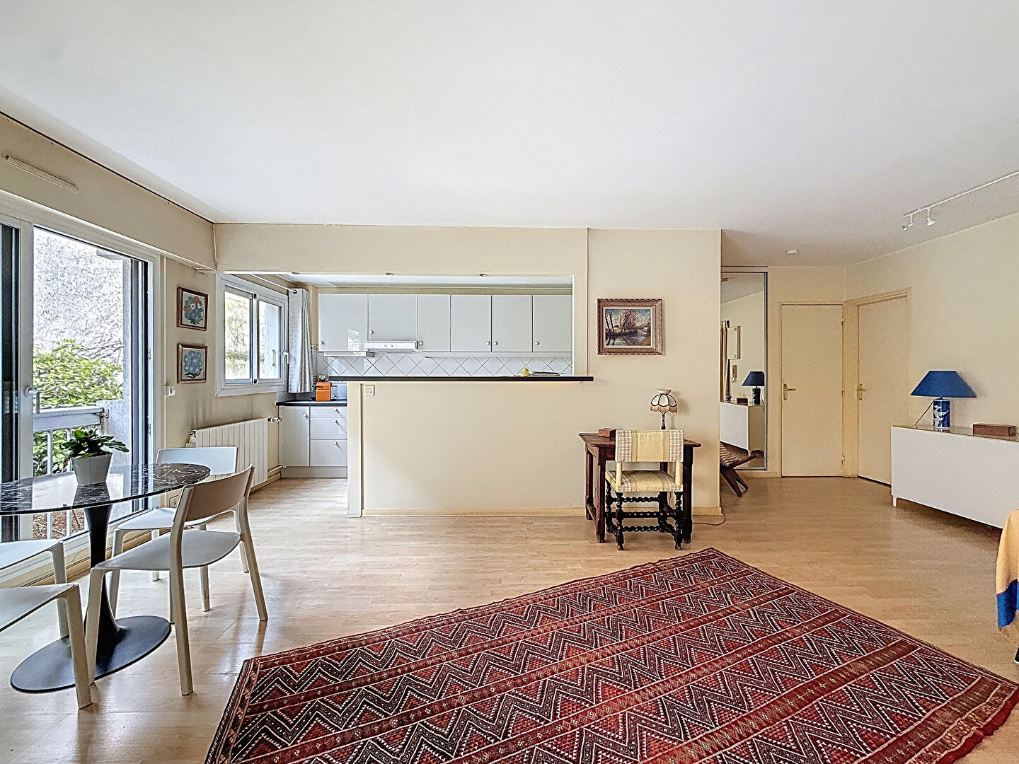 Rue Poliveau, au coeur du 5e arrondissement, au 1er étage avec ascenseur d'une copropriété des années 70 avec gardien, appartement 3 pièces de 71,78 m² Carrez, au calme absolu sur cour végétalisée, avec un balcon de 5 m². Il se compose d'une entrée avec débarras, d'une belle pièce de vie aux volumes confortables ouvrant sur le balcon, d'une cuisine semi-ouverte attenante au séjour, d'une chambre avec dressing, d'une salle de bains, ainsi que d'un WC indépendant. Exposé plein sud, l'appartement profite d'un cadre de vie très agréable, à l'abri des nuisances, avec une vue dégagée sur la verdure de la copropriété. Une cave complète le bien. Possibilité d'acquérir un double box en sus. (4.17 % honoraires TTC à la charge de l'acquéreur.) Copropriété de 225 lots - dont 73 lots habitation. Charges annuelles : 6060 euros.