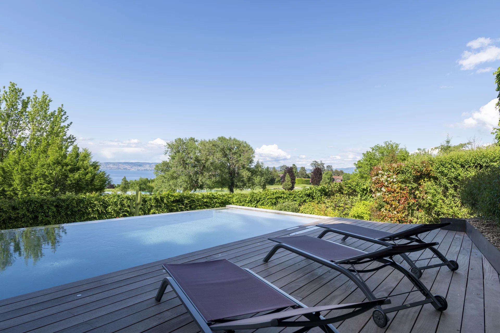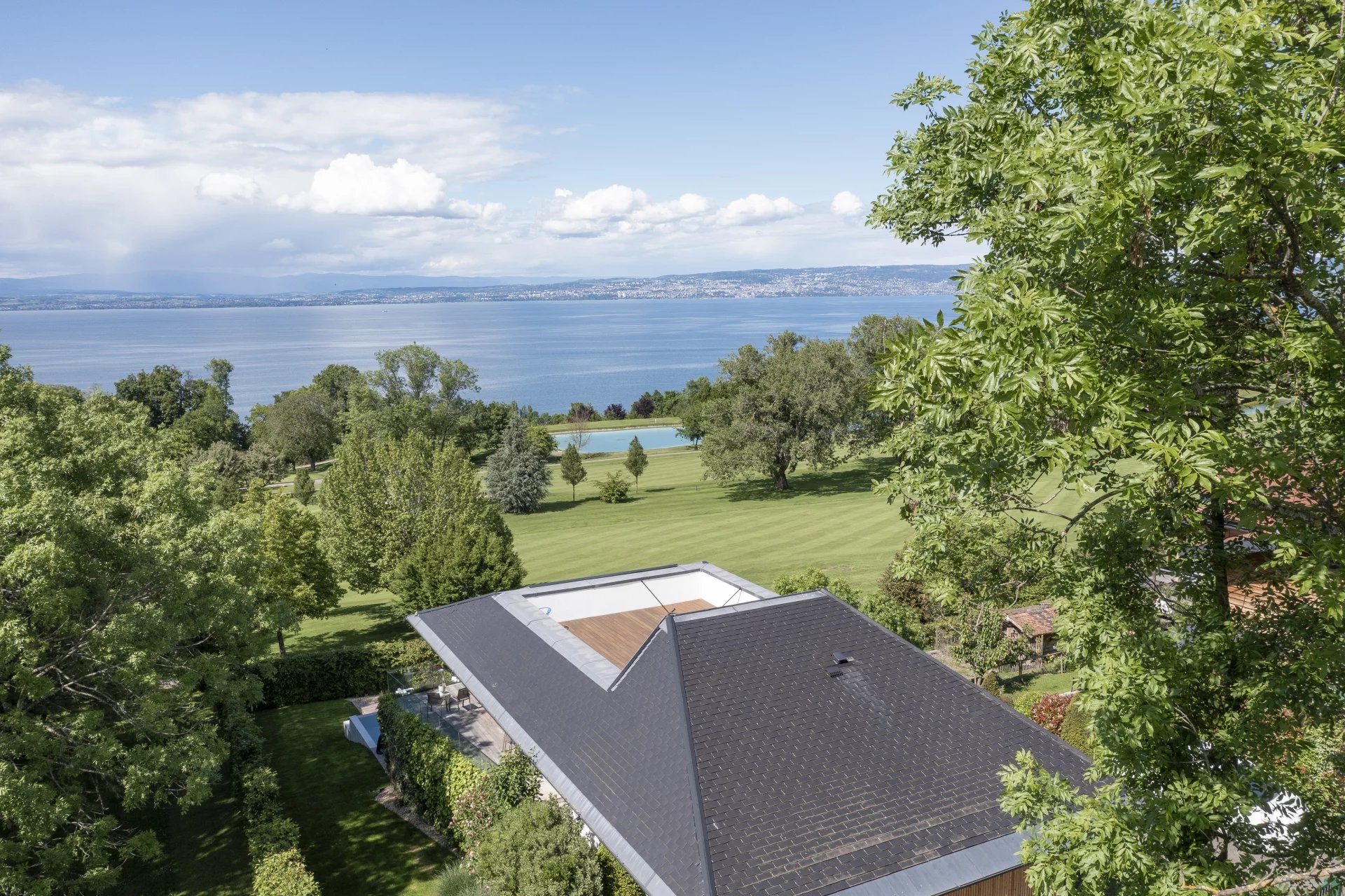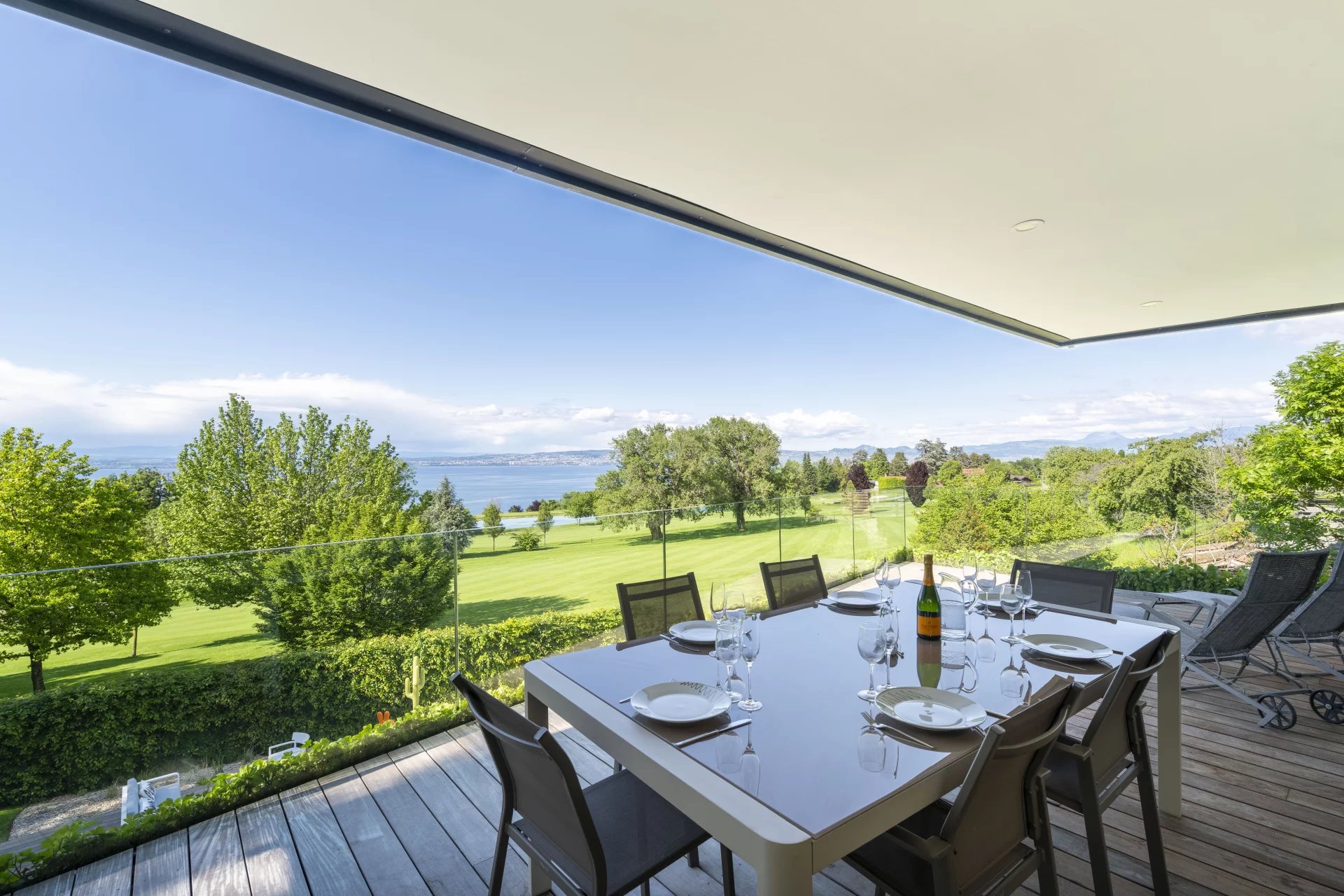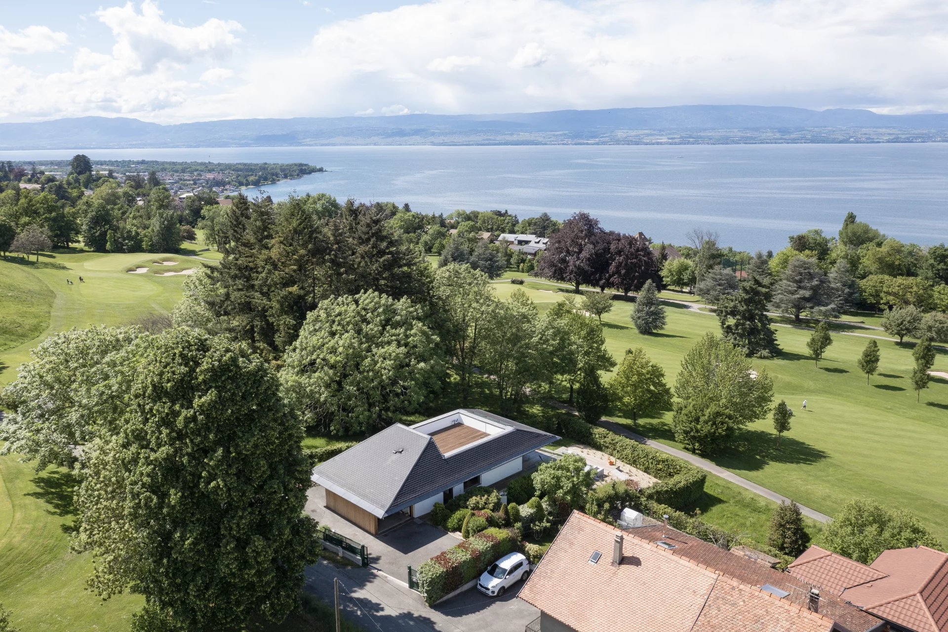 Nichée au cœur du prestigieux parcours international du golf Evian Masters, cette villa d’architecte de 210 m² habitables conjugue élégance, confort et technologie de pointe. Elle se compose de quatre chambres, dont trois magnifiques suites, et d’un vaste séjour baigné de lumière naturelle, offrant une vue panoramique à 180° sur le lac Léman, les montagnes suisses et les greens environnants. Chaque détail a été soigneusement pensé : matériaux haut de gamme, finitions raffinées, et équipements modernes. La villa bénéficie d’un système domotique, de la climatisation, ainsi que d’un adoucisseur d’eau. Les larges baies vitrées en aluminium à double vitrage assurent une isolation optimale tout en laissant entrer la lumière. À l’extérieur, profitez d’un cadre verdoyant et paisible autour d’une superbe piscine à débordement chauffée, d’un toit-terrasse avec cuisine d’été, d’un espace barbecue, et d’un éclairage extérieur. La propriété dispose également d’une salle de cinéma, d’un local pour chariots de golf, d’un double garage et de quatre places de stationnement. Un terminal pour véhicule électrique, un accès PMR (personne à mobilité réduite), ainsi qu’un système de sécurité complet (alarme, digicode, porte blindée) viennent compléter ce bien d’exception. Le tout est implanté sur un terrain clos, paysagé et entièrement sécurisé. Dossier complet disponible sur demande.