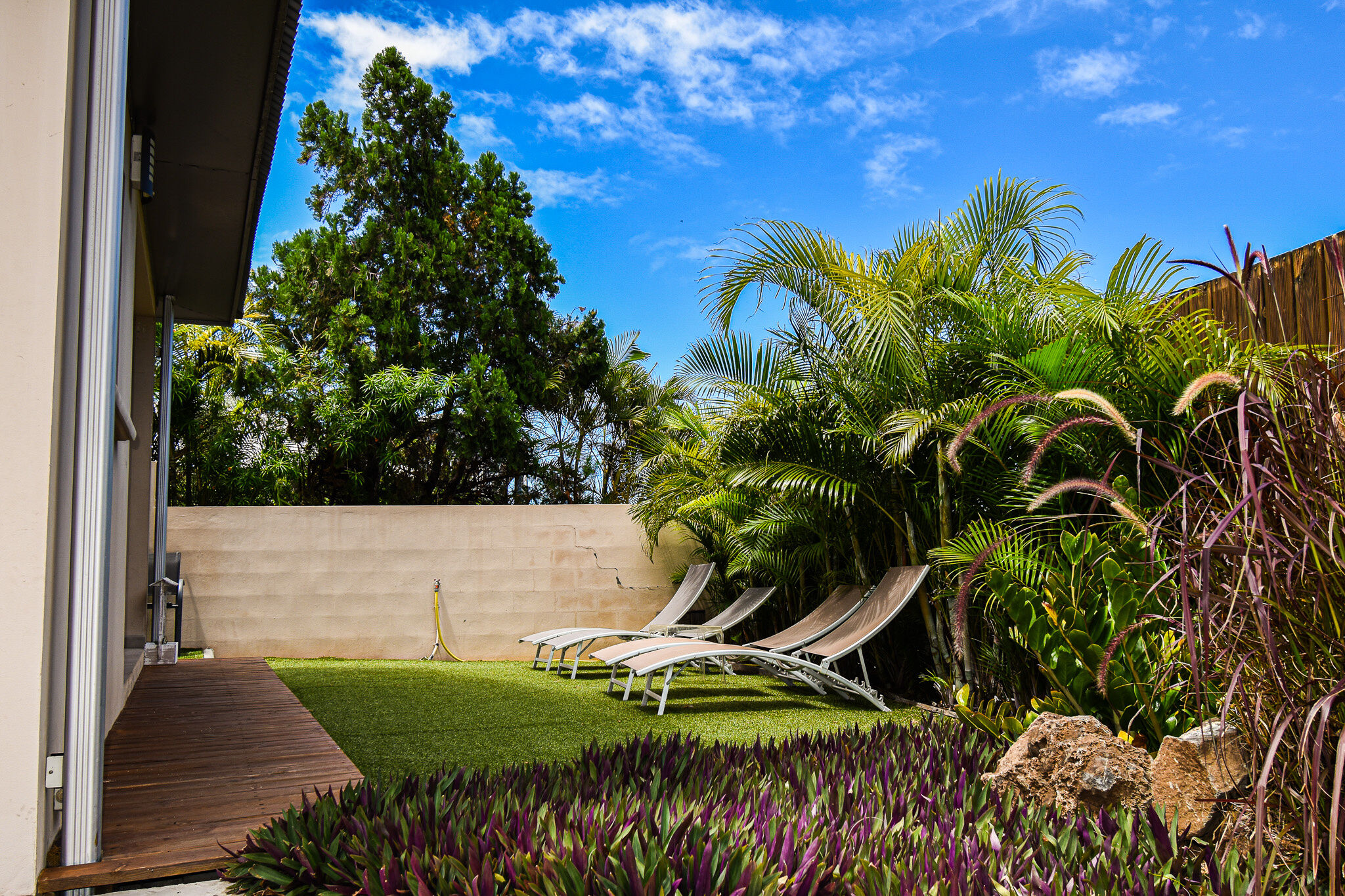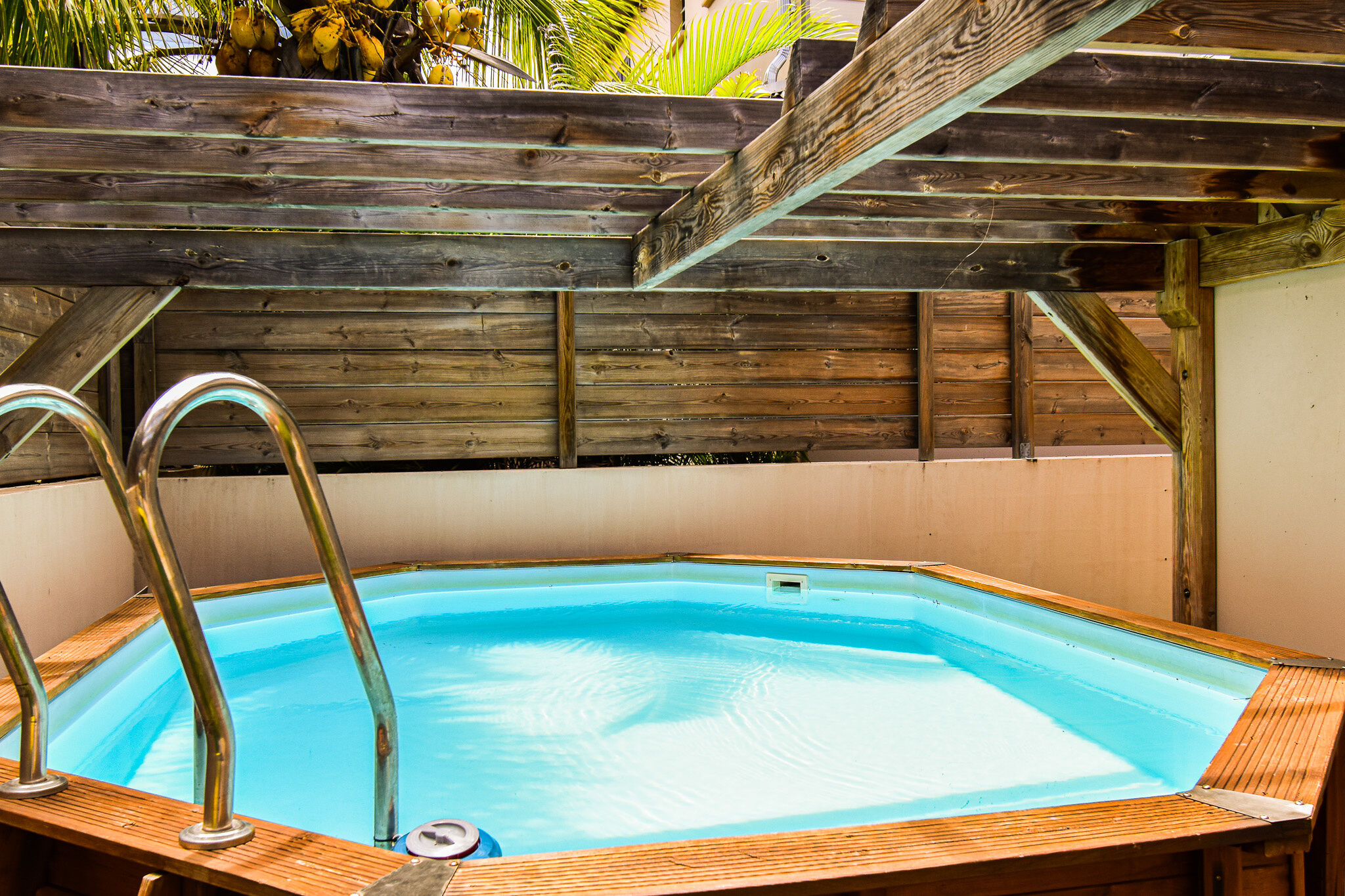 Extérieur propice à la détente : Une varangue spacieuse, une piscine hors-sol avec son espace solarium et transats pour profiter du climat balnéaire.
