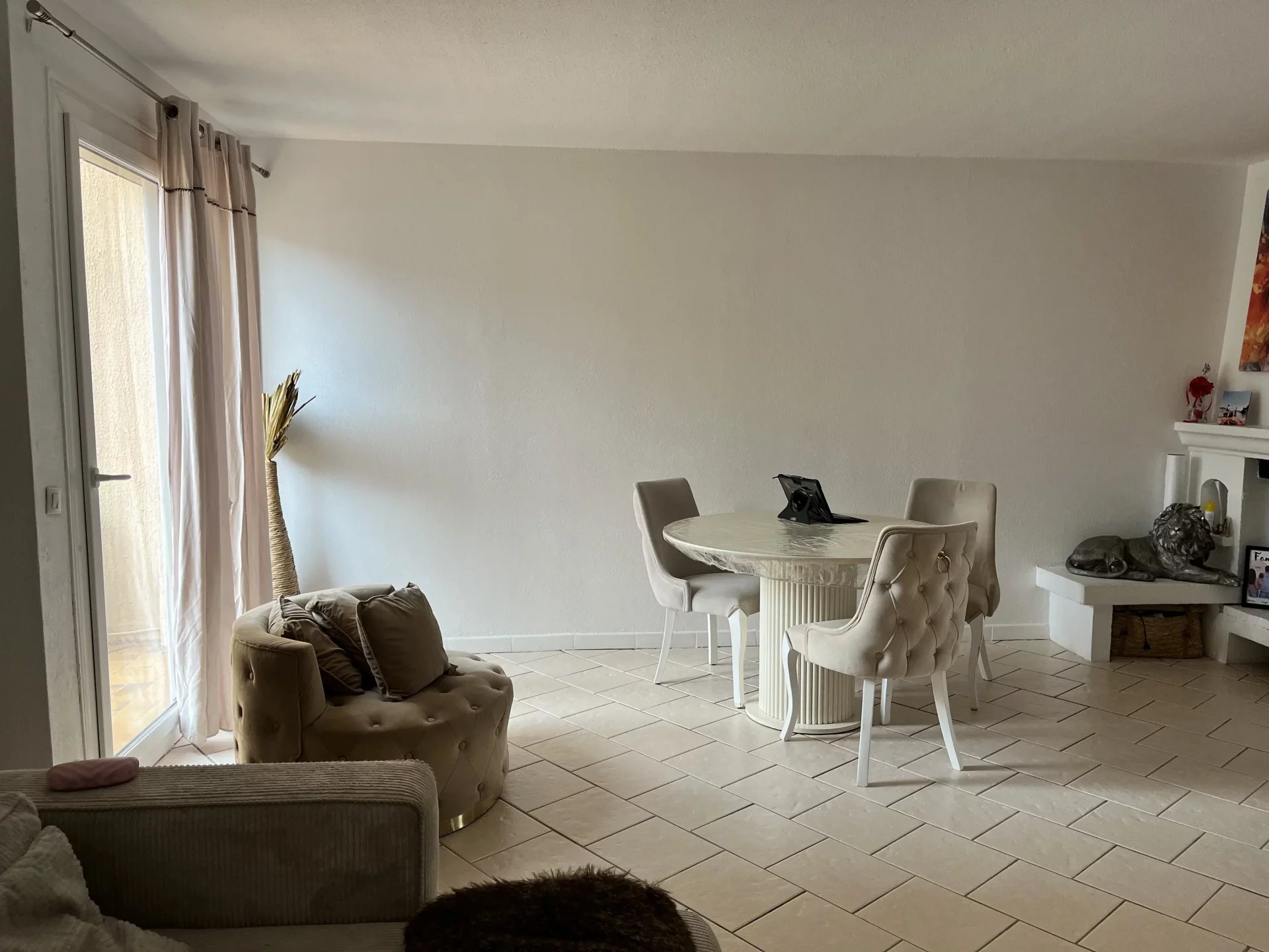 Dès l'entrée, on découvre une pièce de vie lumineuse aux volumes confortables, où le salon et la salle à manger cohabitent harmonieusement. L'espace est baigné de lumière naturelle grâce à une large ouverture sur l'extérieur, et la présence d'une cheminée apporte une vraie touche conviviale, idéale pour les soirées d'hiver.