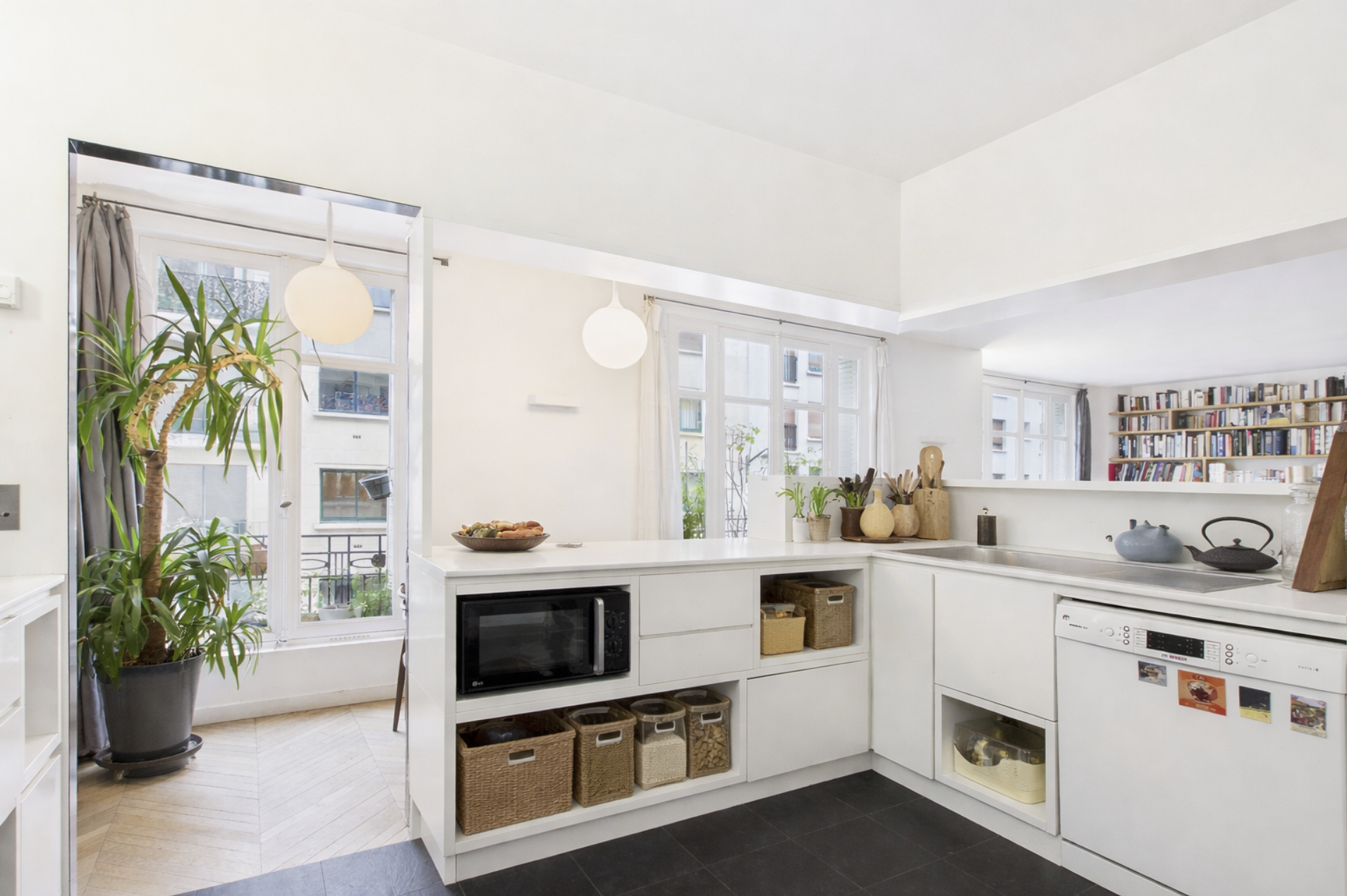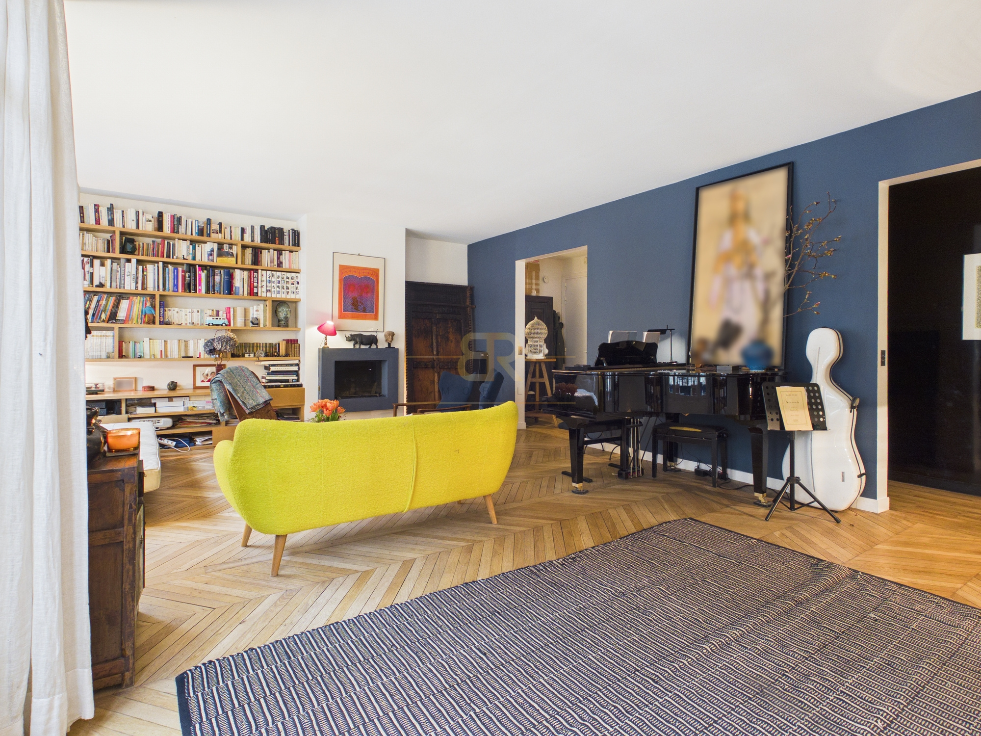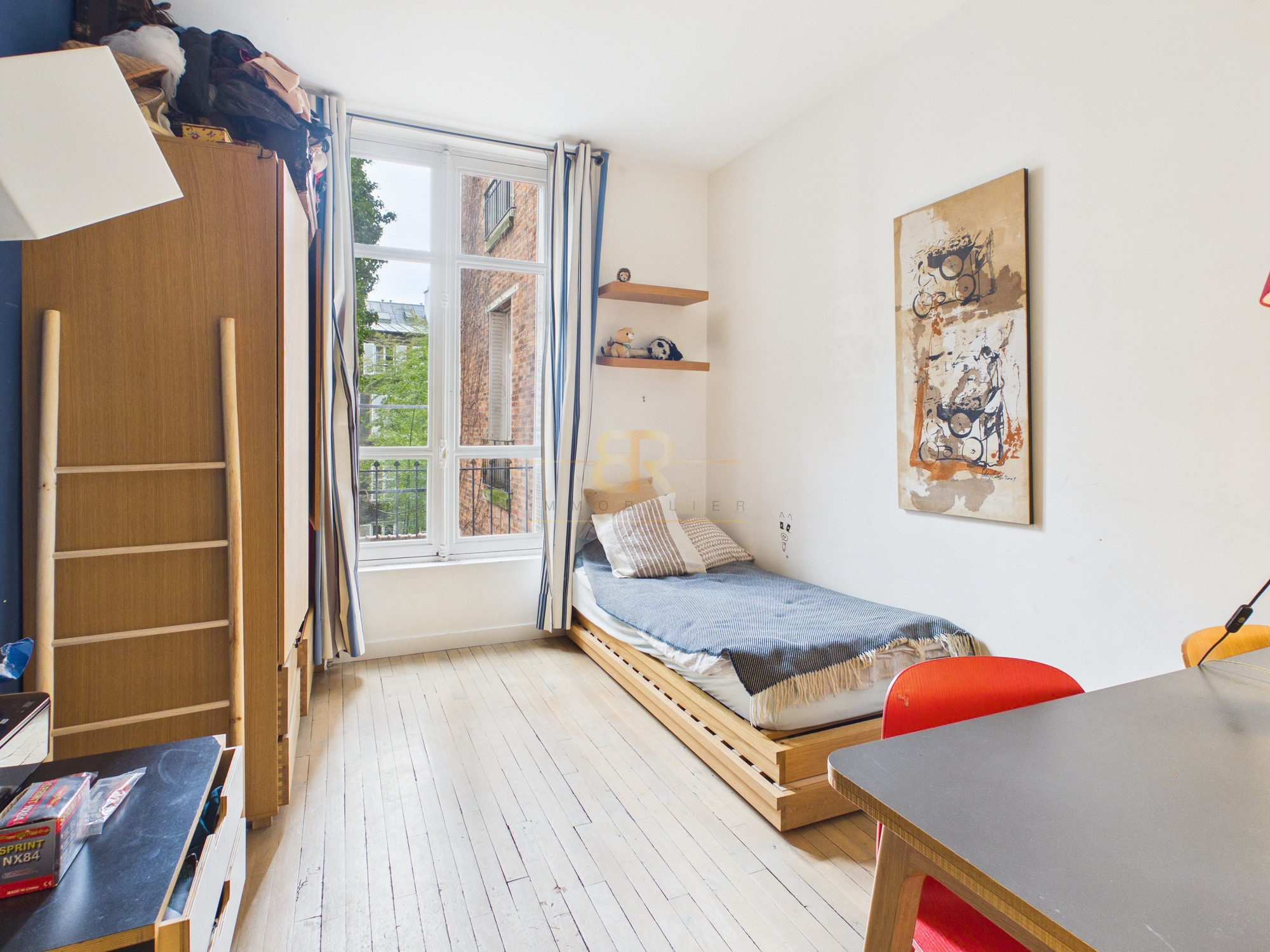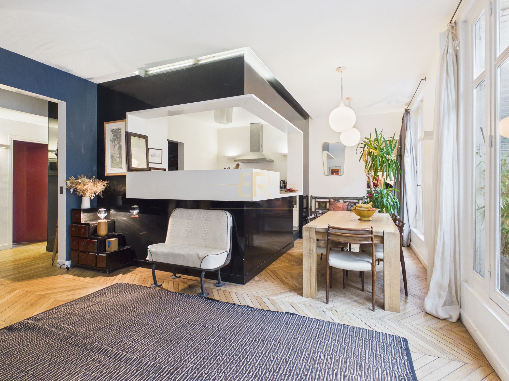 Traversant et exposé sud-ouest côté séjour, l'appartement offre une distribution familiale et fonctionnelle. Il comprend un double séjour de 46m2 avec bow-window sur rue, une cuisine américaine avec cellier, ainsi qu'une ancienne cuisine aménagée en pièce de rangement.