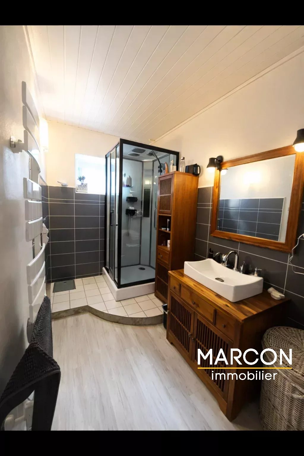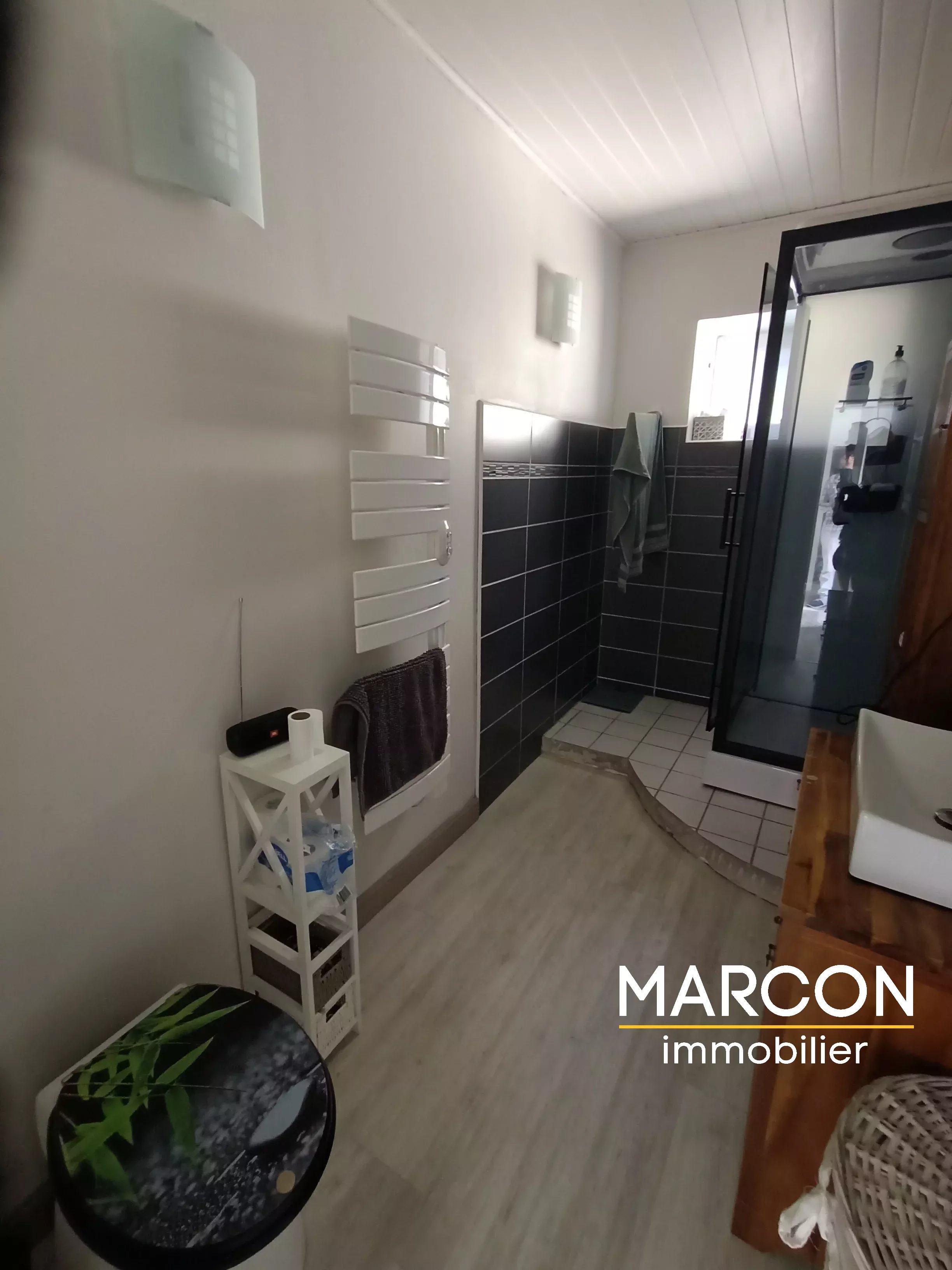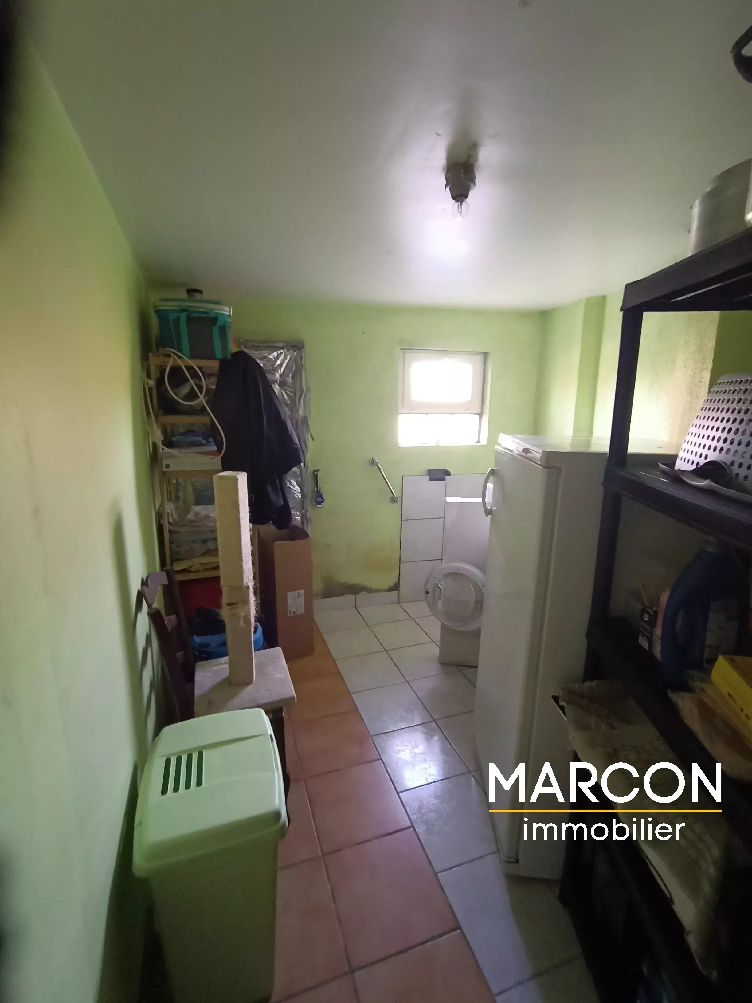 Très lumineuse elle comprenant au rez de chaussée: un vaste salon salle à manger avec insert à bois, une cuisine équipée, un cellier, une buanderie avec wc.