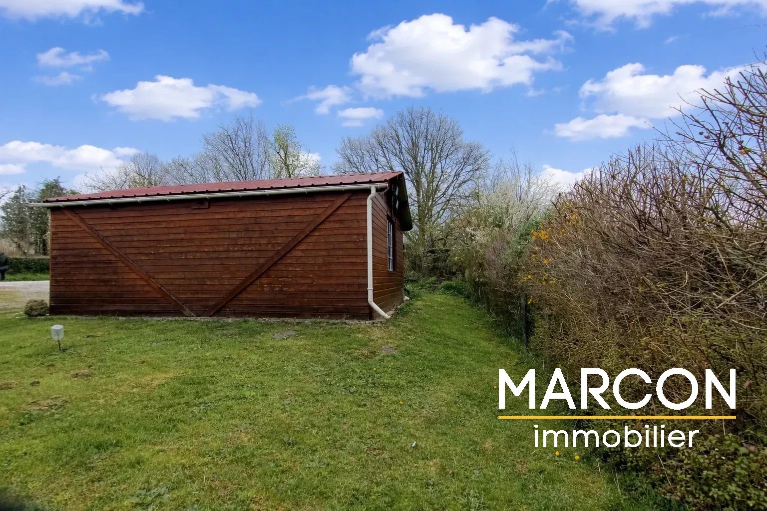 Jardin en face de la maison d'une superficie de 232m² avec un grand chalet en bois et un car port.