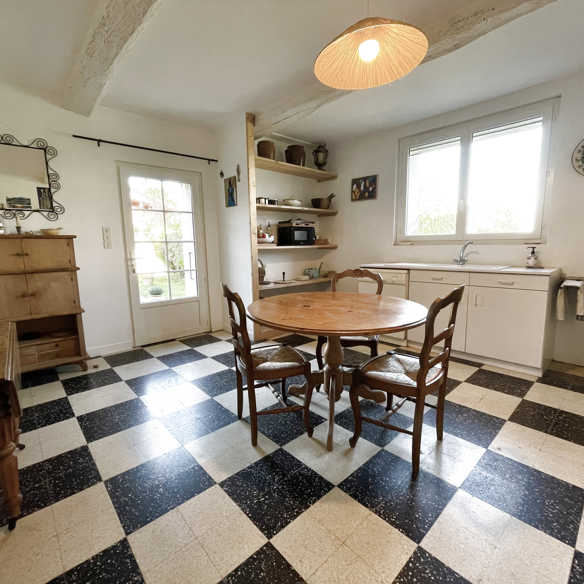 à droite, une cuisine (21m2) ouvrant elle aussi sur l'extérieur.