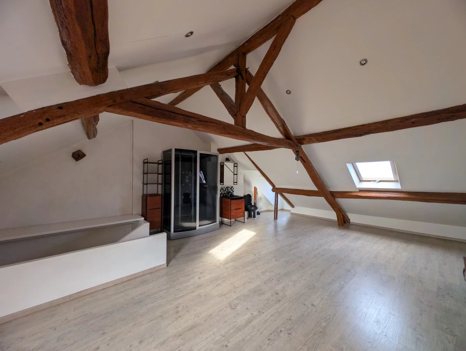 Au deuxième étage, les combles ont été aménagés pour accueillir une troisième suite parentale avec salle d’eau et toilettes, constituant un espace indépendant.