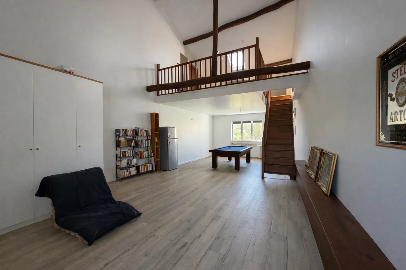 De l’autre, une superbe pièce en toit cathédrale avec mezzanine offre un volume impressionnant et une luminosité agréable, parfaite pour créer un espace détente, une salle de jeux ou un bureau.