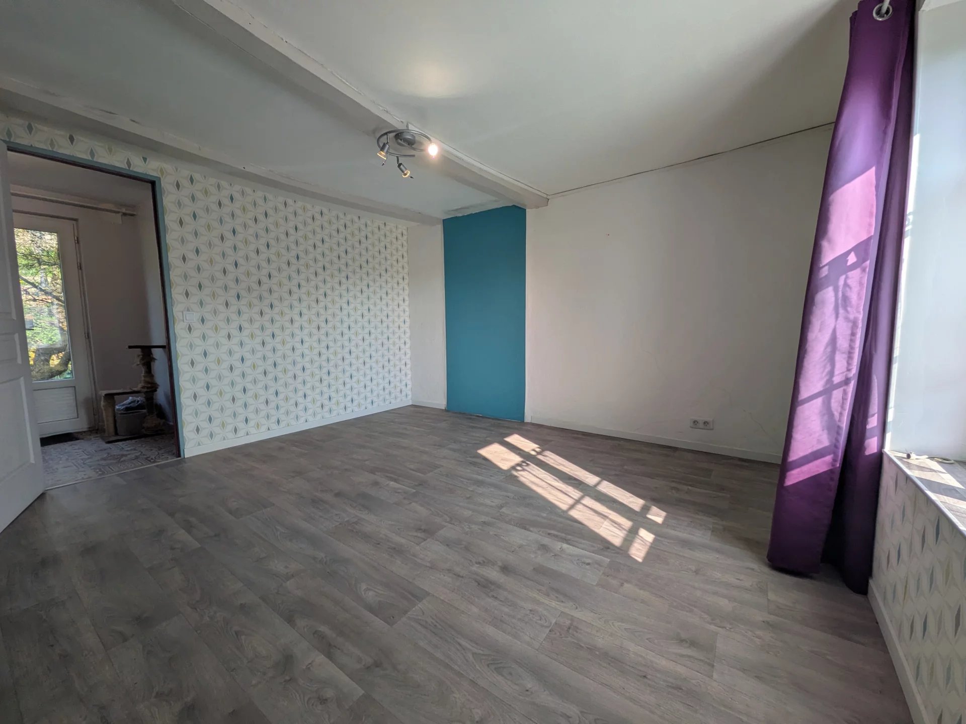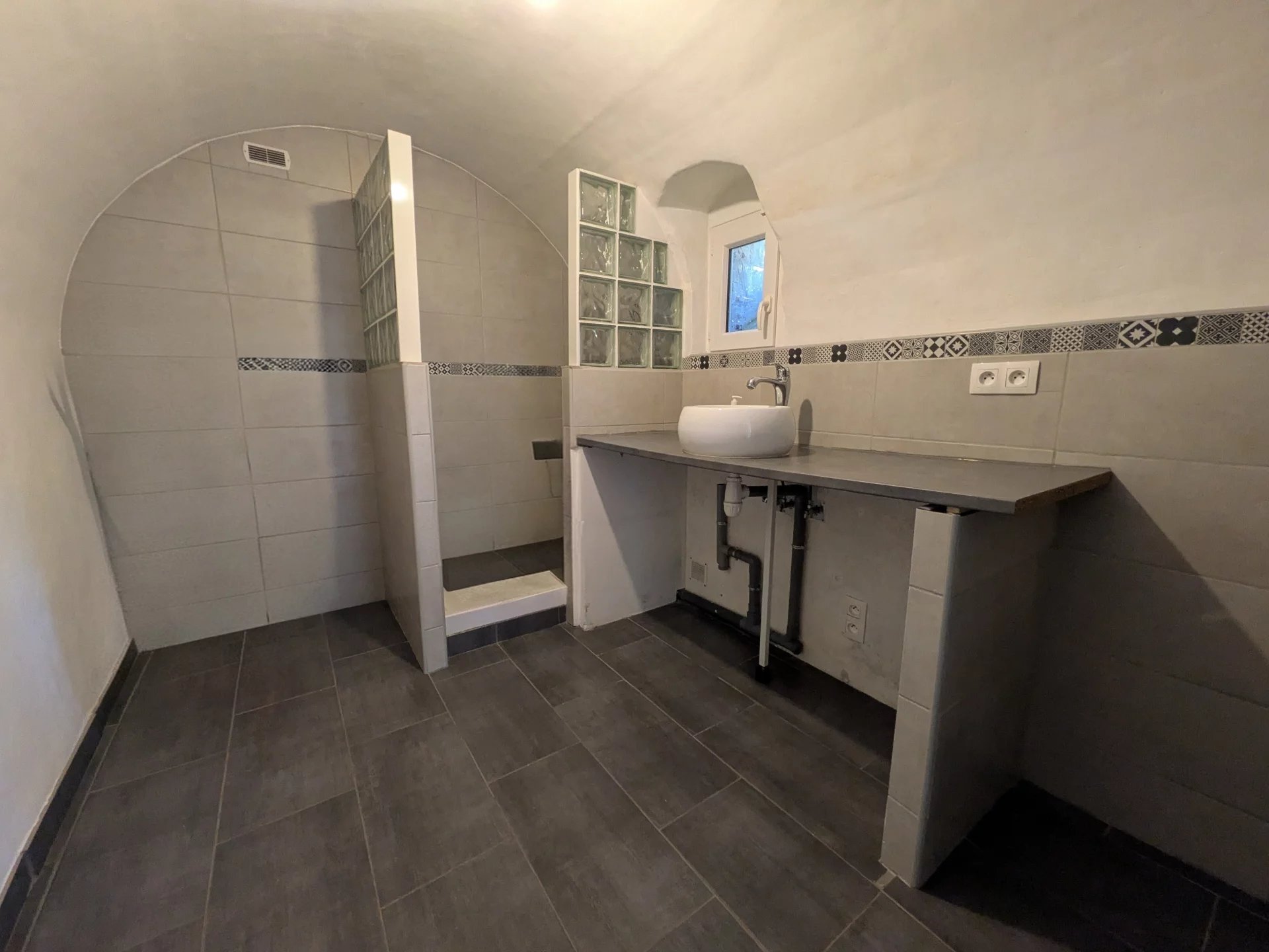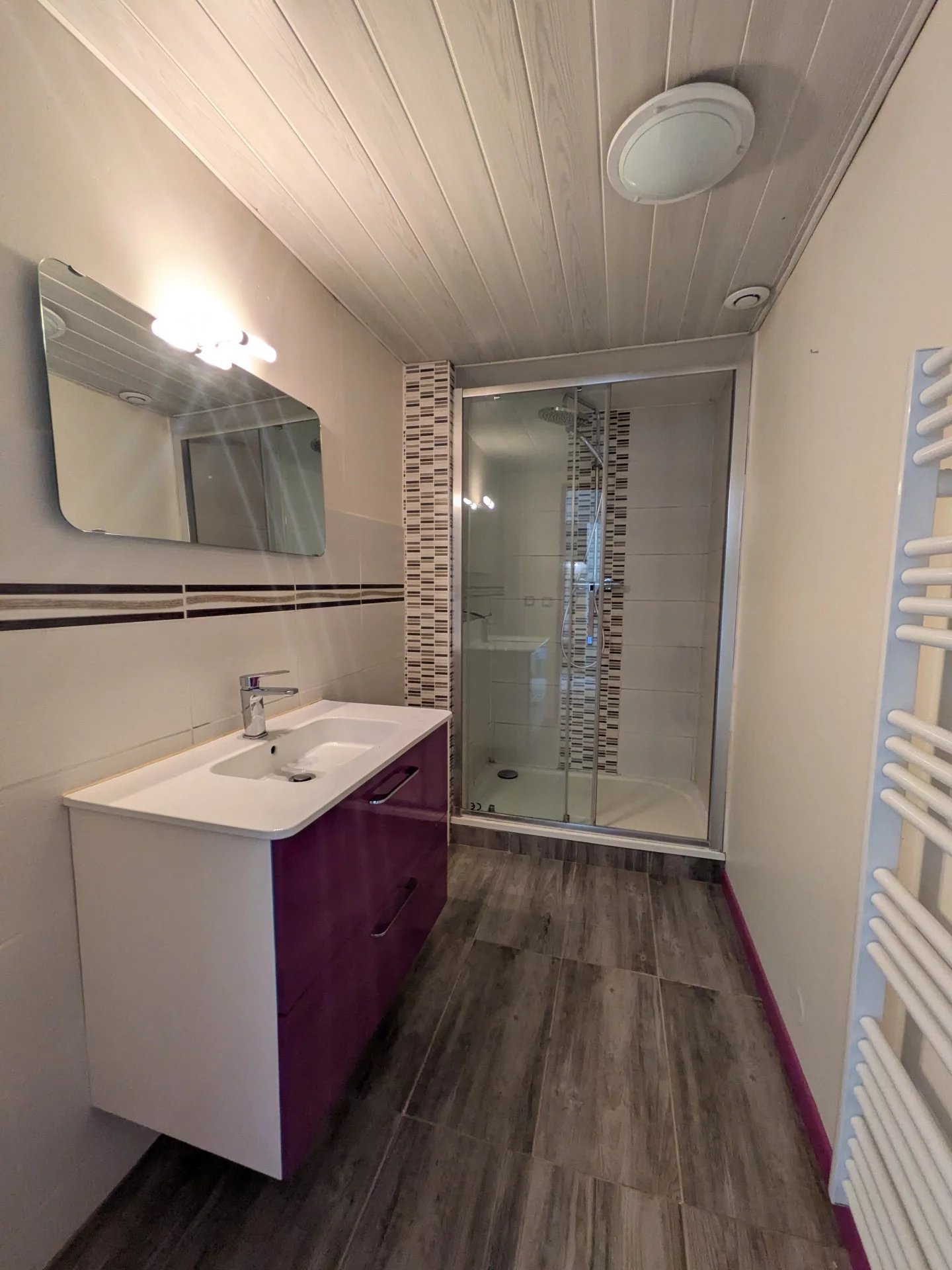 L'entrée dessert un salon séjour/salle à manger, une cuisine aménagée et équipée, un cellier et une salle de douche avec wc.