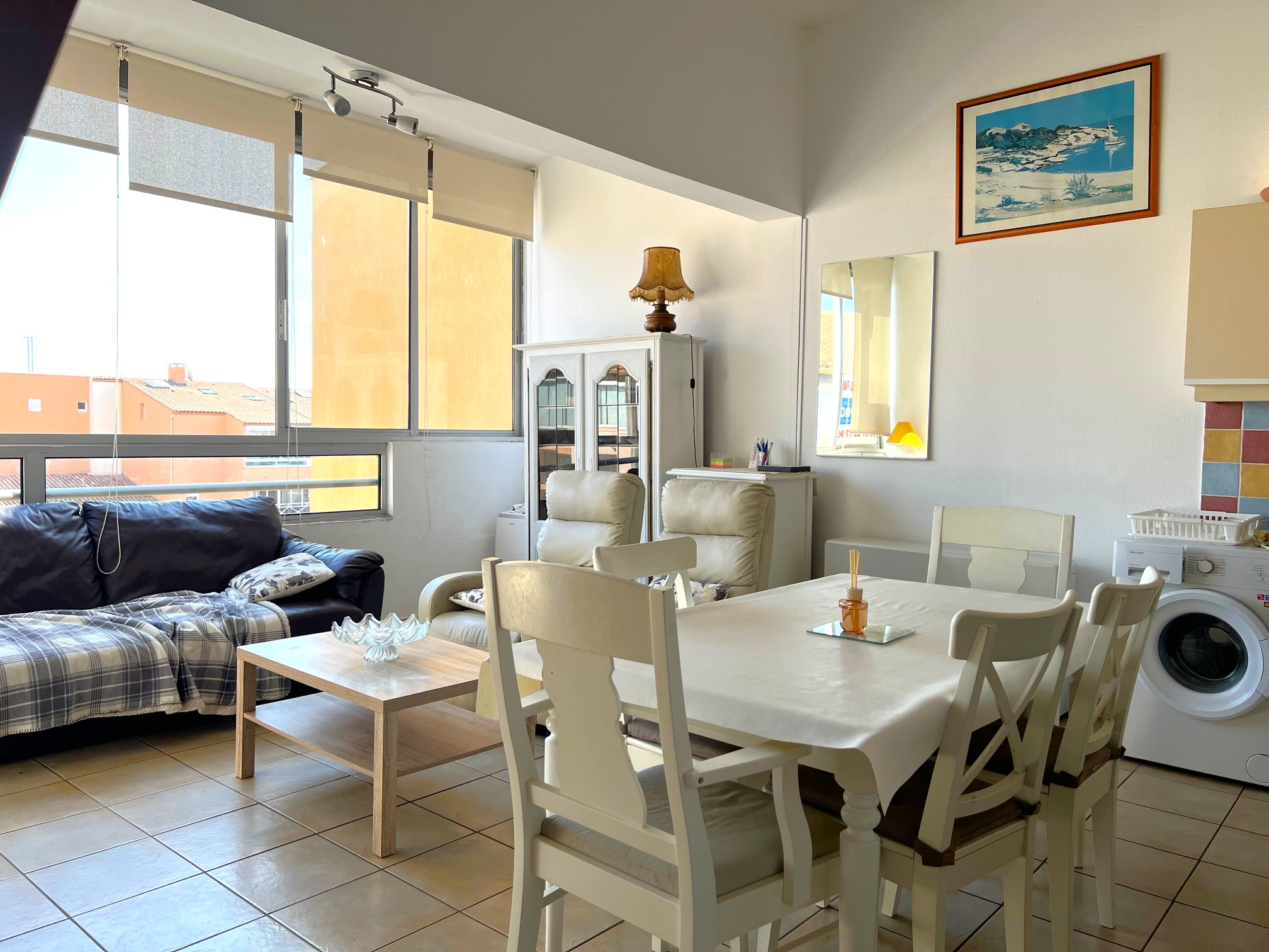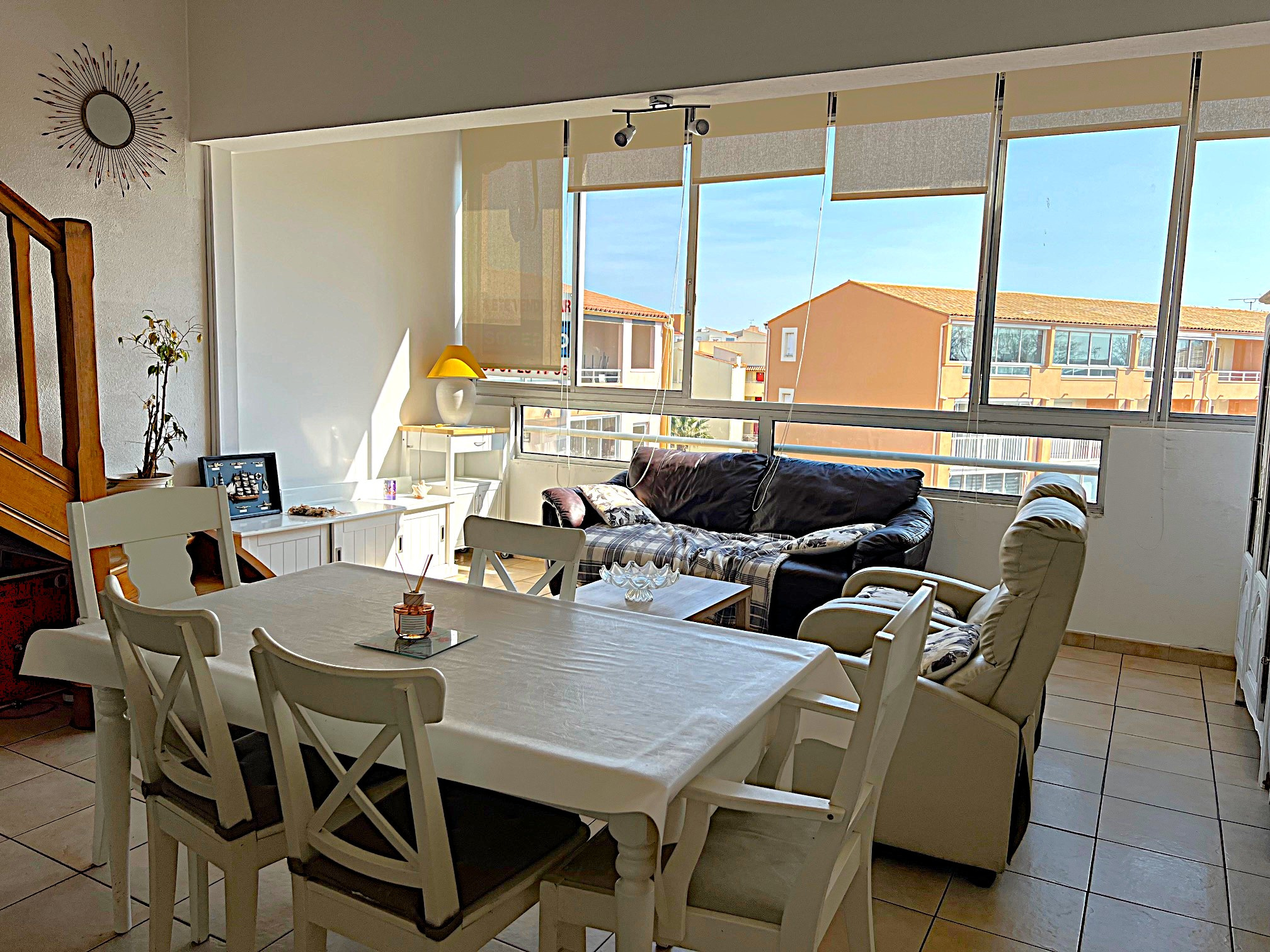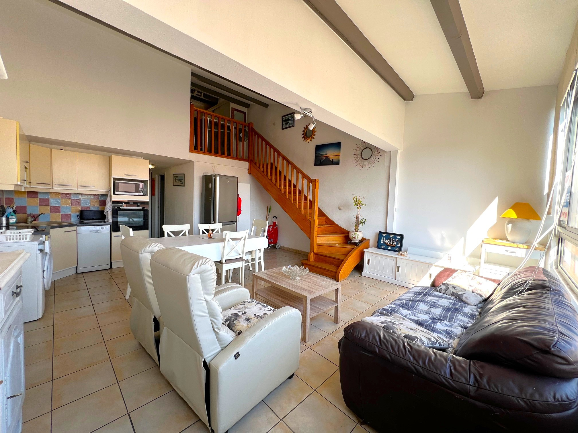Quartier Richelieu, dans une résidence sécurisée avec piscine et parking idéalement située entre plage et port, appartement meublé, lumineux exposé nord est, de 3 pièces en duplex, situé au 5ème étage avec ascenseur, composé de 2 chambres dont 1 à l'étage + coin mezzanine, salle d'eau et wc séparés, séjour, coin cuisine. Plage RIchelieu à 400 mètres.