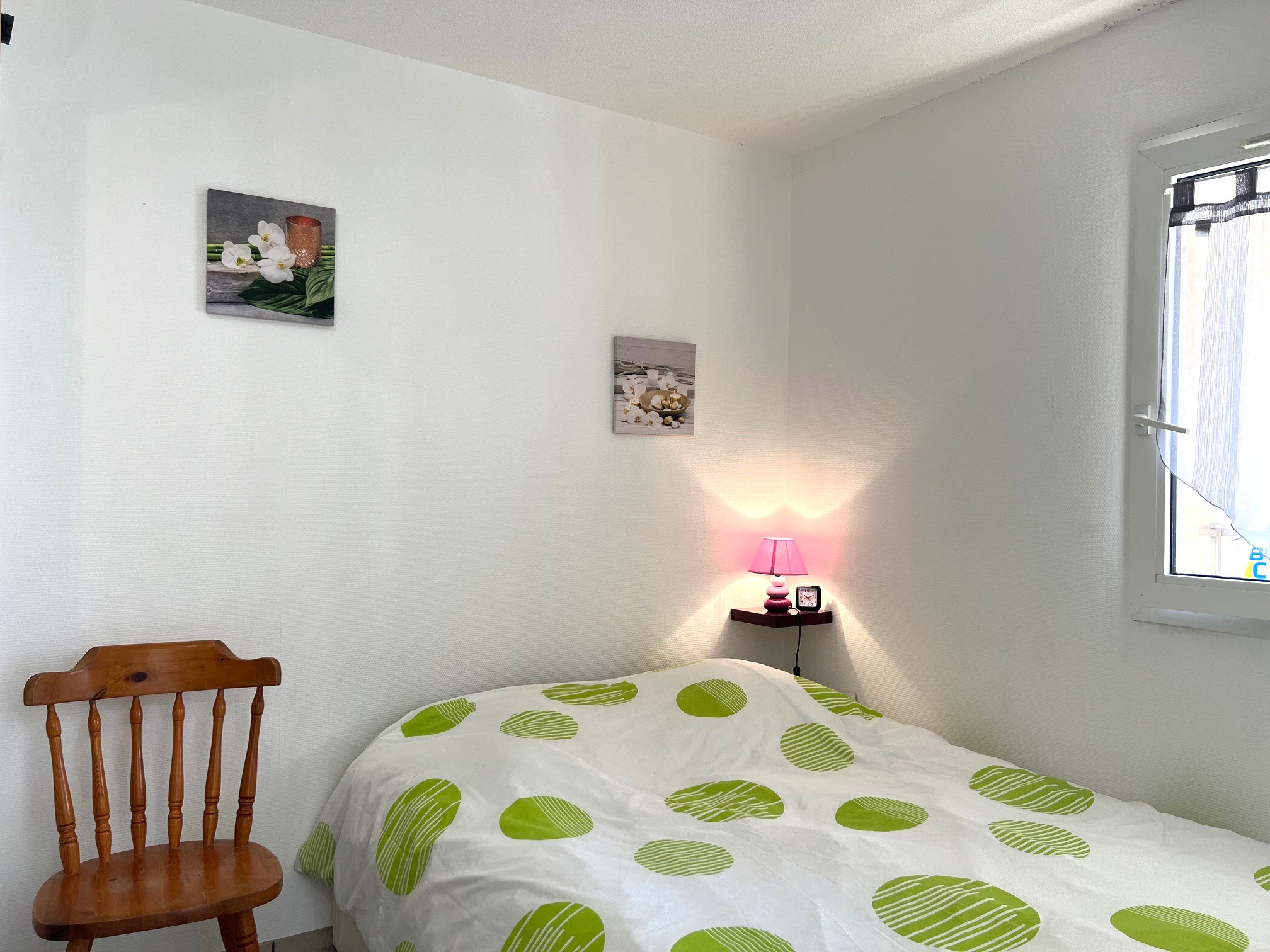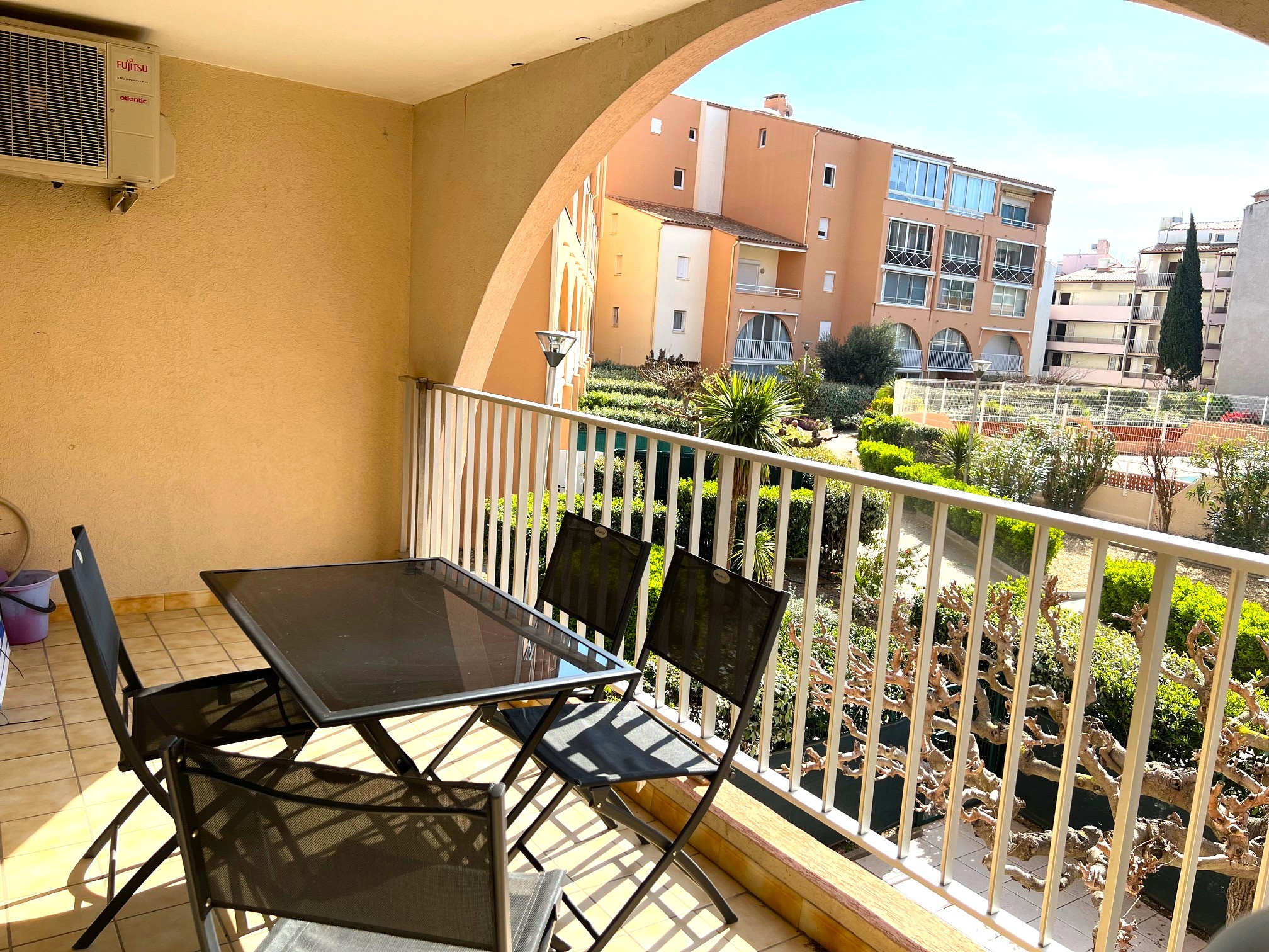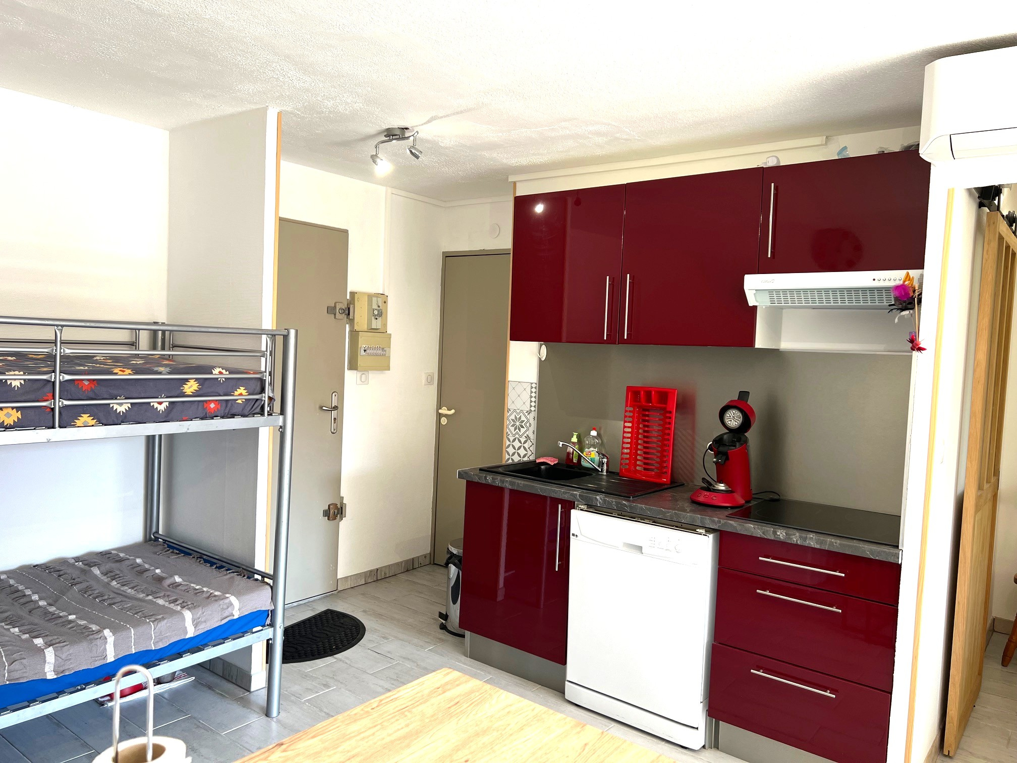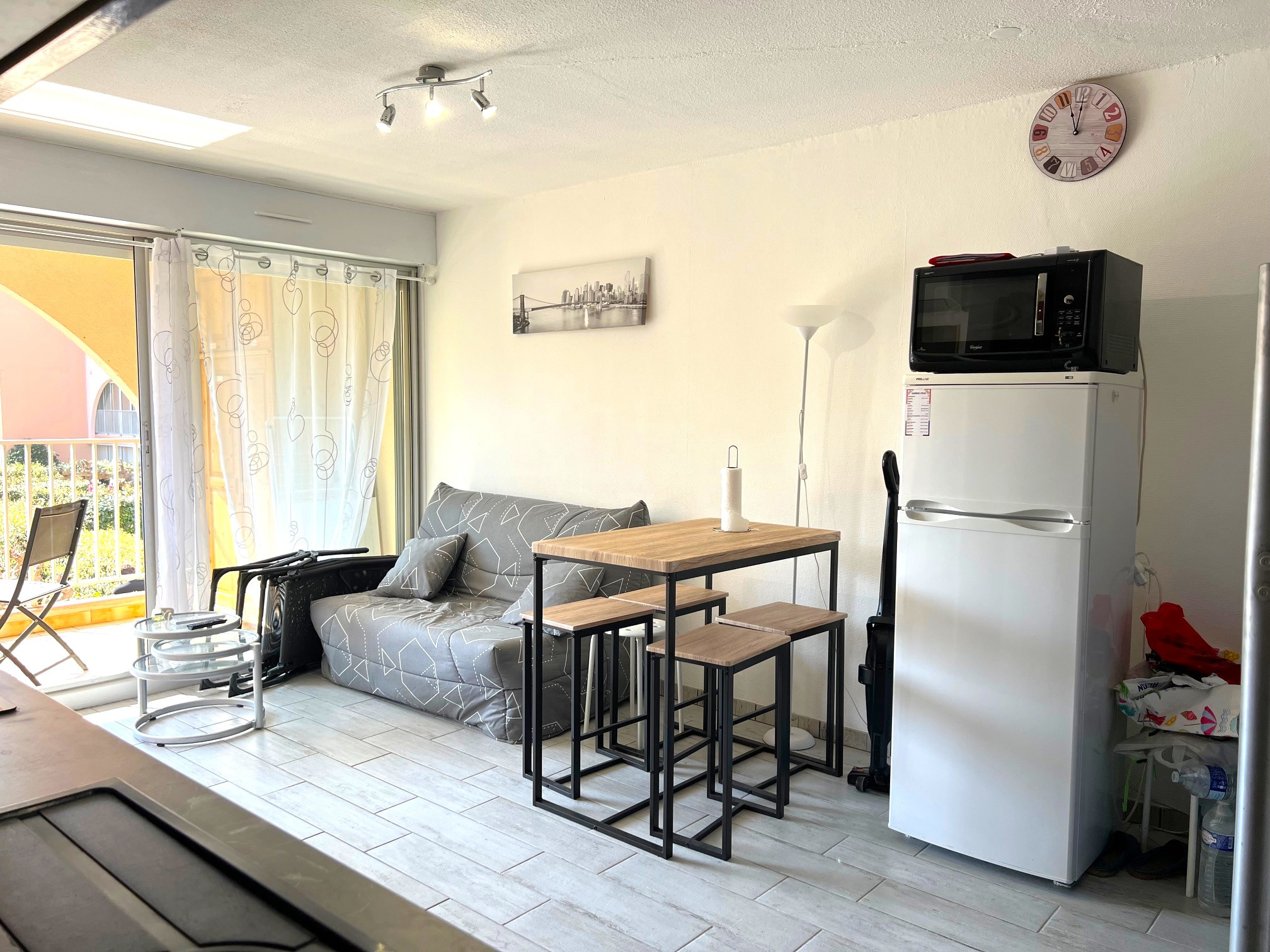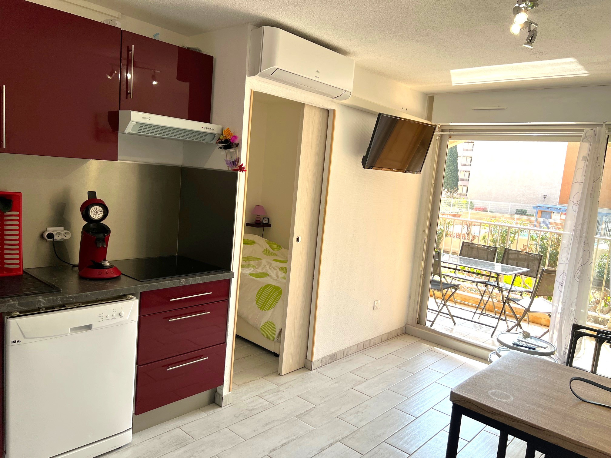 Quartier Richelieu, entre plage et port dans une résidence sécurisée avec piscine, boulodrome et parking, appartement 2 pièces cabine de 27 m2, rénové, très bel ensoleillement, vue dégagée sur les jardins et la pisicne, situé au 1er étage avec ascenseur, composé d'une chambre, d'une alcove avec 2 lits superposés, salle d'eau et wc séparés, séjour, coin cuisine équipé. Vendu meublé. Grand balcon côté piscine - Climatisation - Plage RIchelieu à 400 mètres. Parking commun dans la résidence.