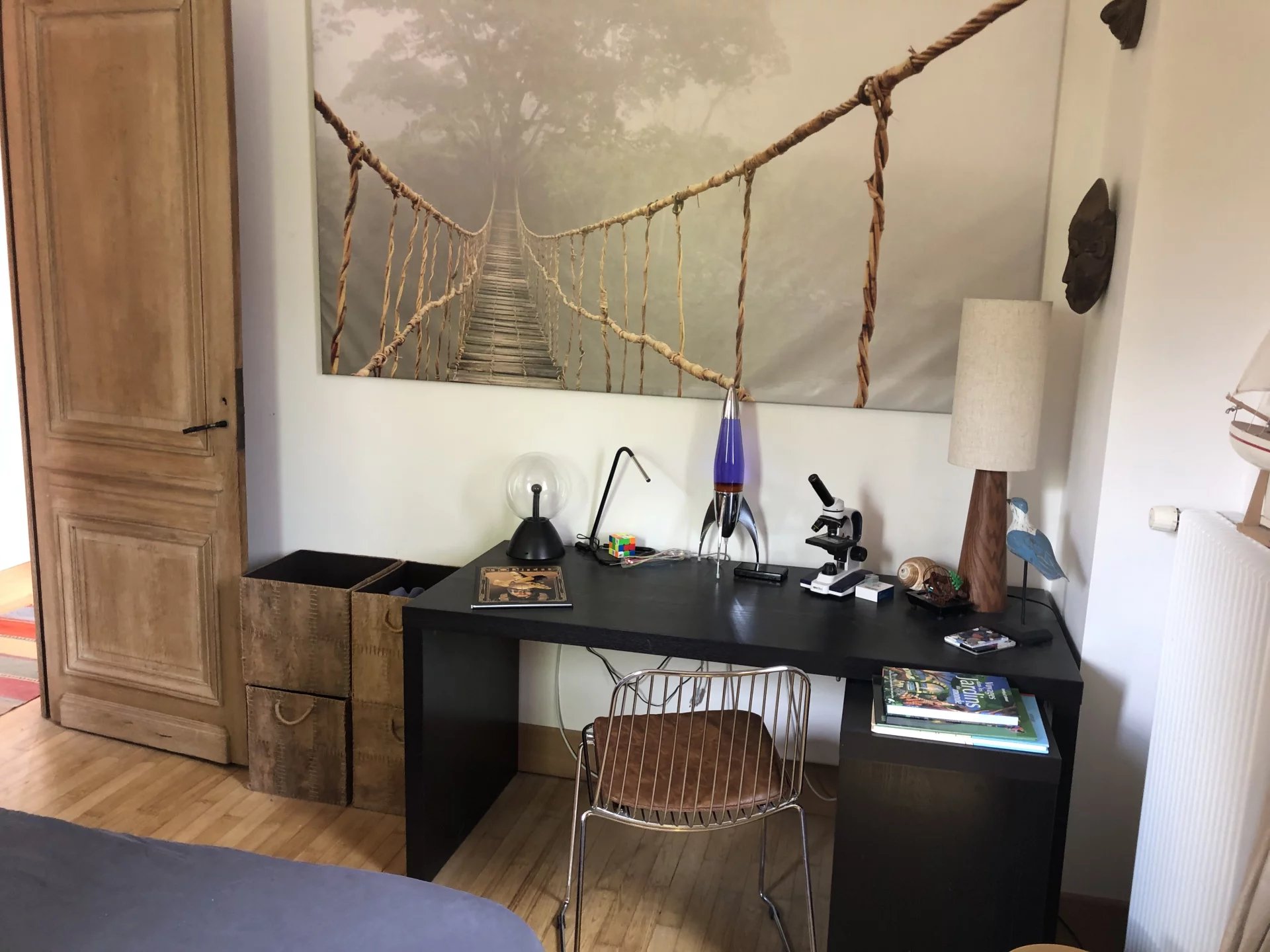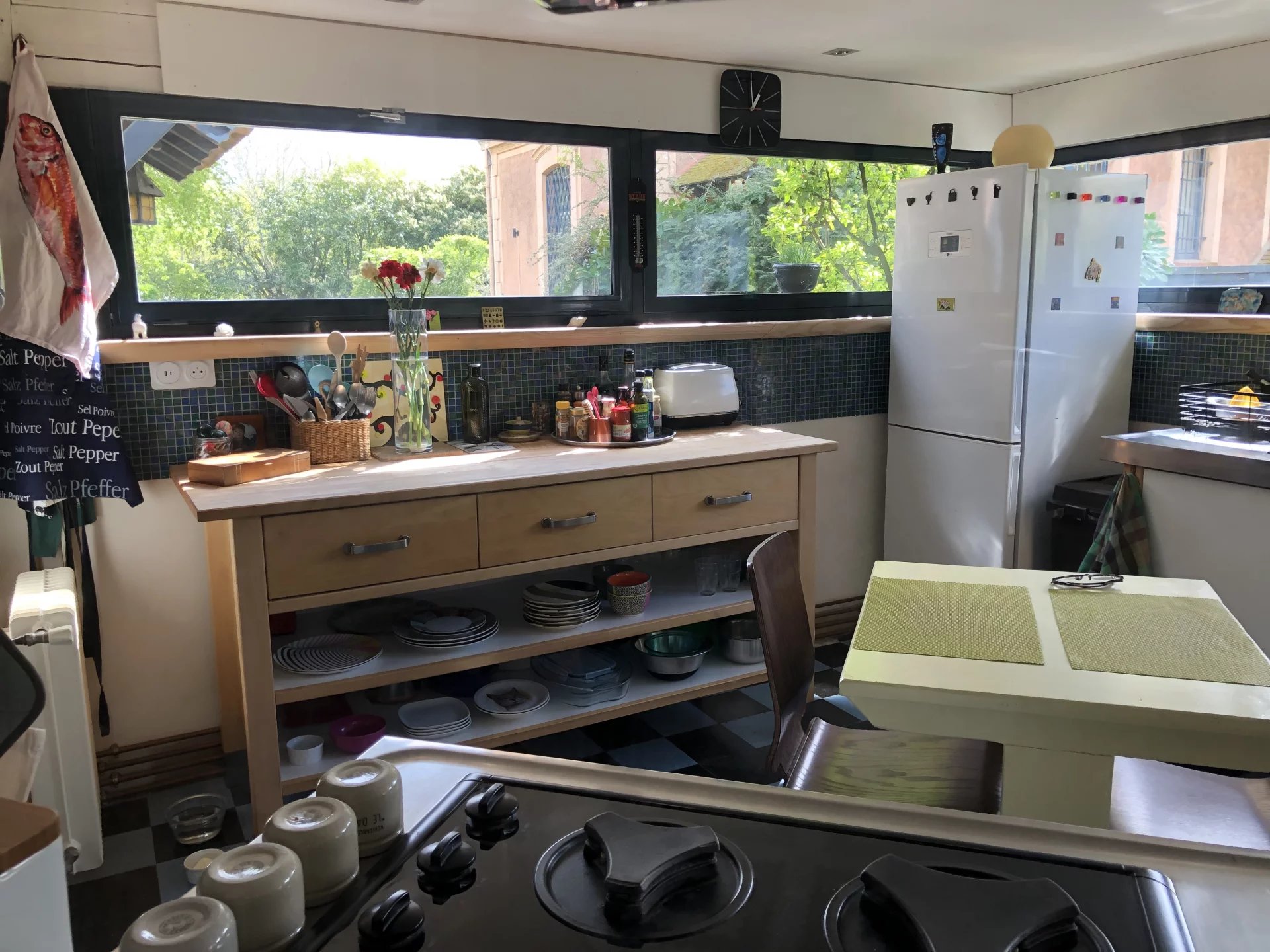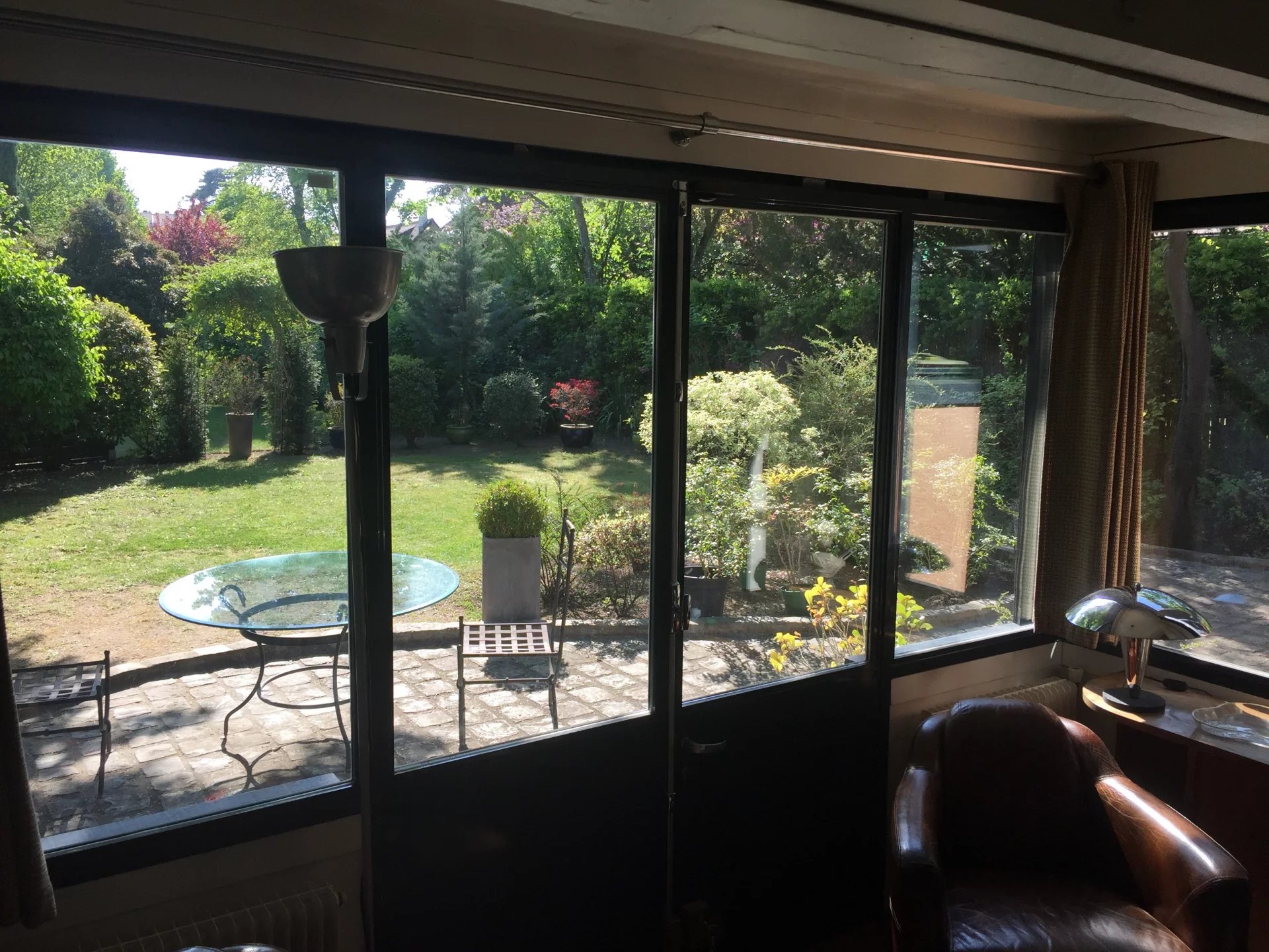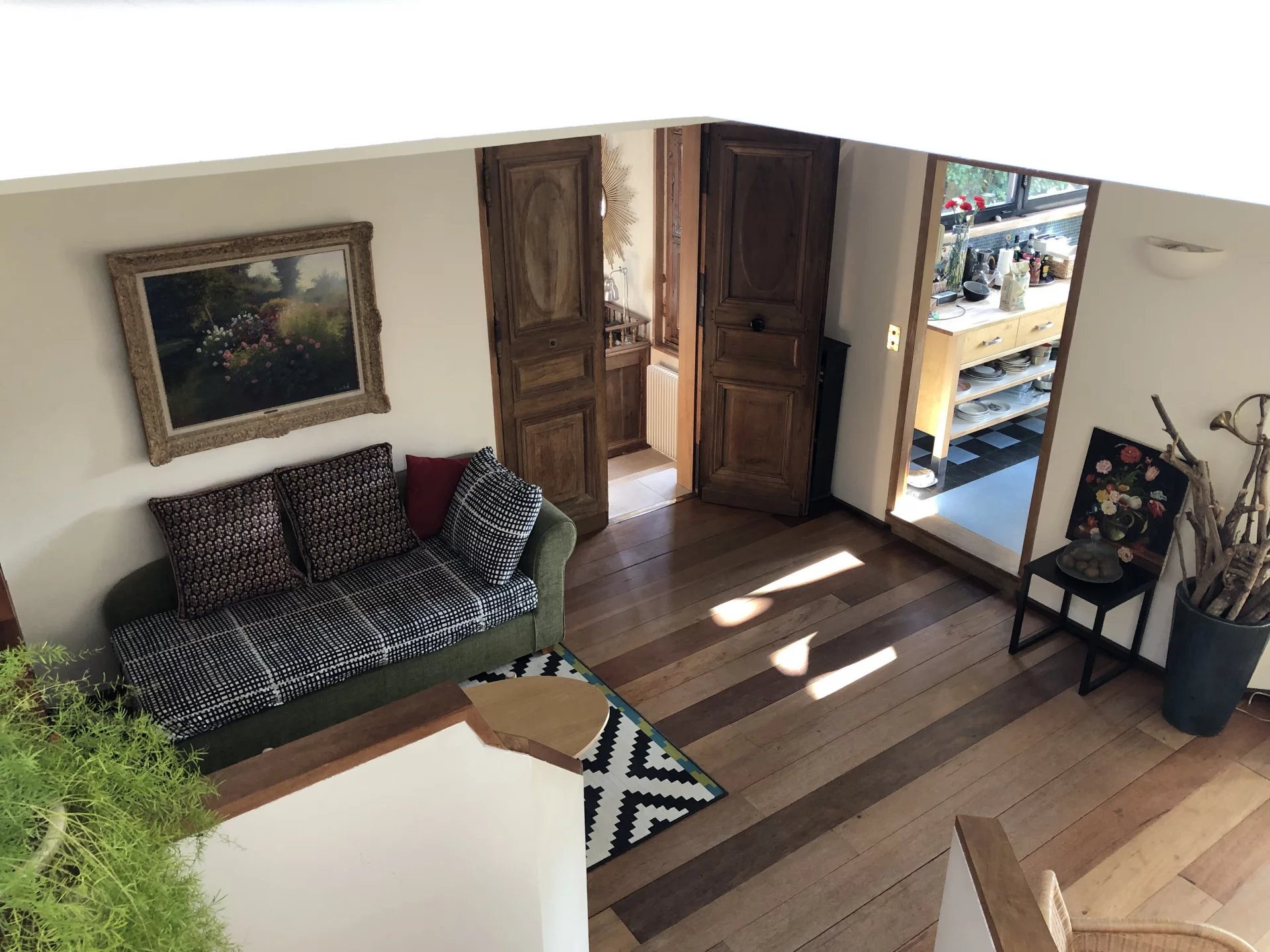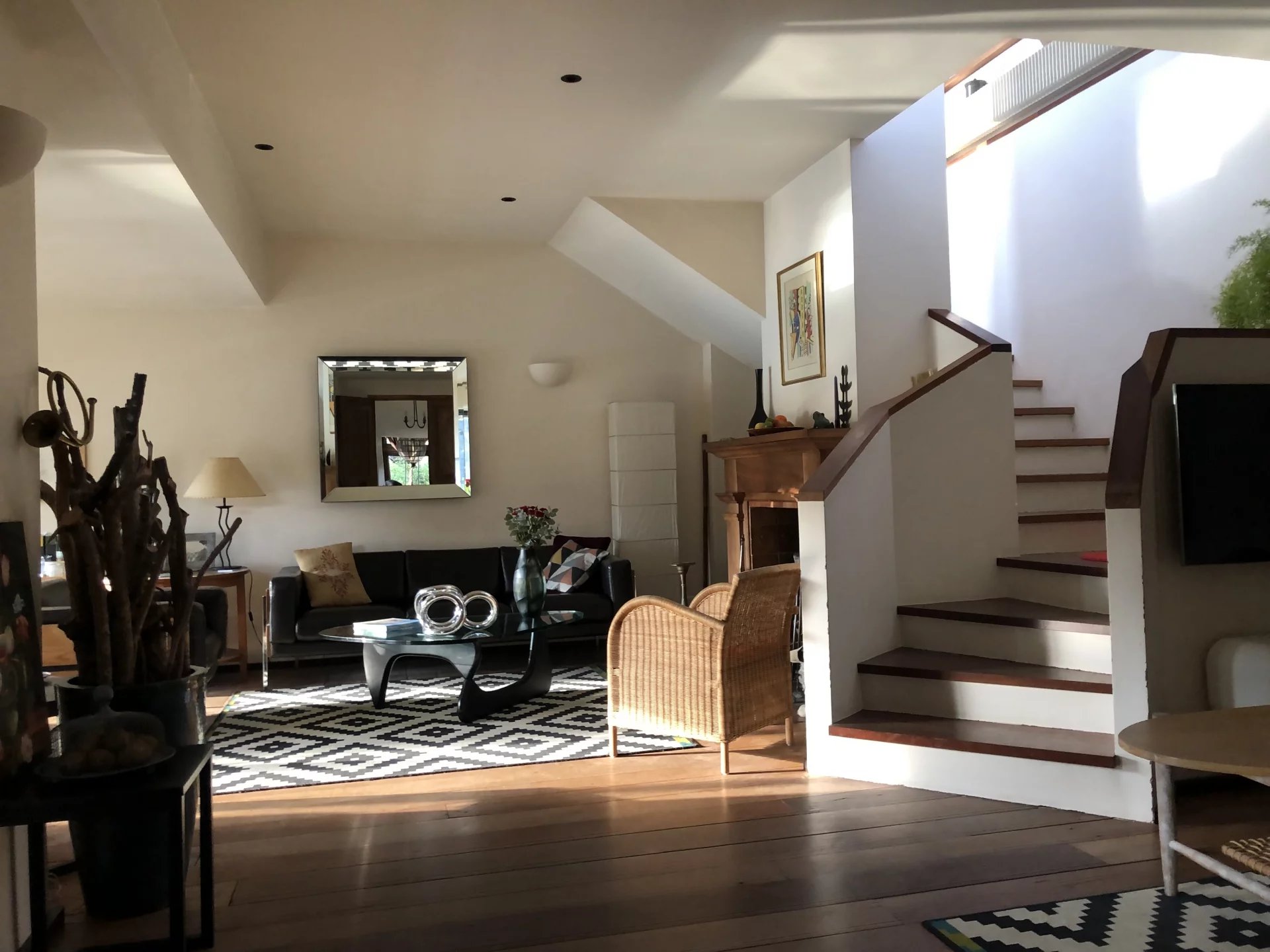 Le rez-de-chaussée accueille une entrée raffinée avec WC, un salon séjour avec une belle cheminée, un coin TV, une cuisine lumineuse donnant sur le jardin, mais aussi un espace de travail comprenant un bureau, un studio d'enregistrement et des sanitaires (entrée indépendante sur la rue).