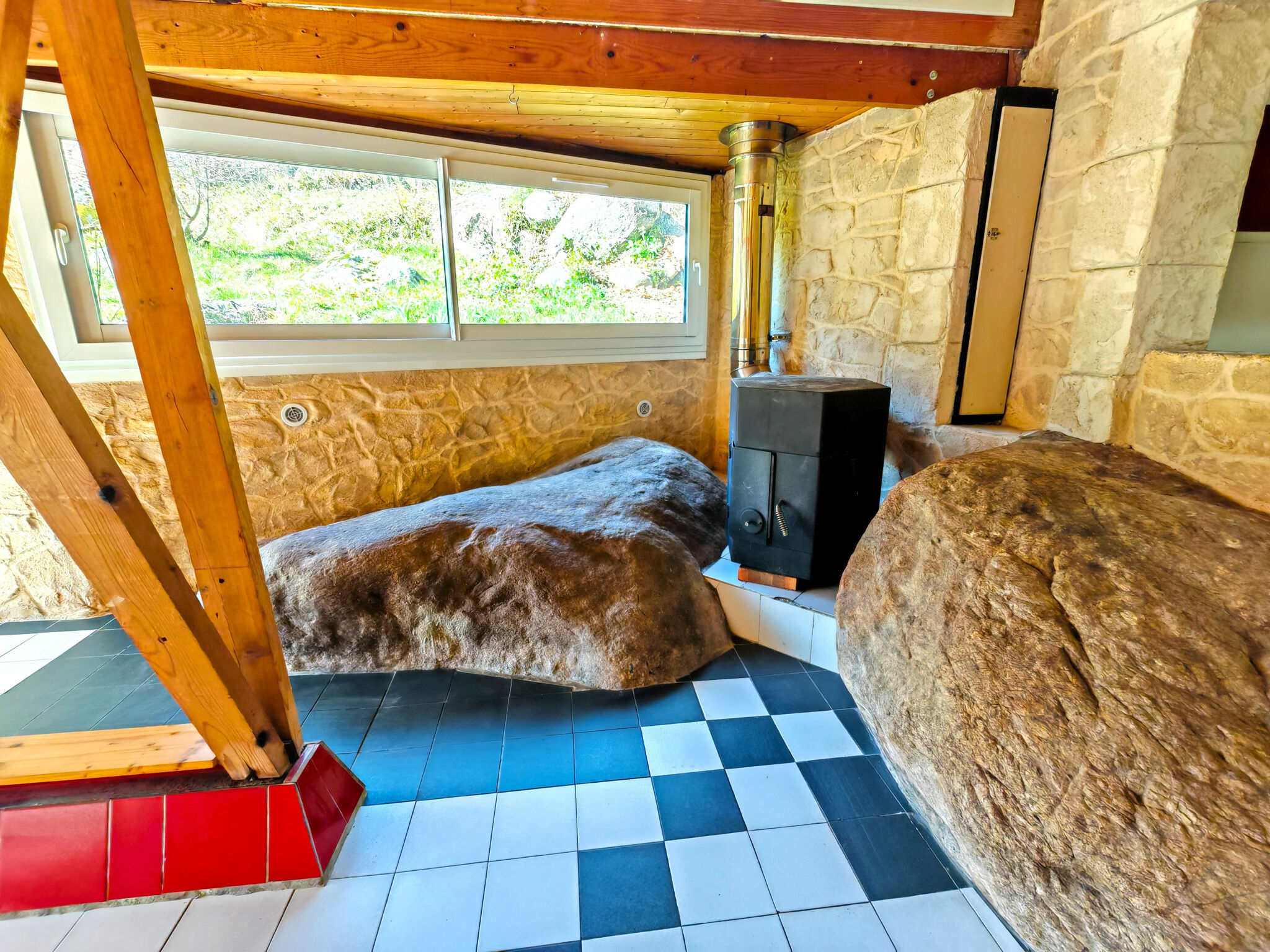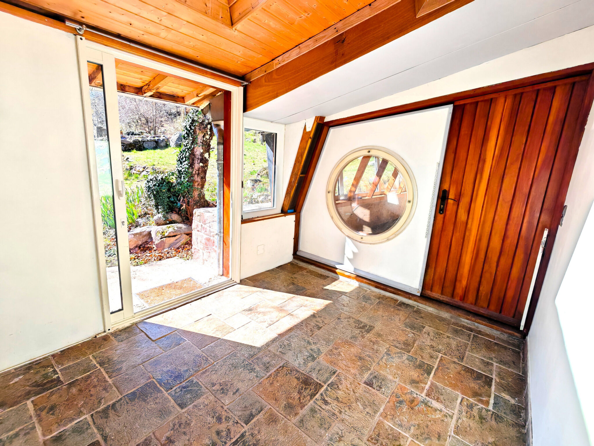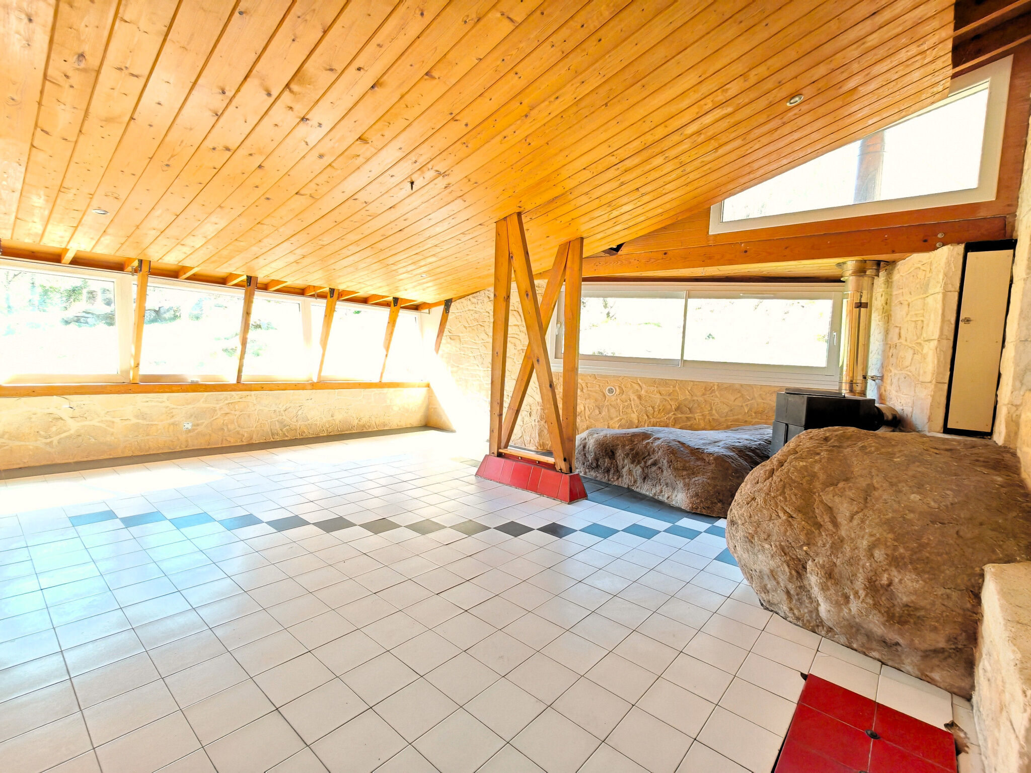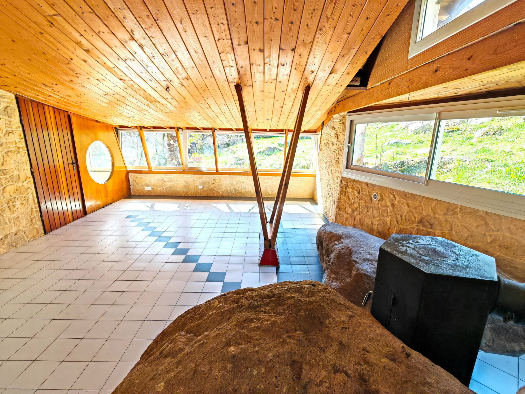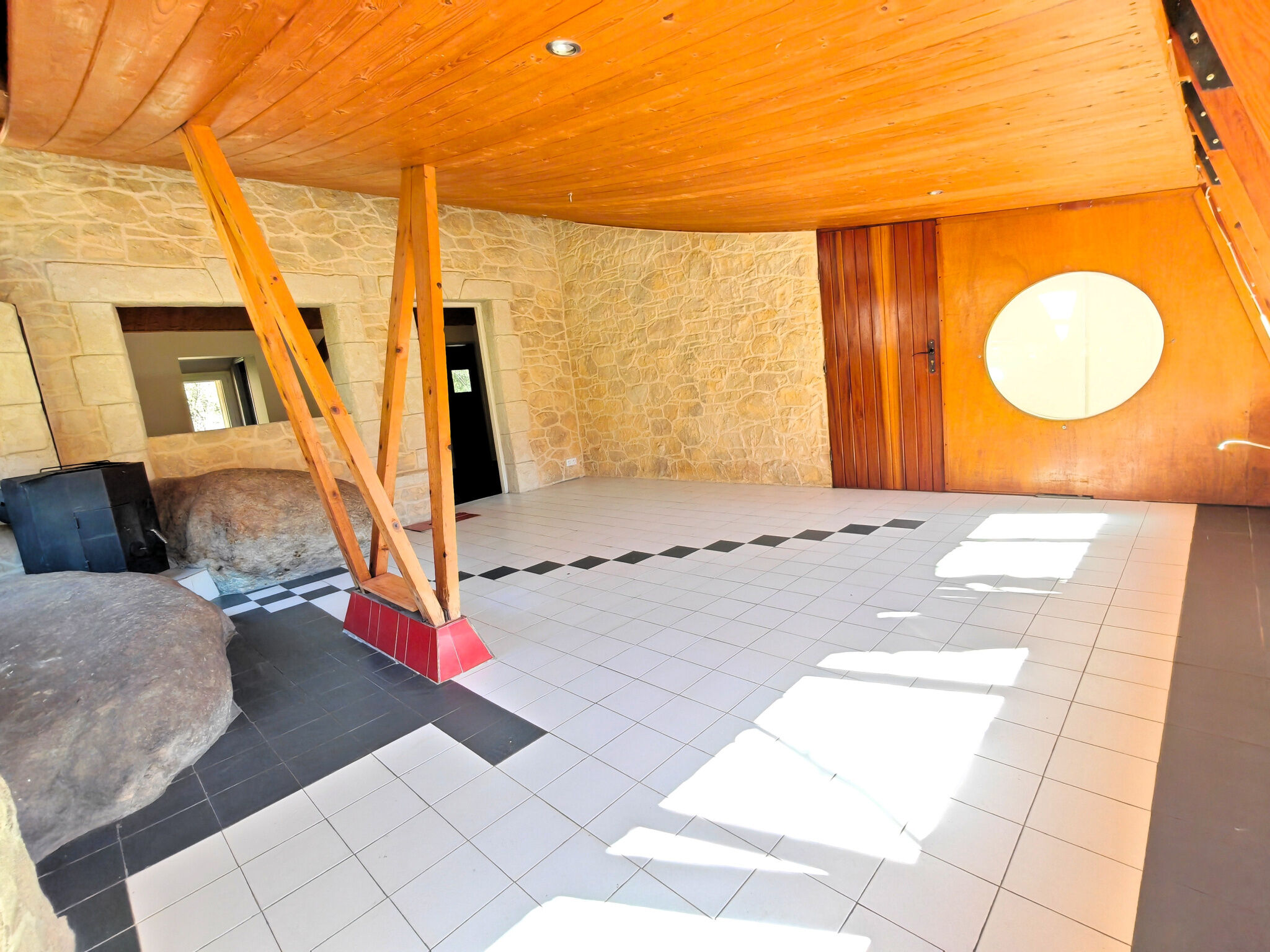 Une grande entrée avec placard, un séjour avec poêle à bois, une cuisine / salle à manger et cellier, 2 chambres, une salle de douche, wc individuel