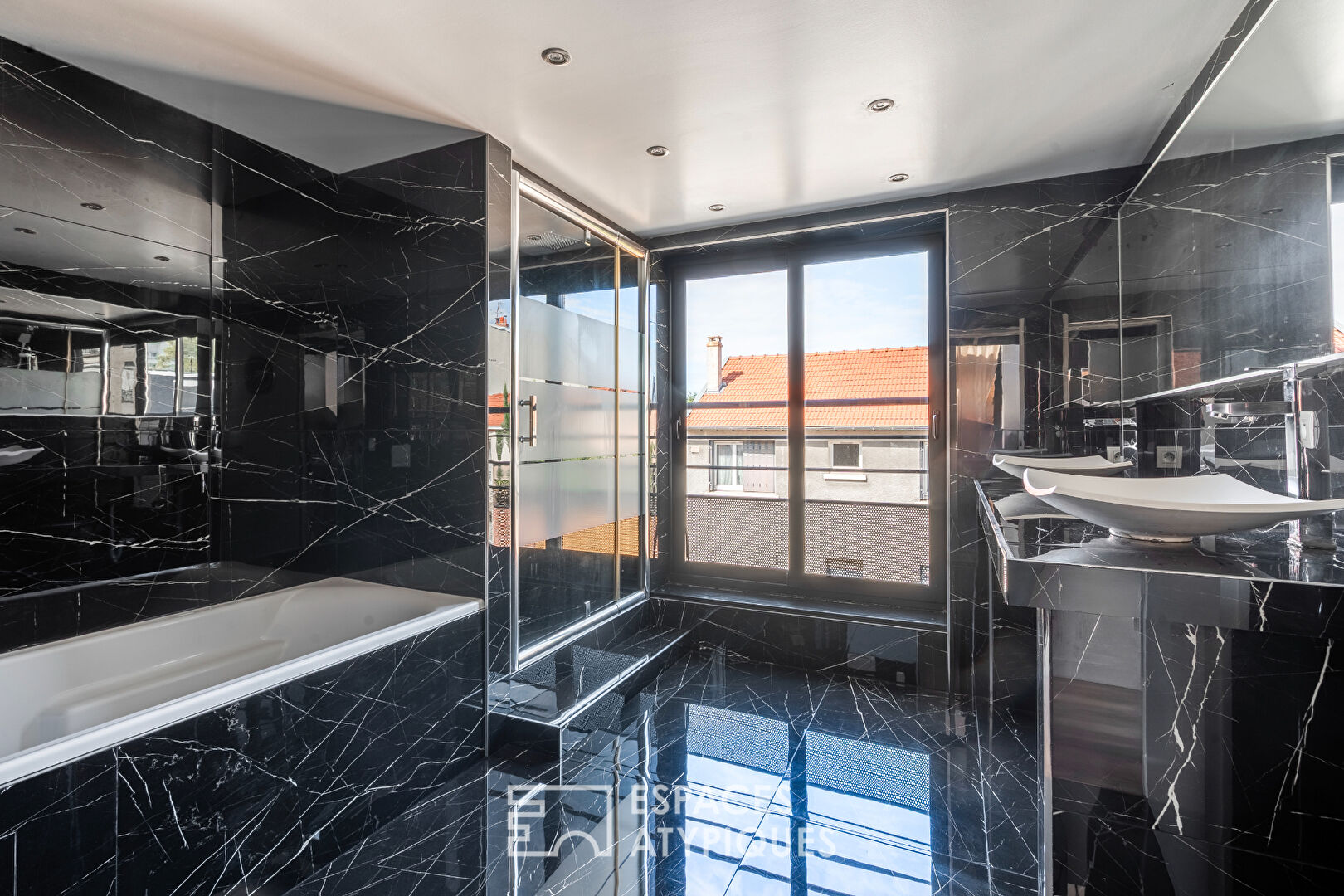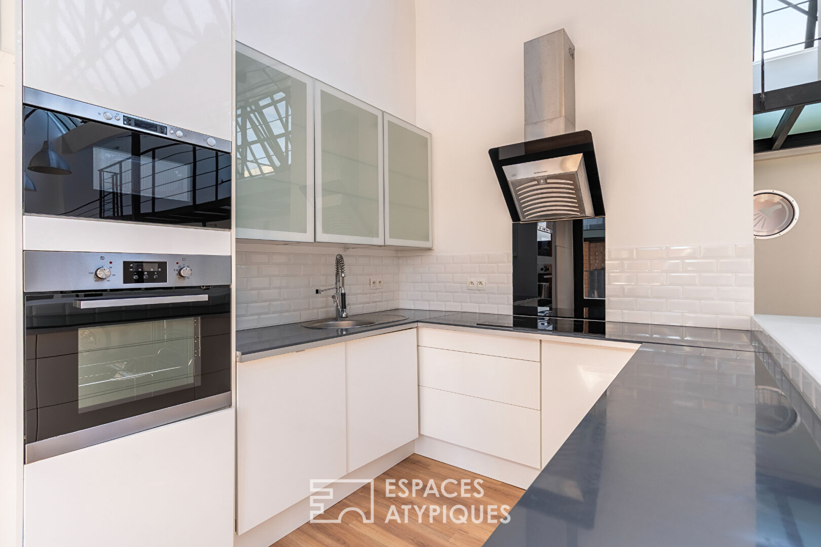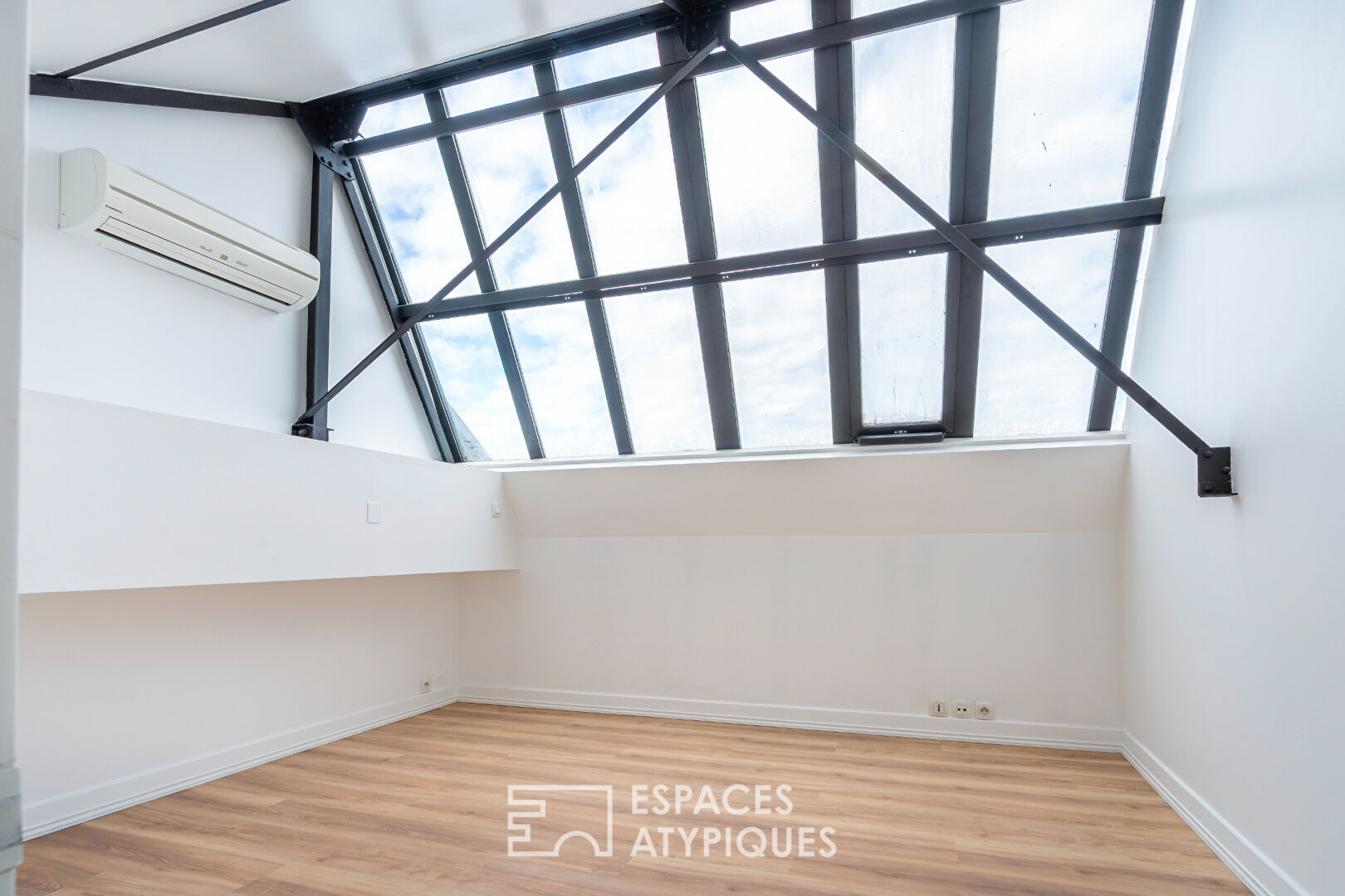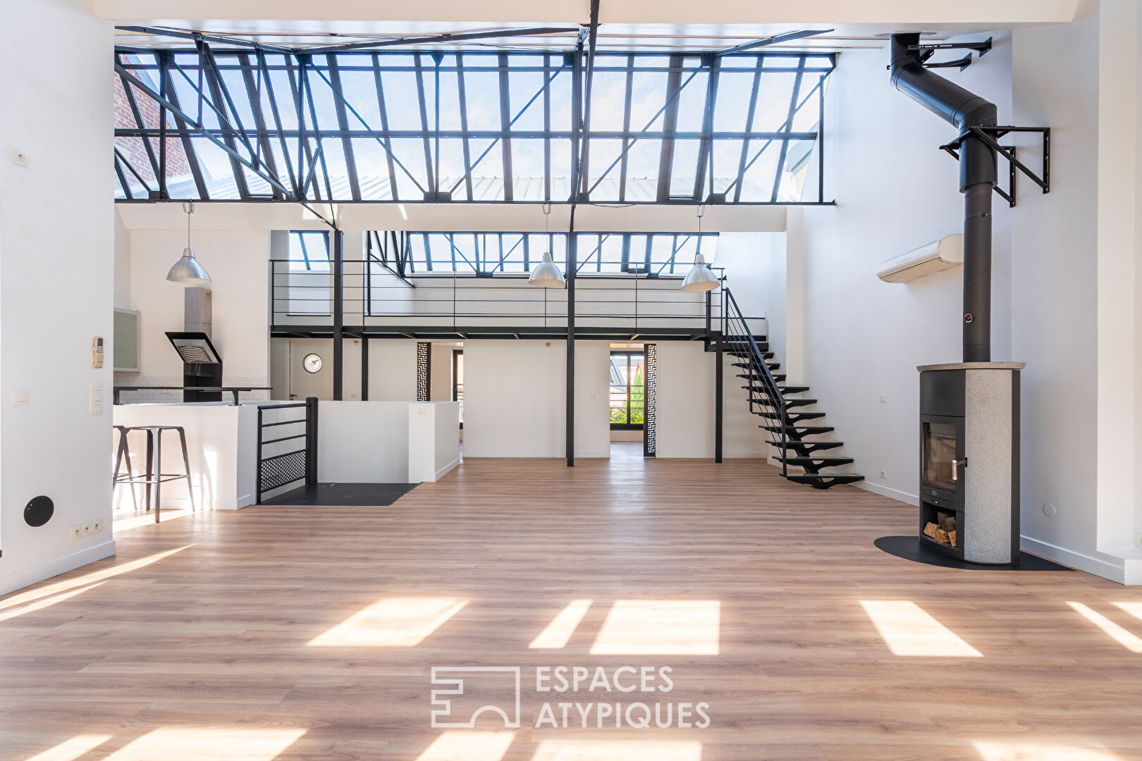 Nichée dans le quartier calme et prisé des Gondoles Sud à Choisy-le-Roi, cette ancienne cartonnerie réhabilitée abrite aujourd'hui un loft en duplex de 160 m² à l'esprit résolument contemporain. Véritable lieu de vie singulier, il conjugue architecture industrielle, volumes spectaculaires et lumière omniprésente sous un toit zénithal ouvrant culminant à plus de 5 mètres de hauteur. Au coeur du loft, la pièce de vie de 76 m² déploie des volumes impressionnants. Sa verrière d'atelier partiellement ouvrante diffuse une lumière douce et constante, sublimant chaque détail architectural. Bien plus qu'un séjour, cet espace d'exception est une véritable scène de vie. Son atmosphère accueillante et son plan modulable défient les conventions et permettent d'y dessiner un majestueux salon ainsi qu'une lumineuse salle à manger ouverte sur la terrasse de 15 m². Accessible également depuis la cuisine, elle prolonge naturellement la vie intérieure vers l'extérieur, idéale pour des moments de calme au soleil. La cuisine design, sobre et fonctionnelle, s'intègre harmonieusement à l'ensemble, tandis qu'un poêle contemporain et une climatisation réversible assurent un confort parfait en toute saison. Le rez-de-chaussée abrite deux chambres dotées de portes coulissantes japonaises et chacune pourvue d'un dressing intégré, alliant élégance, praticité et sérénité. Une spacieuse salle de bains réunit baignoire et douche à l'italienne dans une atmosphère apaisante. Des toilettes séparées complète ce niveau. L'étage révèle une spectaculaire mezzanine en suspension. Baignée d'une clarté zénithale, elle offre une vue plongeante et inspirante sur la pièce principale. Cet espace libre, véritable toile blanche, se transformera au gré de vos envies : bureau contemplatif, bibliothèque aérienne, salle de sport avec vue, ou encore salle de jeux créative. Sous un ciel de verre, la troisième chambre, véritable cocoon suspendu et baignée de lumière épouse parfaitement l'esprit atypique de ce loft hors du temps. La copropriété, à taille humaine, séduit par son ambiance conviviale, animée par des espaces communs partagés propices aux échanges et à la détente. Une place de parking couverte et un emplacement moto complètent ce bien. A moins de 10 minutes des commerces, du RER C et des écoles, ce loft atypique marie grandeur, lumière et confort familial avec élégance. Un bien immobilier de prestige, pensé comme un havre de vie inspirant et chaleureux. RER C : 10 minutes à pied Ecoles : 8 minutes à pied Commerces : 2 minutes à pied CLASSE ÉNERGIE : D CLASSE CLIMAT : B Montant moyen estimé des dépenses annuelles d'énergie pour un usage standard, indexées aux années 2021, 2022, 2023 : entre 2 060 euros et 2 860 euros (abonnement compris). Les informations sur les risques auxquels ce bien est exposé sont disponibles sur le site Géorisques : https://www.georisques.gouv.fr Contact : Angélique PEREZ 06 81 39 98 26 - Agent commercial- Numéro RSAC : 933 421 042 Créteil Copropriété de 25 lots - dont 11 lots habitation. Angélique Perez (EI) Agent Commercial - Numéro RSAC : 933 421 042 - Créteil.