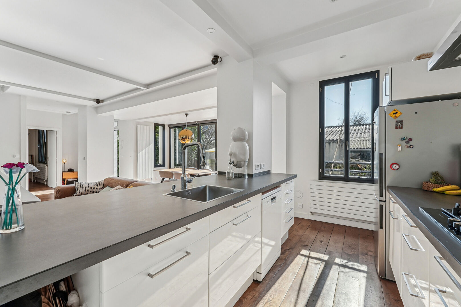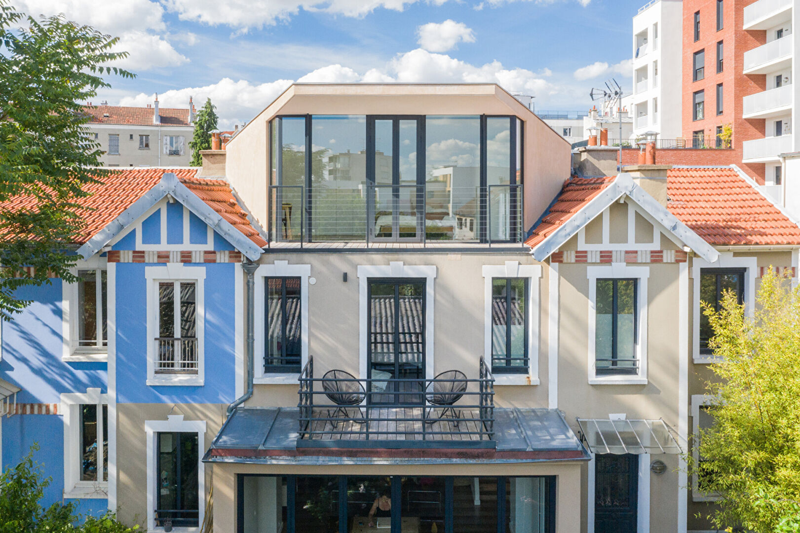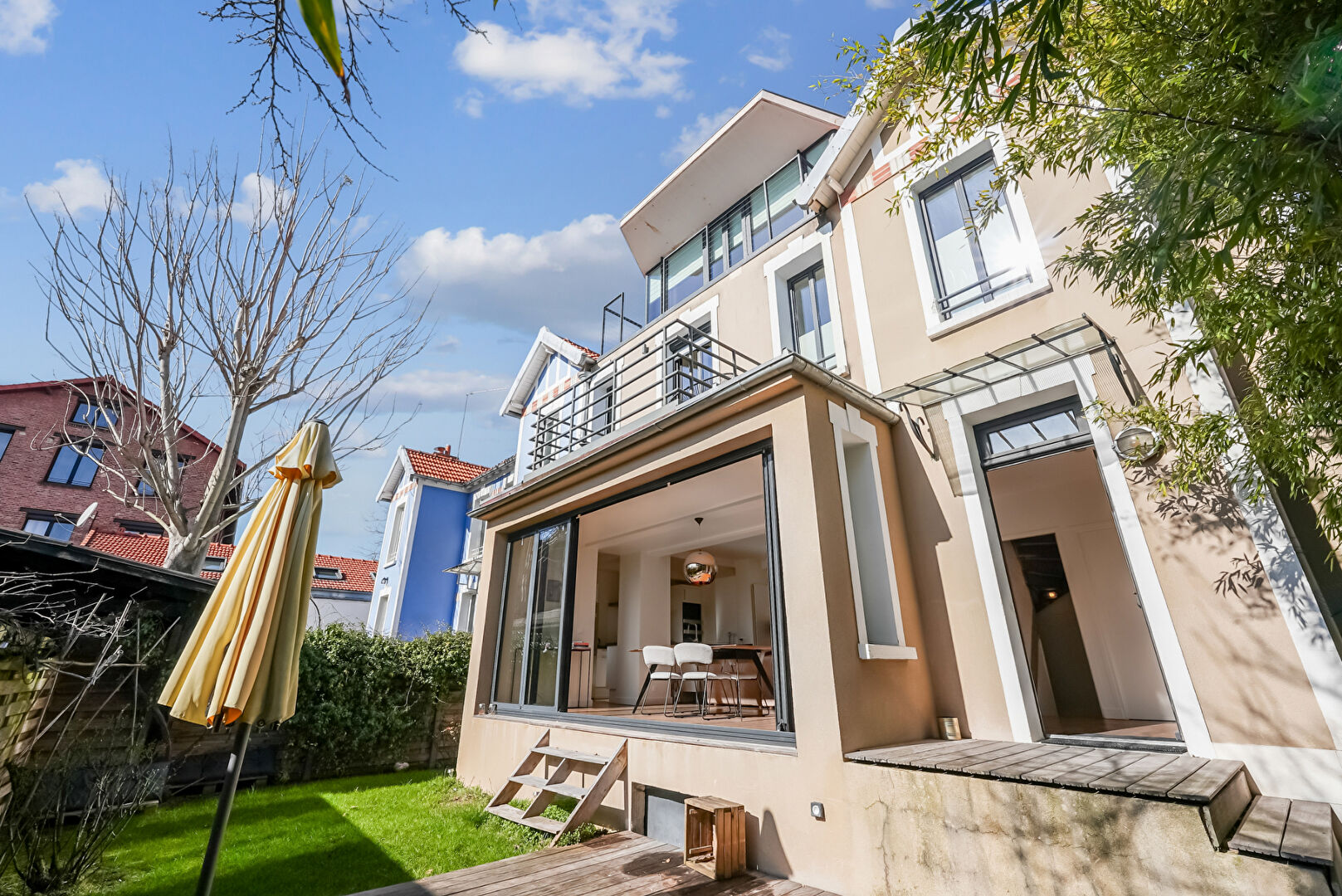 Située à 100 mètres du métro Croix-de-Chavaux, dans une rue calme et arborée, cette maison indépendante de 165,51 m² habitables, entièrement repensée par un architecte, offre un cadre de vie rare et recherché à Montreuil. Nichée au coeur d'un îlot de verdure, elle bénéficie d'un jardin privatif de 70 m² exposé plein sud, sans vis-à-vis. Au rez-de-chaussée, une entrée mène à un vaste espace de vie baigné de lumière, composé d'un double séjour et d'une cuisine ouverte aménagée, s'ouvrant largement sur l'extérieur grâce à de grandes baies vitrées escamotables. Un bureau de 10 m² avec dressing, pouvant faire office de quatrième chambre, ainsi qu'un WC avec point d'eau, complètent ce niveau. Le premier étage comprend une suite parentale avec salle de douche à l'italienne, double dressing et terrasse, ainsi qu'une seconde chambre disposant d'un espace mezzanine idéal pour un coin enfant. Une salle de bains indépendante et des toilettes séparées assurent le confort de ce niveau. Au deuxième étage, une grande chambre avec dressing et terrasse offre de multiples possibilités d'usage : chambre supplémentaire, salle de sport ou atelier selon les besoins. Un sous-sol aménagé de 30 m² propose une grande buanderie, une cave à vin et des espaces de rangement. Rénovée avec soin, cette maison allie matériaux de qualité (parquet en chêne massif, huisseries aluminium, grès cérame), volumes généreux, lumière naturelle et calme absolu. Le bien est situé à proximité immédiate des commerces, du marché, d'infrastructures sportives et du groupe scolaire Marcellin Berthelot. Le bois de Vincennes et le centre-ville de Vincennes sont accessibles en cinq minutes à vélo. Une maison familiale et contemporaine, rare sur le secteur, à découvrir sans tarder. (4.13 % honoraires TTC à la charge de l'acquéreur.) Copropriété de 10 lots - dont 7 lots habitation. Charges annuelles : 1104 euros.