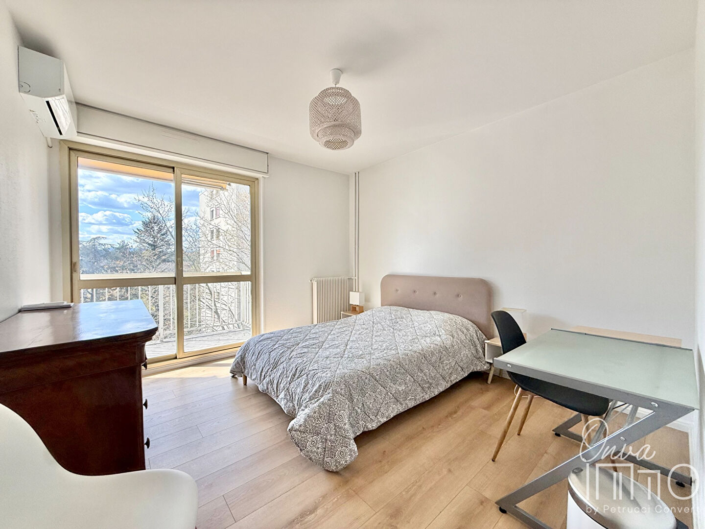 Lumineux T5 de 111m² avec balcons, stationnements et cave au sein d'une résidence de standing, bien entretenue, fermée et sécurisée avec de beaux espaces verts et terrain de tennis. Cet appartement en très bon état, bien agencé, et sans perte d'espace se compose : - d'une entrée avec rangements. - d'une spacieuse pièce de vie de plus de 30m² exposée Ouest et donnant un accès direct au balcon. - d'une salle à manger attenante donnant accès à un second balcon. - d'une cuisine semi-ouverte et entièrement équipée. - de trois chambres de 10 à 14m². - d'une salle de bains avec double vasques et rangements, d'une salle d'eau et de WC séparés. Ce T5 au plan d'origine est aujourd'hui configuré en T4 avec un séjour double, mais pourra facilement retrouver son agencement initial avec une pièce de vie de plus de 30m² , une cuisine avec espace salle à manger et un coin nuit séparé avec 4 chambres (plan sur demande). Cet appartement dispose d'une cave en sous-sol inclus dans le prix, ainsi que d'une place de stationnement privative. Il est également possible d'acquérir une seconde place de parking en sous-sol au sein de la copropriété qui peut-être équipée d'une infrastructure individuelle permettant la recharge d'un véhicule électrique. Cet appartement est idéal pour un couple, comme pour une famille, de part ses éléments de confort et son emplacement : - Copropriété de standing avec espaces verts et terrain de tennis. - DPE classé D, climatisation sur toutes les pièces exposées Ouest, double vitrage et volets électriques. - Emplacement premium à proximité des écoles et transports (Bus 55, 72, 86, 98) Bien soumis au régime de la copropriété. Pas de procédure en cours. Charges mensuelles : 450 euros comprenant les charges de copropriétés, de bâtiment, de gardiennage, d'entretien des espaces verts, de chauffage, d'eau chaude et d'eau froide. « Les informations sur les risques auxquels ce bien est exposé sont disponibles sur le site Géorisques (C. envir., art. R. 125-25, I). Pour plus d'informations, photos et plans, prenez contact avec notre consultante Alice Goedart, agent commercial, immatriculée au RSAC de Lyon sous le numéro 999 654 387, au 06/71/98/39/80. Copropriété de 110 lots. Charges annuelles : 5400 euros.