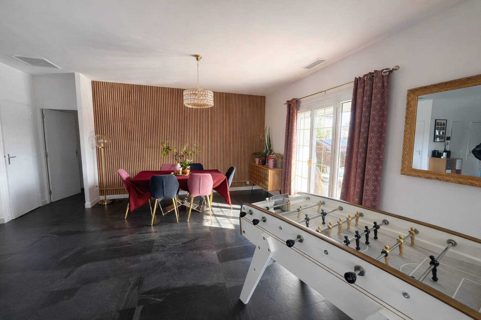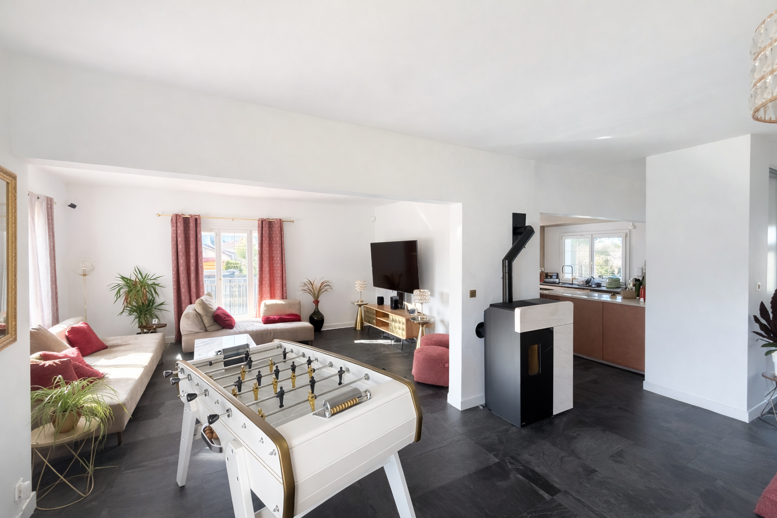 La maison se compose d'un grand séjour lumineux avec cuisine ouverte de 70m2, donnant directement sur une spacieuse terrasse exposée plein sud avec vue sur la piscine. Elle dispose de 6 pièces, dont 4 chambres, ainsi que 2 salles d'eau, idéales pour une vie de famille confortable.