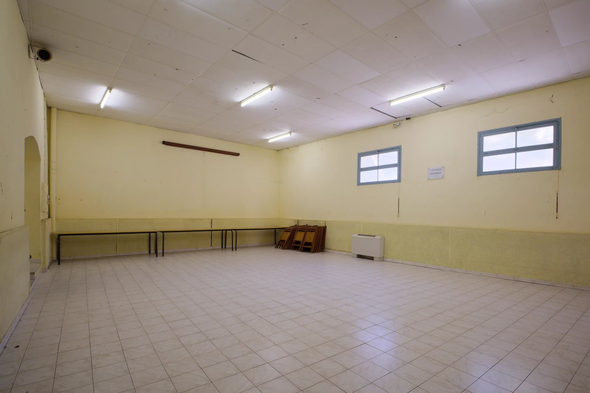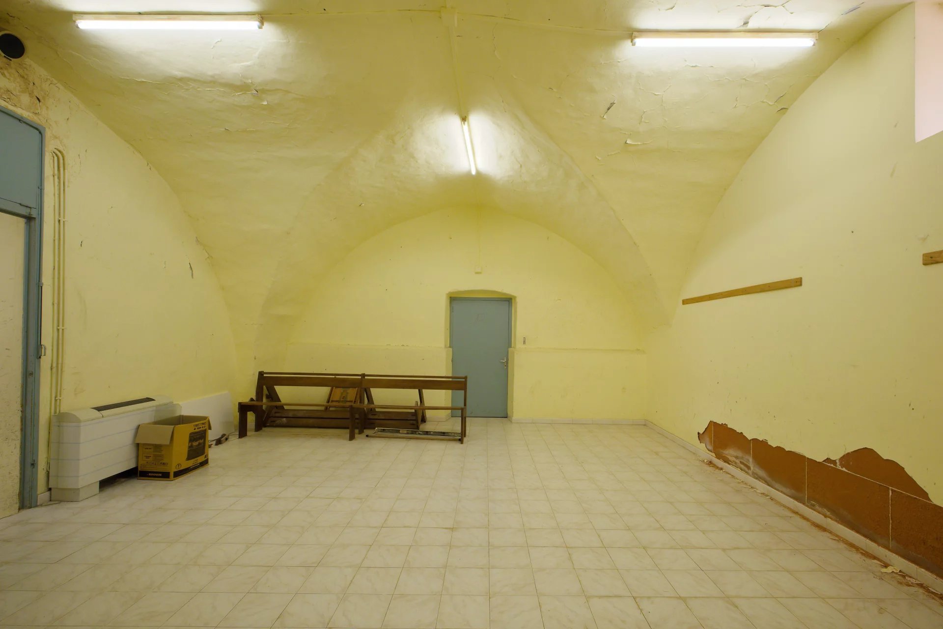 La partie plus récente comprend différents espaces, deux entrées, une grande salle principale d'environ 81m2 avec une hauteur sous-plafond d'environ 4m, une cuisine voûtée, deux pièces de passages et deux toilettes séparés.