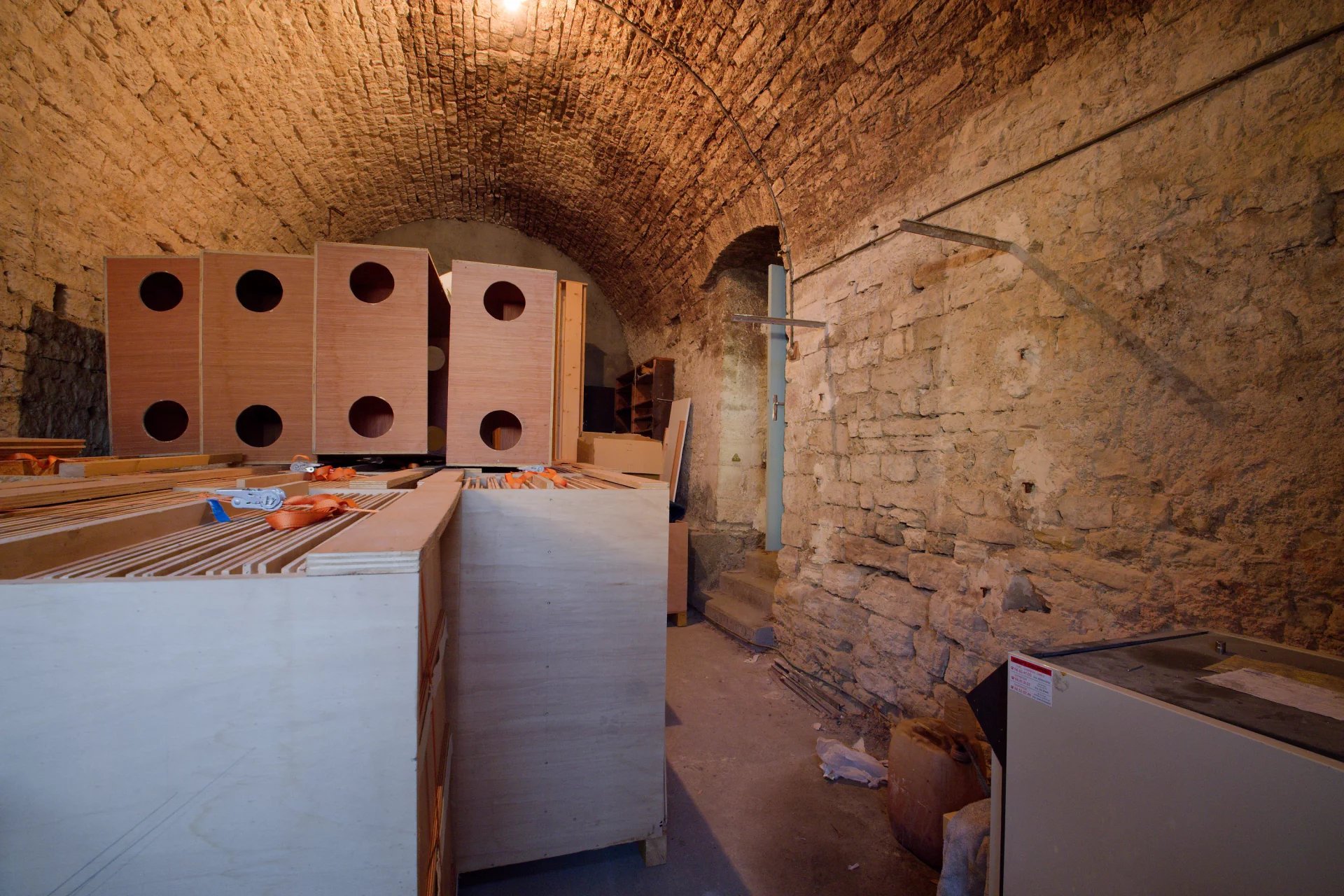 - Au rez-de-chaussée, un couloir d'entrée, un vaste garage, une salle voûtée et un accès à la partie plus récente.