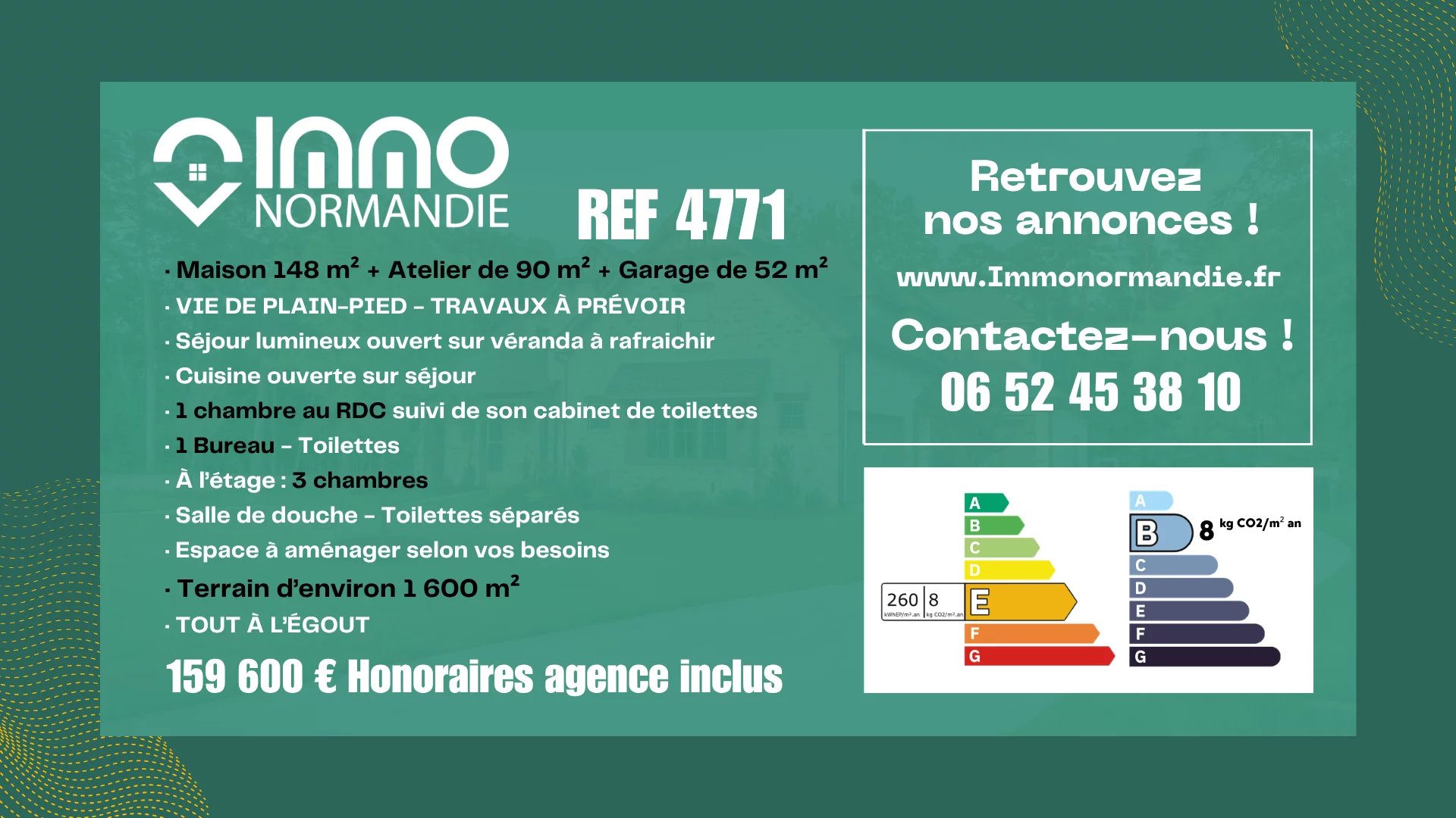 Cette maison avec vie de plain-pied possible offre 148 m² habitables, idéale pour artisans ou grande famille. Vous y trouverez un vaste séjour lumineux avec cuisine ouverte, une véranda conviviale, ainsi que deux chambres au rez-de-chaussée accompagnées d’un cabinet de toilettes. À l’étage, trois chambres supplémentaires, une salle de douche et des toilettes séparées complètent l’espace nuit. Un espace à réinventer vous permettra d’aménager selon vos envies. Le bien comprend aussi un atelier spacieux de 90 m² et un garage de 52 m², parfaits pour les activités professionnelles ou le bricolage. Terrain de 1600 m². Tout à l'égouts Commerces, écoles et collèges accessibles à pied. Agence IMMO-NORMANDIE 4 agences Pour vous accompagner dans votre Projet immobilier -- LA BARRE EN OUCHE -- BEAUMONT LE ROGER -- -- BRIONNE -- THIBERVILLE -- Retrouvez toutes nos annonces et vidéos sur notre site www.immonormandie.fr Contact : Benjamin ROMUALD, entrepreneur individuel (E.I.) agissant en sa qualité d'agent commercial, inscrit au Registre Spécial des Agents Commerciaux sous le numéro RSAC 812 264 455 00013
