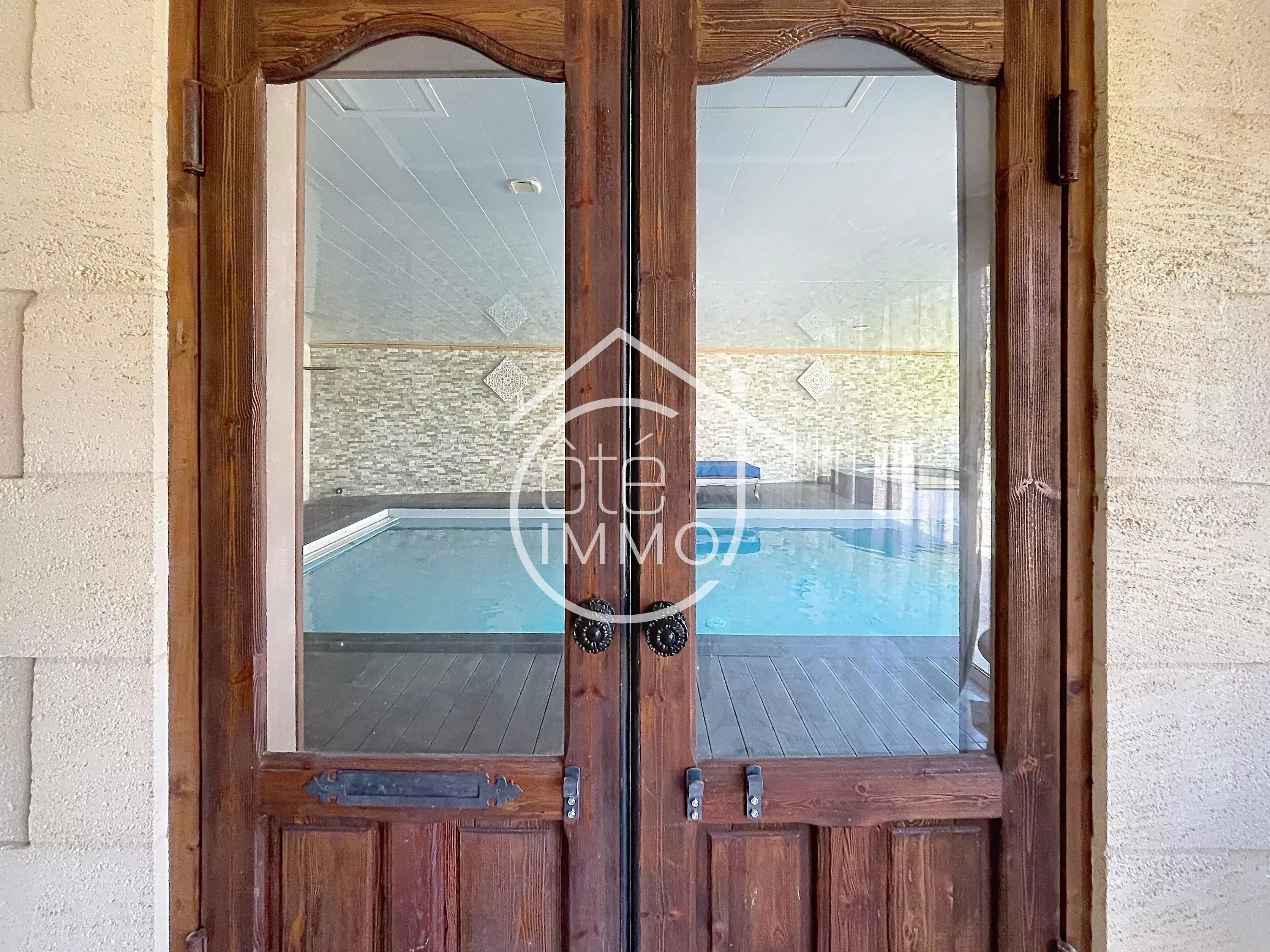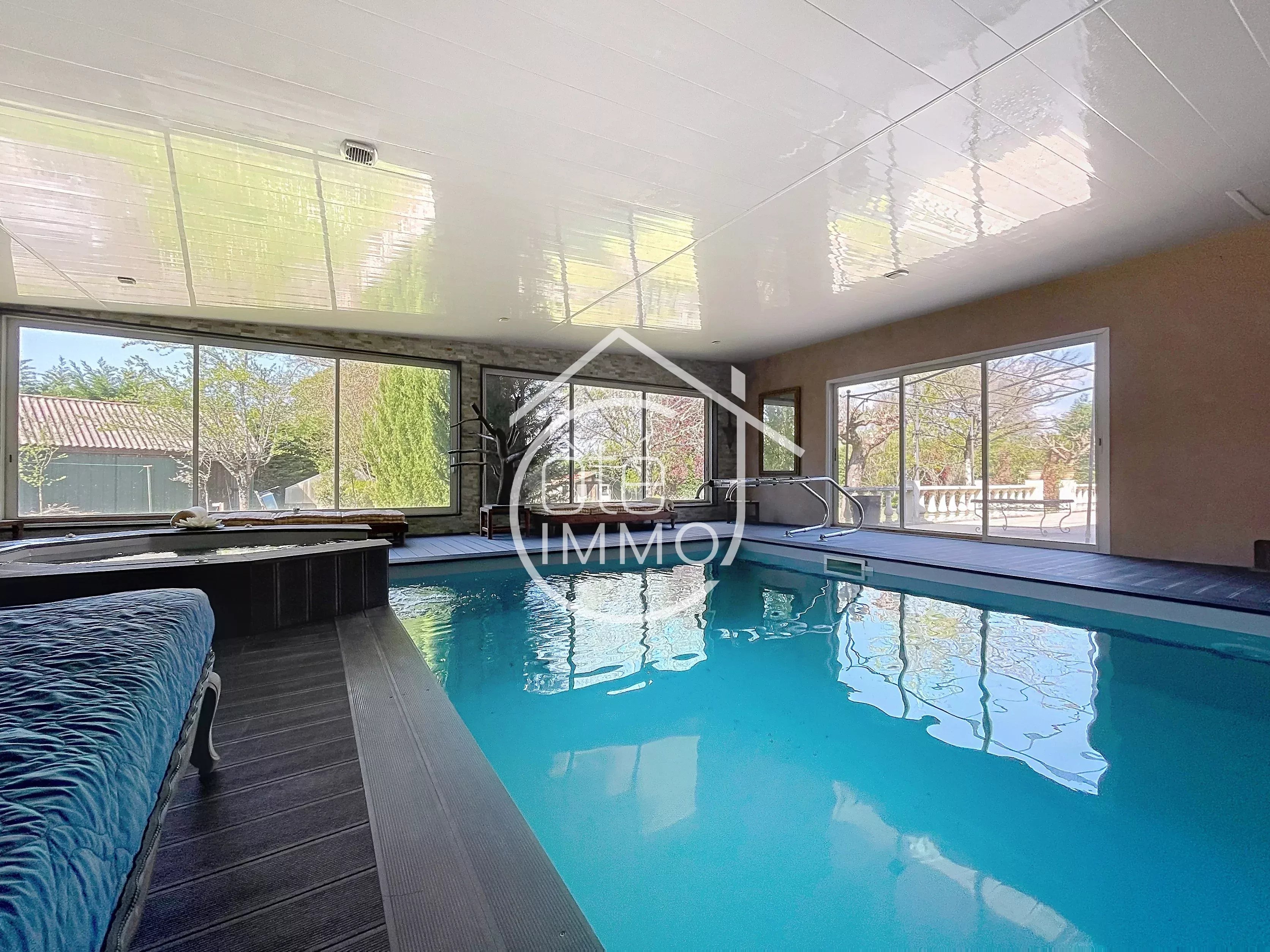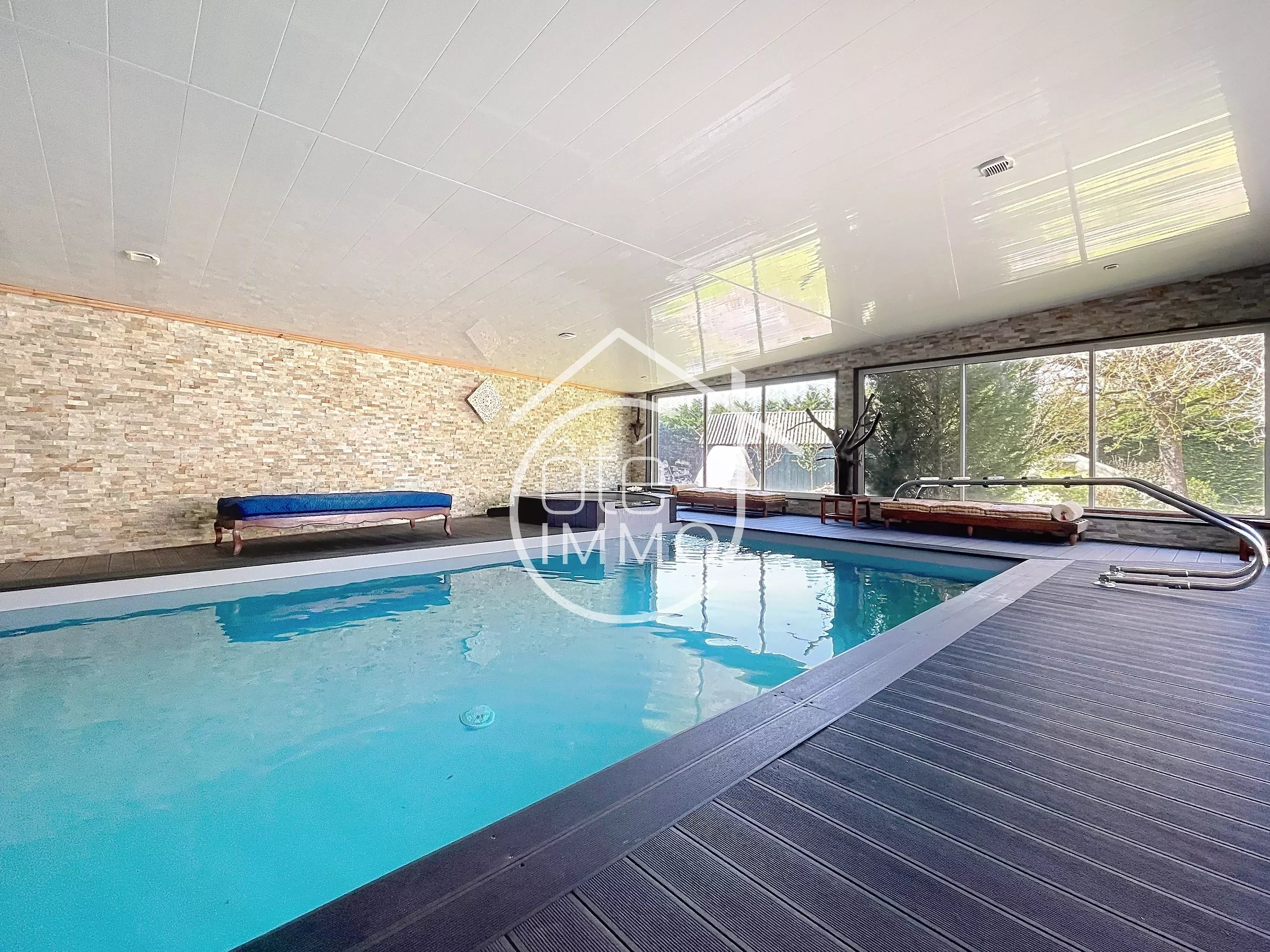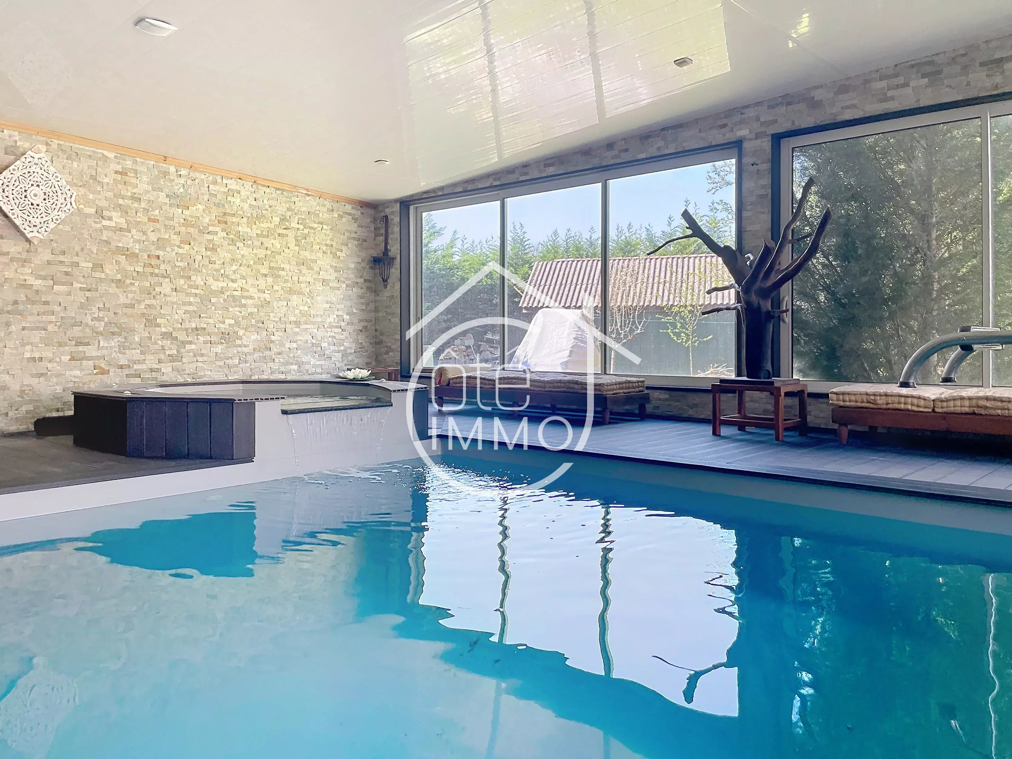 Grande propriété en pierre de 340 m² habitables avec piscine intérieure et parc arboré Amateurs d’authenticité et de volumes, venez découvrir cette superbe demeure en pierre apparente alliant le charme de l’ancien au confort moderne, implantée sur un terrain paysager de près de 2 500 m² entièrement entouré de haies et à l’abri de tout vis-à-vis. Offrant environ 340 m² habitables (surface chauffée) et plus de 450 m² d’espace pondéré en incluant les espaces annexes, cette propriété propose un cadre de vie remarquable et de nombreuses possibilités d’aménagement. Au rez-de-chaussée, une grande entrée mène à un salon chaleureux avec cheminée, un grand séjour/salle à manger d’environ 40 m², ainsi qu’à une cuisine moderne entièrement équipée avec îlot central, chambre froide, cellier et buanderie. À l'arrière de la maison, une vaste pièce avec de grandes baies vitrées court sur toute la longueur de la maison: un petit salon lumineux avec bar débouche sur une salle de bains complète (baignoire, douche, toilettes) et sur une salle de billard, laquelle ouvre sur une superbe piscine intérieure avec spa, dans un grand espace d’environ 90 m². À l’étage, la maison dispose d’une suite parentale avec salle d’eau privative et accès à un grand balcon dominant le parc. Trois autres chambres, une salle de bains supplémentaire et un dressing complètent cet étage. La cuisine communique avec un garage de plus de 30 m², déjà équipé pour l’aménagement éventuel d’une suite parentale en rez-de-chaussée. La maison est également équipée d'un vaste atelier d’environ 85 m² et d'une cave. À l’extérieur, le jardin paysager bénéficie d’un second atelier de plus de 40 m², d’une petite serre et d’un abri de jardin en bordure d'un étang — le tout dans un environnement intime et verdoyant, parfaitement entretenu. Équipements et prestations techniques : - Chauffage central au bois (radiateurs au rez-de-chaussée), complété par radiateurs électriques à l’étage. - Cheminée fonctionnelle. - Menuiseries double vitrage bois et aluminium. - Toiture refaite il y a une dizaine d’années environ. - Assainissement non conforme mais fonctionnel. - Portail électrique et carport - Puits Une propriété pleine de charme et de potentiel, idéale pour une grande famille, une activité de gîte ou un projet d’atelier d’artiste.