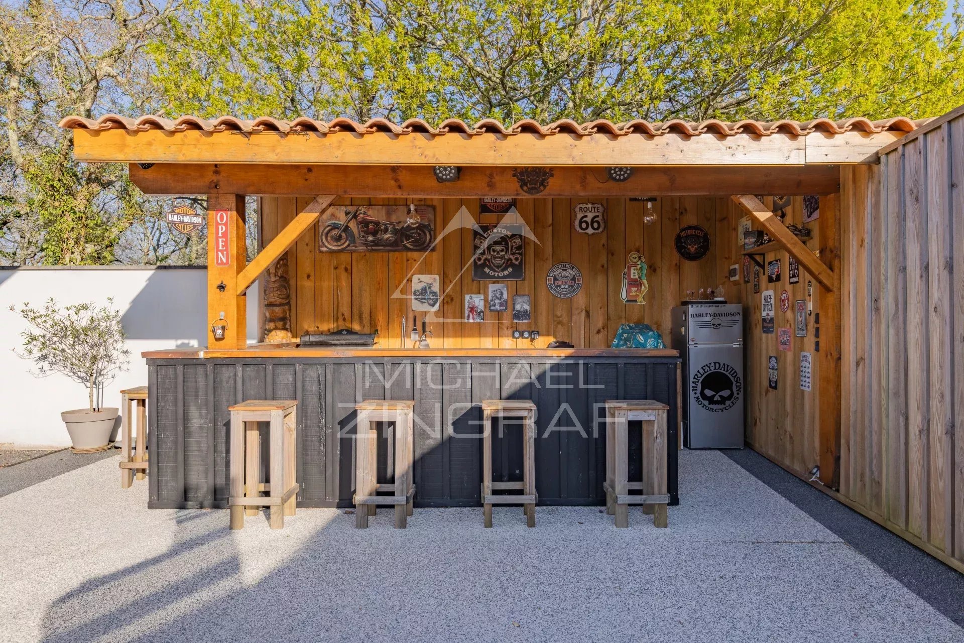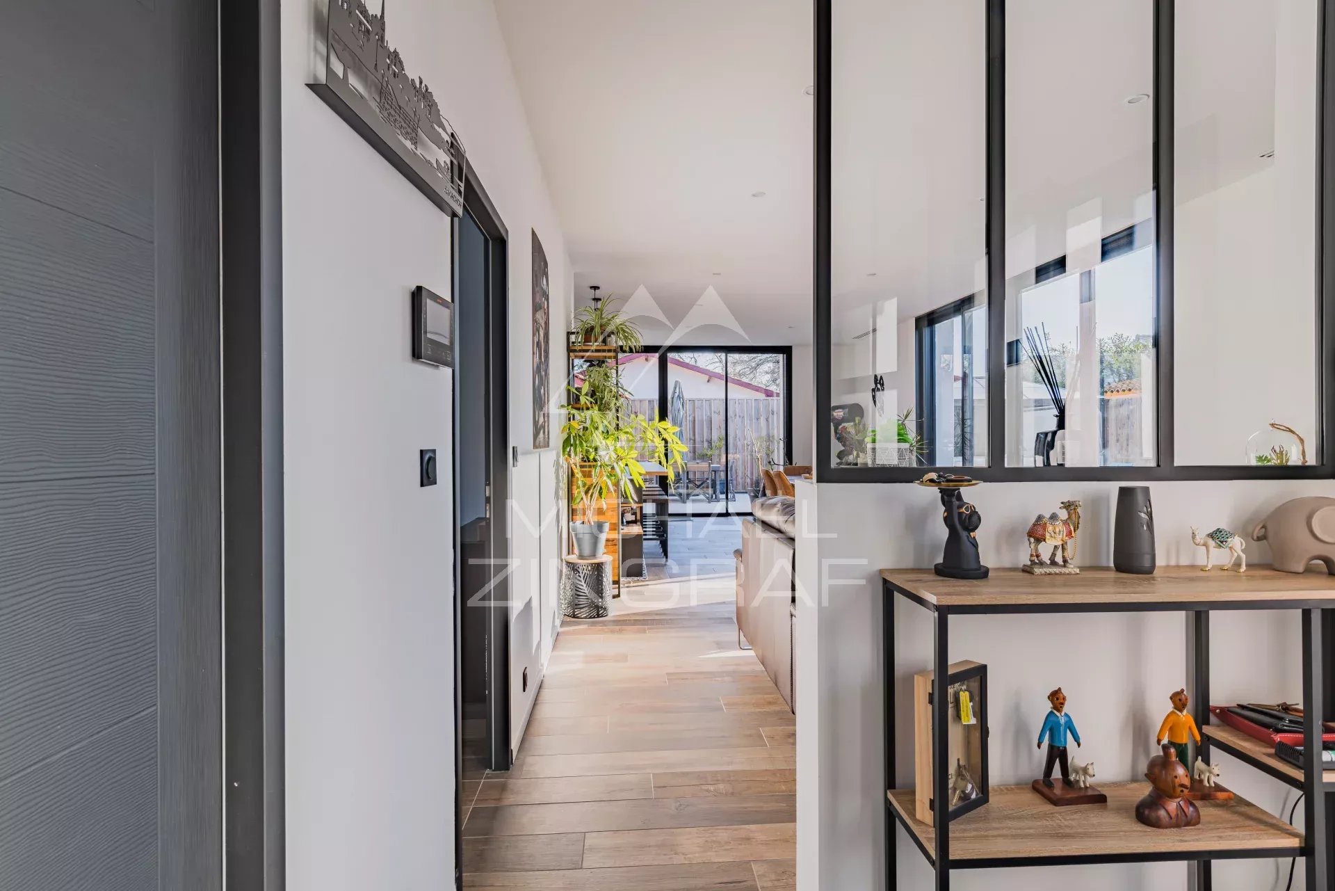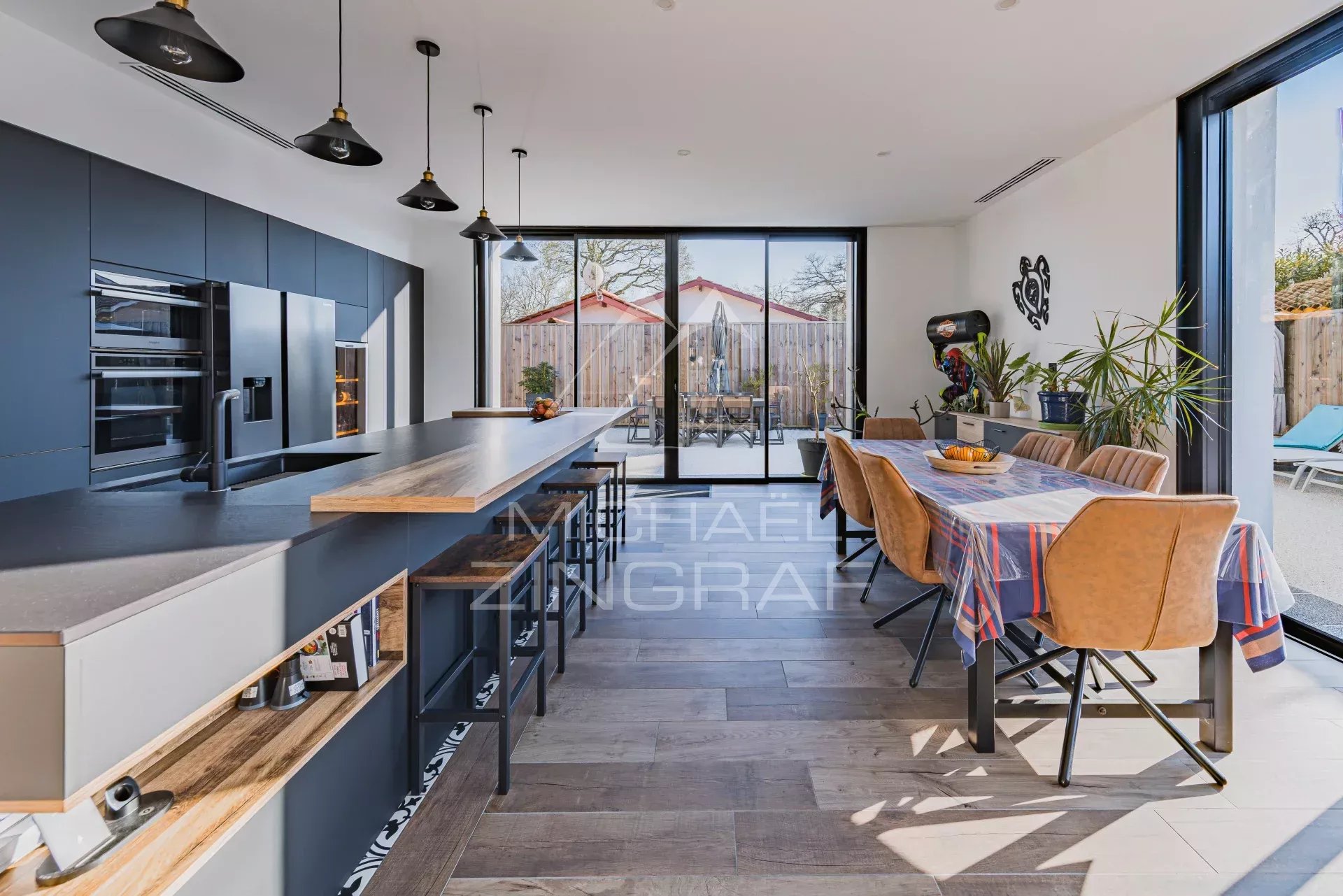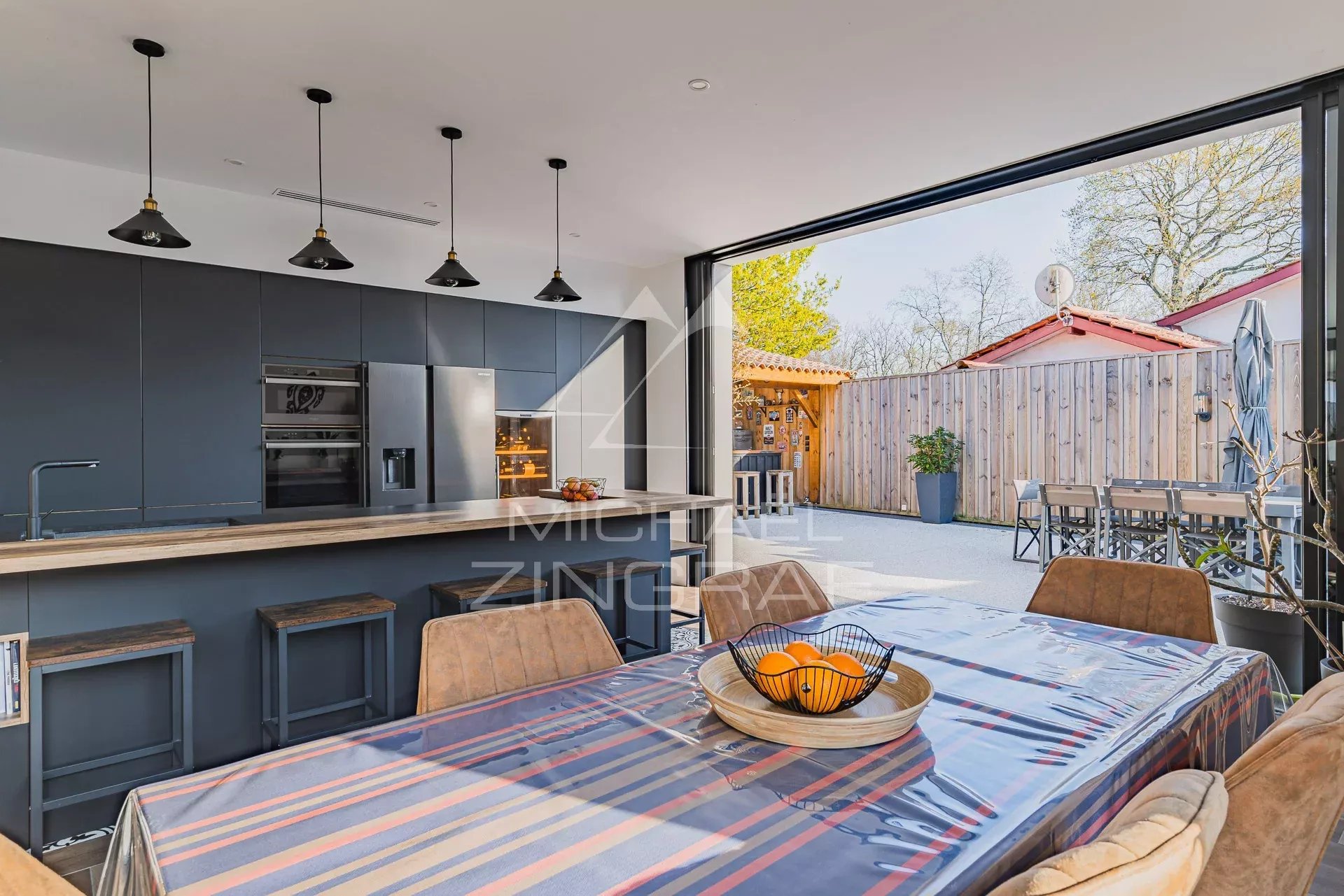 Michaël Zingraf Real Estate Bassin d'Arcachon vous présente, en exclusivité, cette magnifique maison de standing, construite en 2021, qui allie modernité et confort. Vous serez séduit par son vaste séjour lumineux, agrémenté d'une cuisine ouverte, idéale pour recevoir vos invités. Profitez d'un espace de vie extérieur exceptionnel avec une grande terrasse, où un jacuzzi vous attend pour des moments de détente inoubliables. La maison dispose d'une spacieuse suite parentale, parfaite pour vous offrir intimité et tranquillité, ainsi que de deux chambres supplémentaires et un bureau, idéaux pour une famille dynamique ou pour travailler à domicile. Le jardin, moderne et soigneusement aménagé agrémenté d'une cuisine d'été de charme, complète ce bien d'exception, créant une atmosphère paisible et accueillante. Située dans un quartier très recherché de Gujan, cette propriété se trouve à proximité des complexes sportifs et des établissements scolaires, rendant la vie quotidienne pratique et agréable.