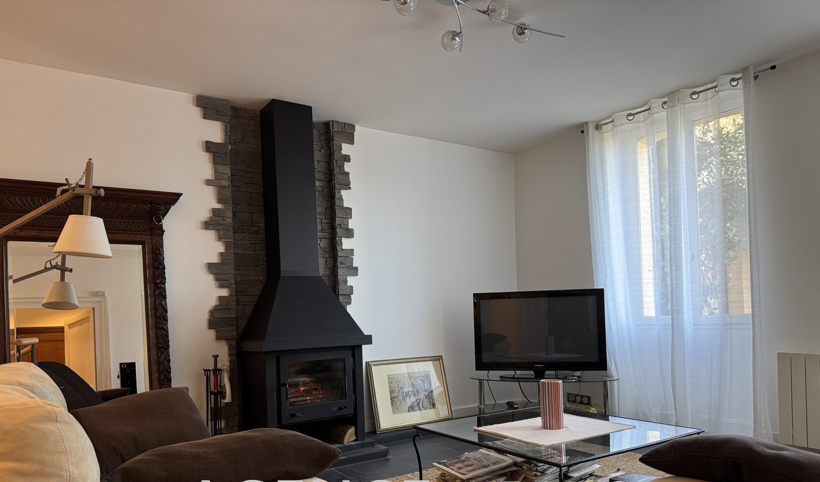 Chauffage par poêle à bois situé dans le salon et radiateurs électriques à inertie fluide.