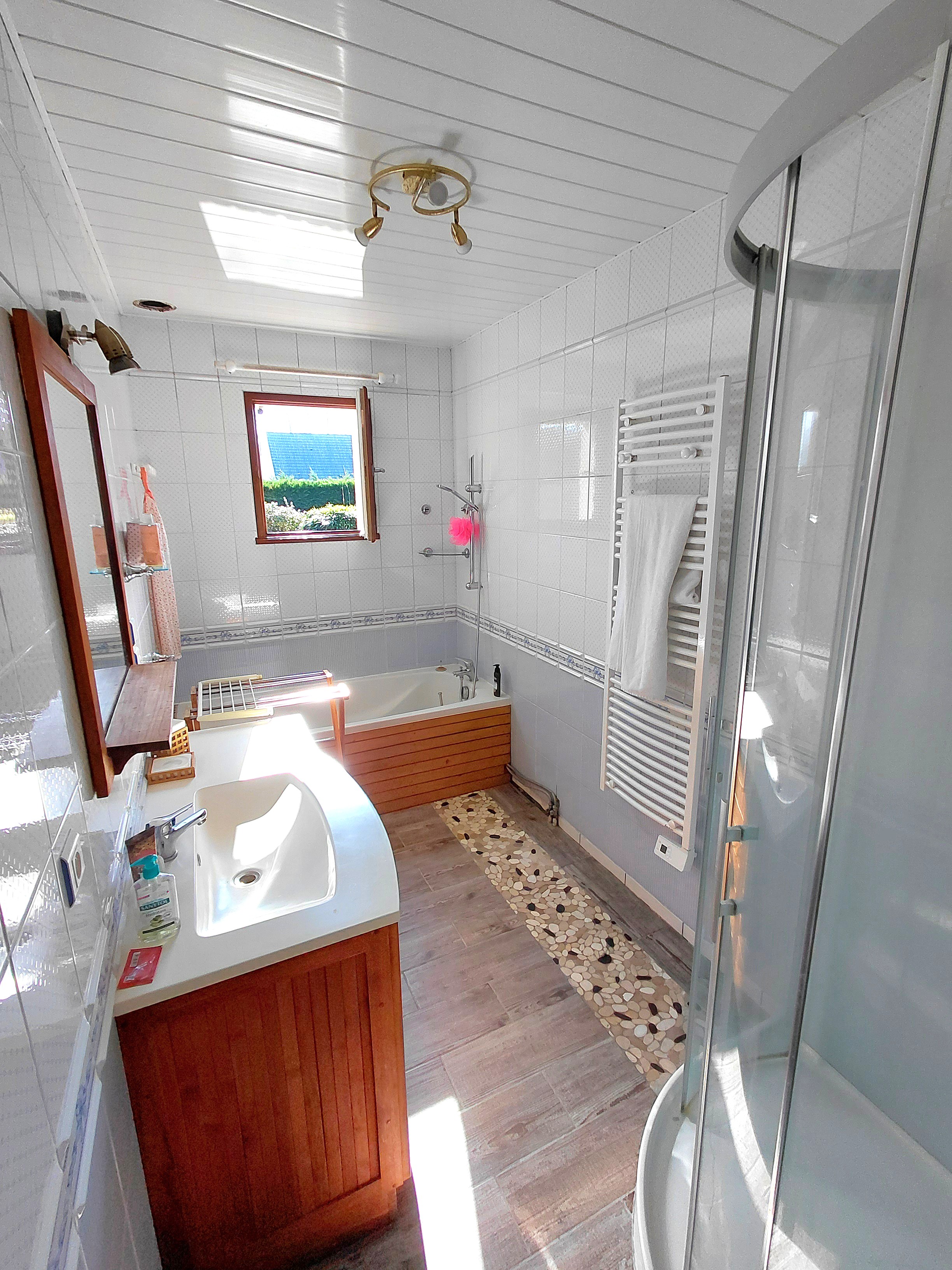 Une entrée, un beau séjour, une cuisine aménagée, un couloir desservant une salle de bain, une chambre, un WC et une buanderie.