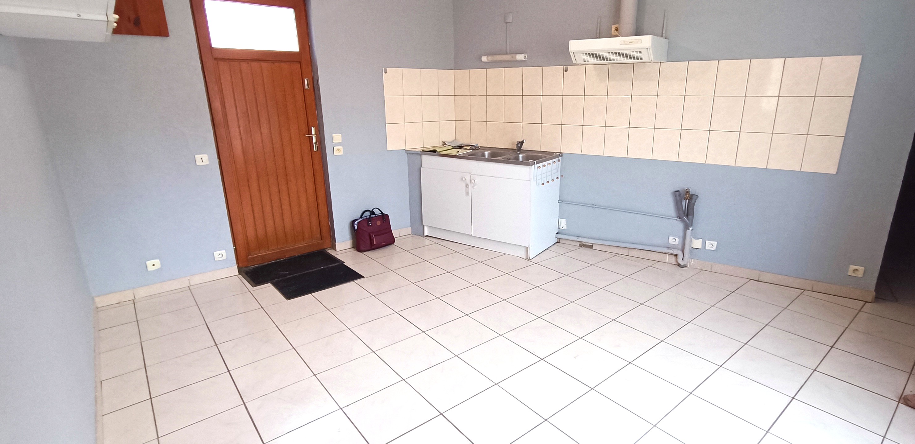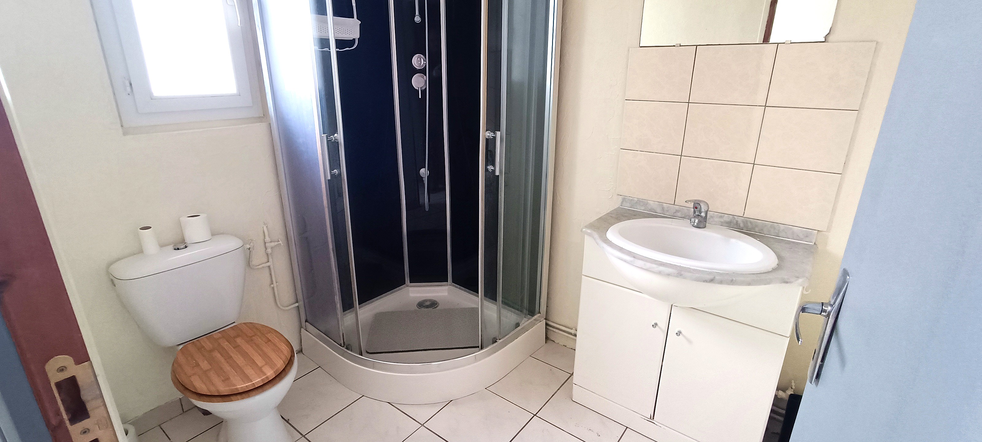 Une cuisine, un séjour, une chambre, un bureau, une salle d'eau avec douche, vasque et WC.