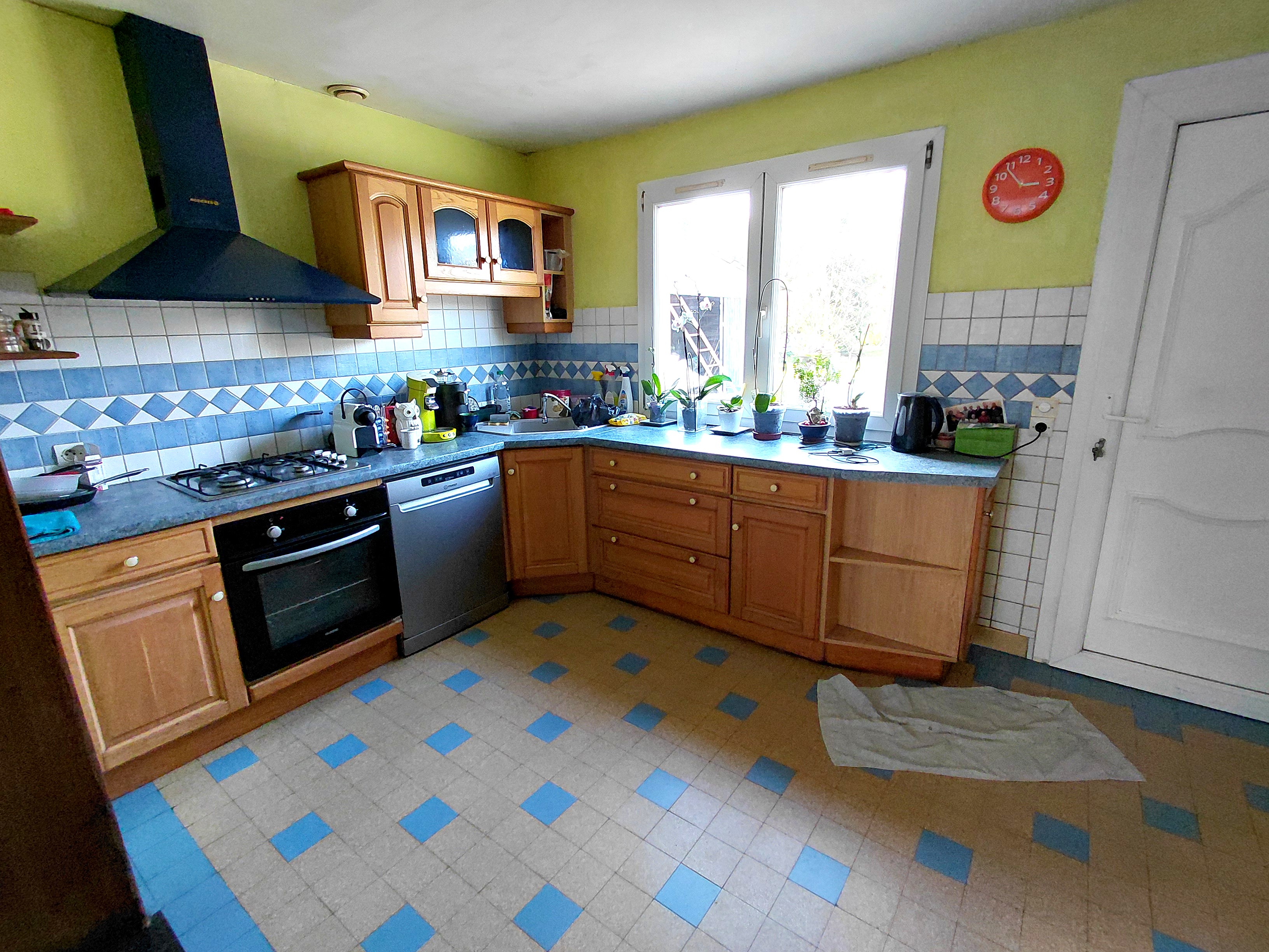 Une cuisine équipée et aménagée, une arrière-cuisine, deux chambres, un séjour avec cheminée, un couloir desservant un WC séparé et une salle de bain, une chaufferie.