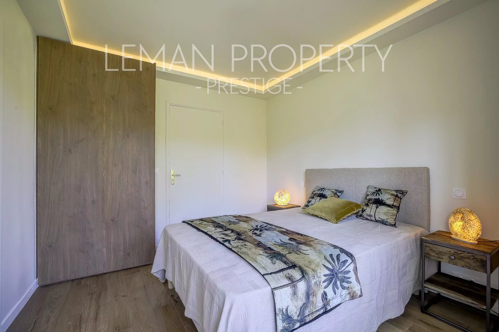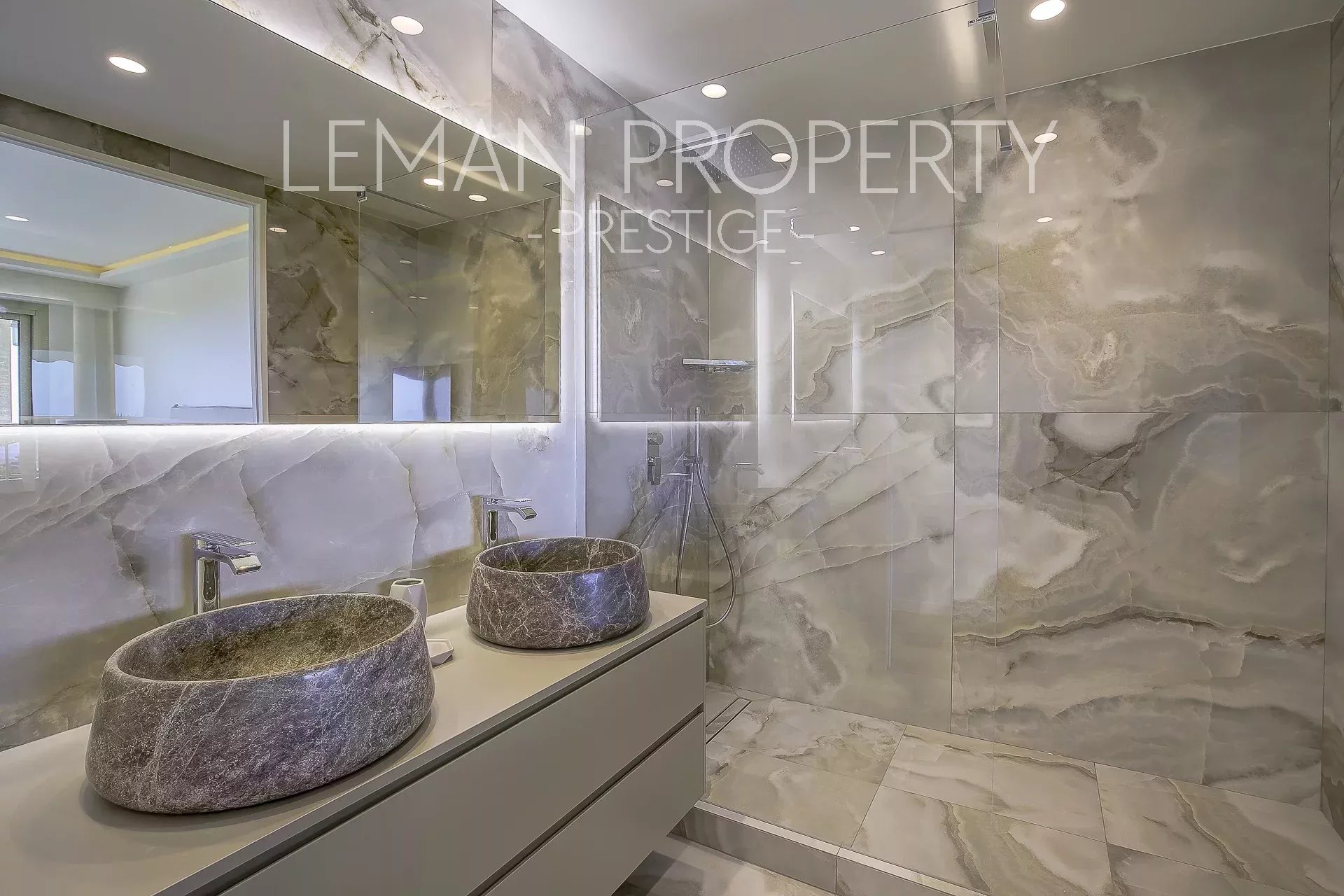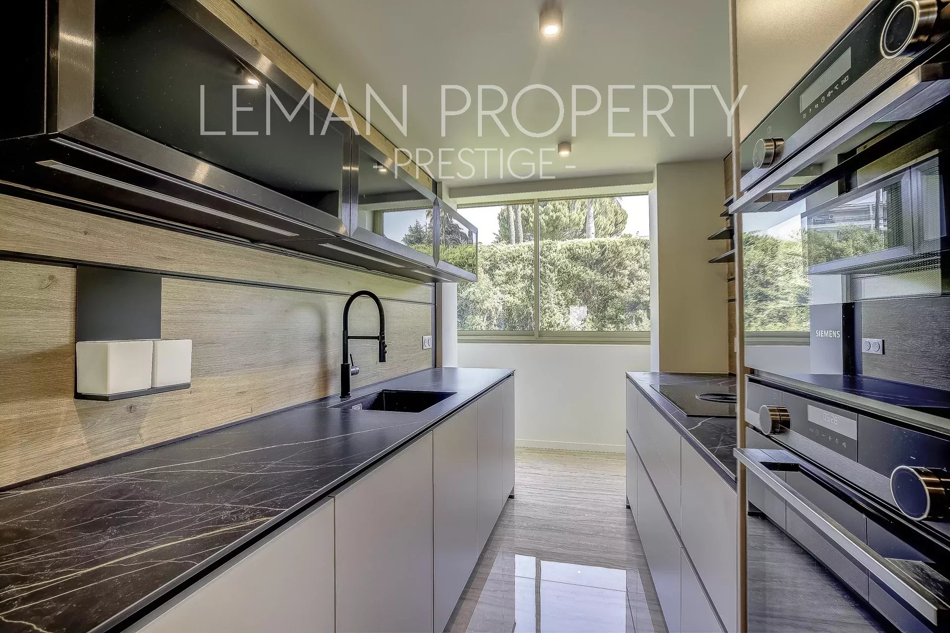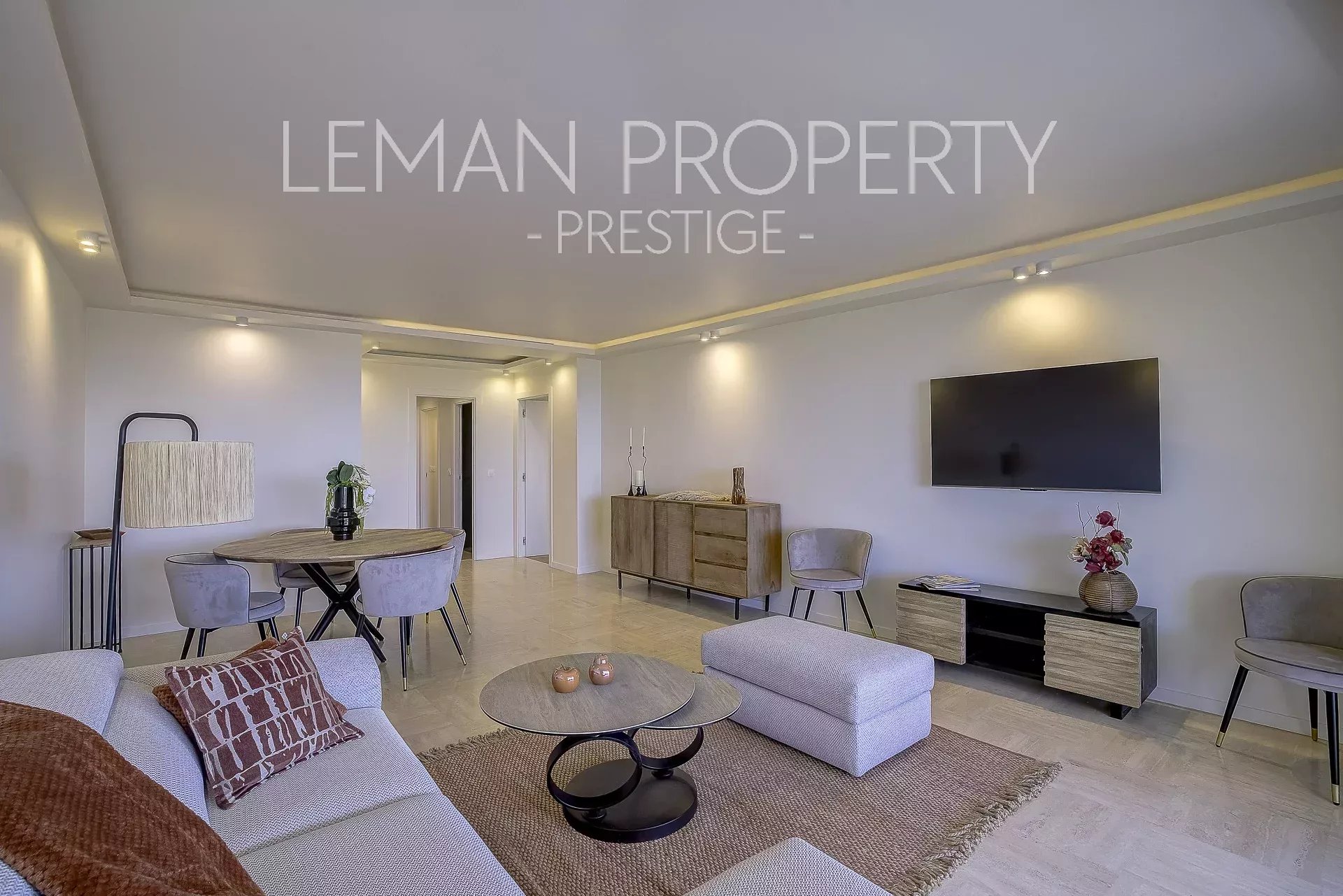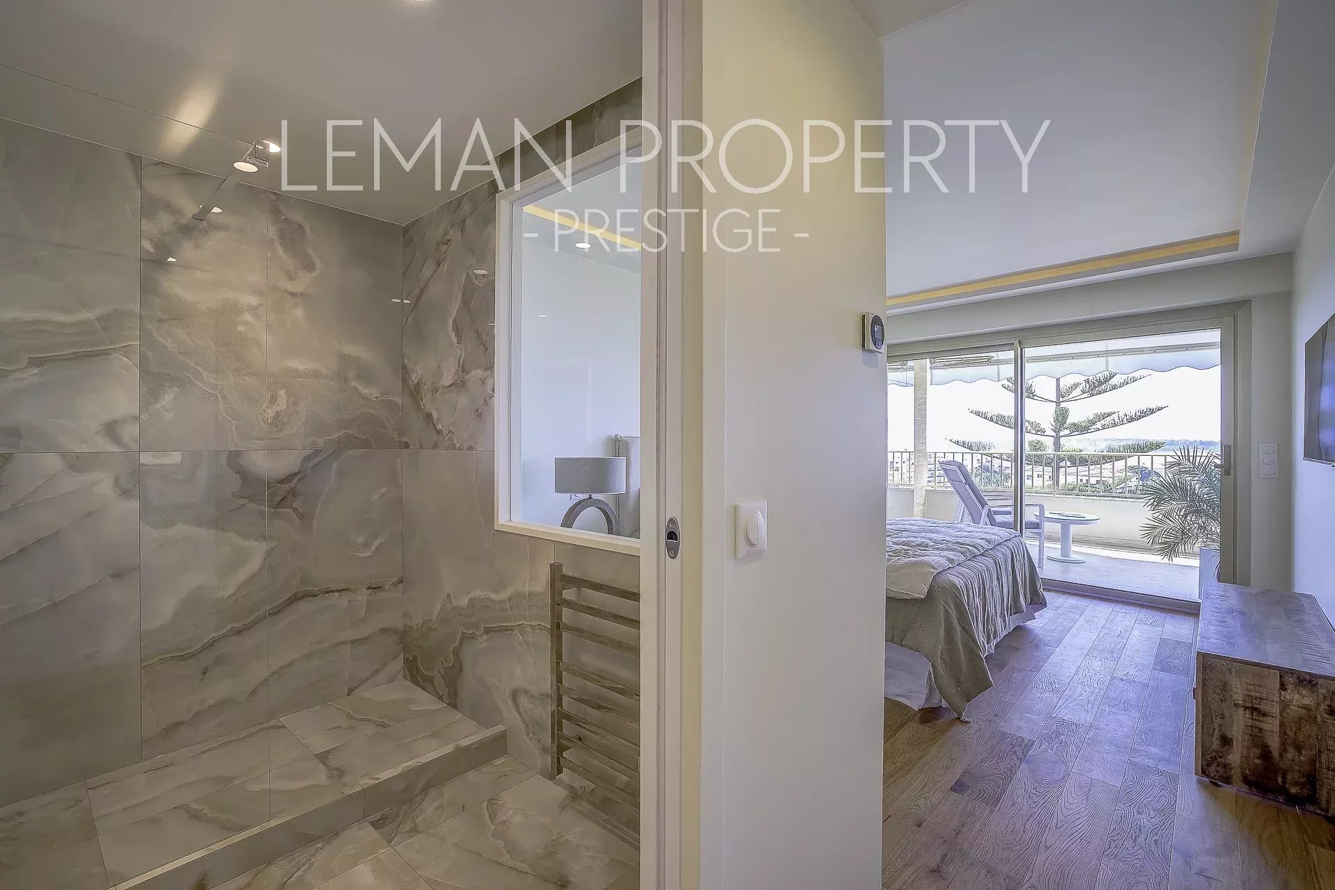 Dans l’une des résidences les plus prestigieuses de Cannes, "Le Rocher Saint- Georges" avec jardin et piscine, au 5ème et avant dernier étage, splendide 4 pièces totalement rénové, bénéficiant d'une large terrasse avec vue mer panoramique. Le bien se compose d’une entrée avec WC invités, lumineux séjour, chambre maître côté mer avec salle de douche/wc, dressing, seconde chambre avec une salle de bain/wc et dernière chambre avec salle de douche/wc, belle cuisine indépendante entièrement aménagée et équipée Un garage fermé et une cave complètent cet ensemble. Résidence fermée et gardiennée Charges annuelles courantes : 7200€/an soit 600€/mois. Pas de procédure en cours - Les honoraires sont à la charge des vendeurs