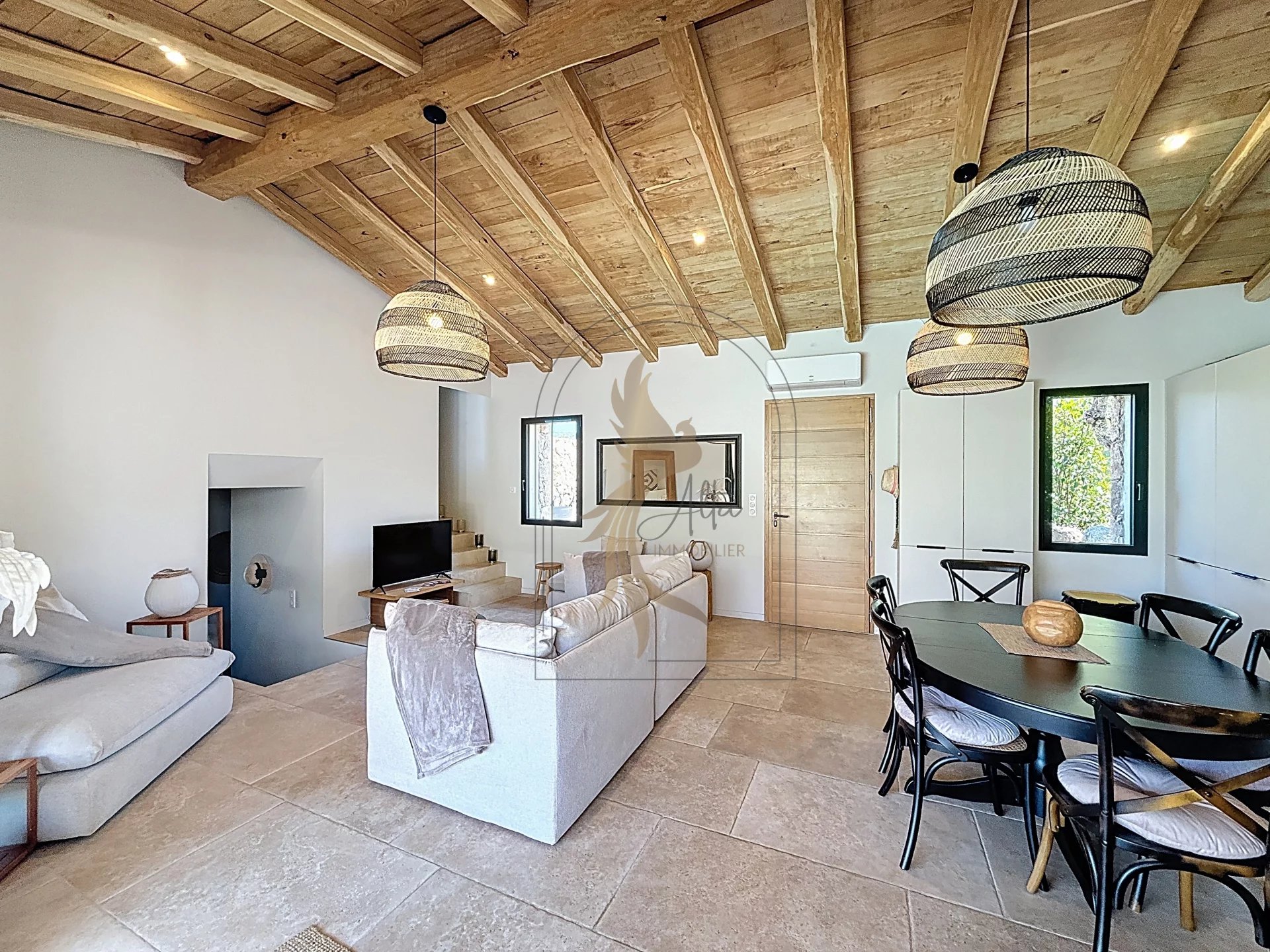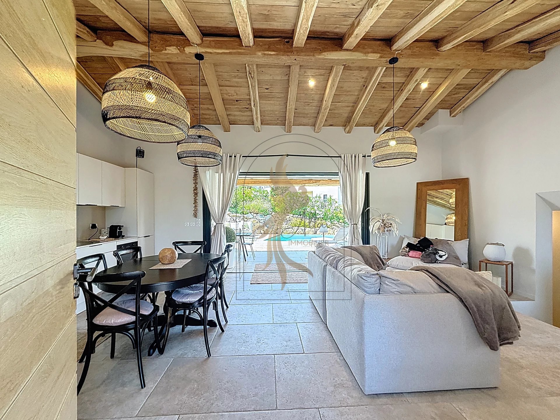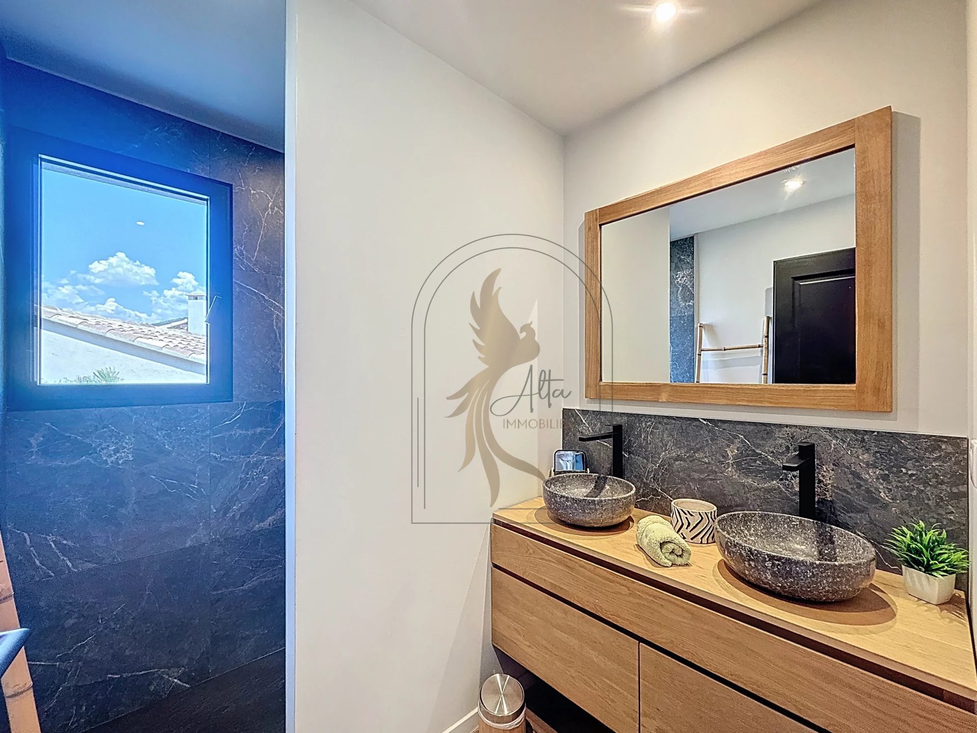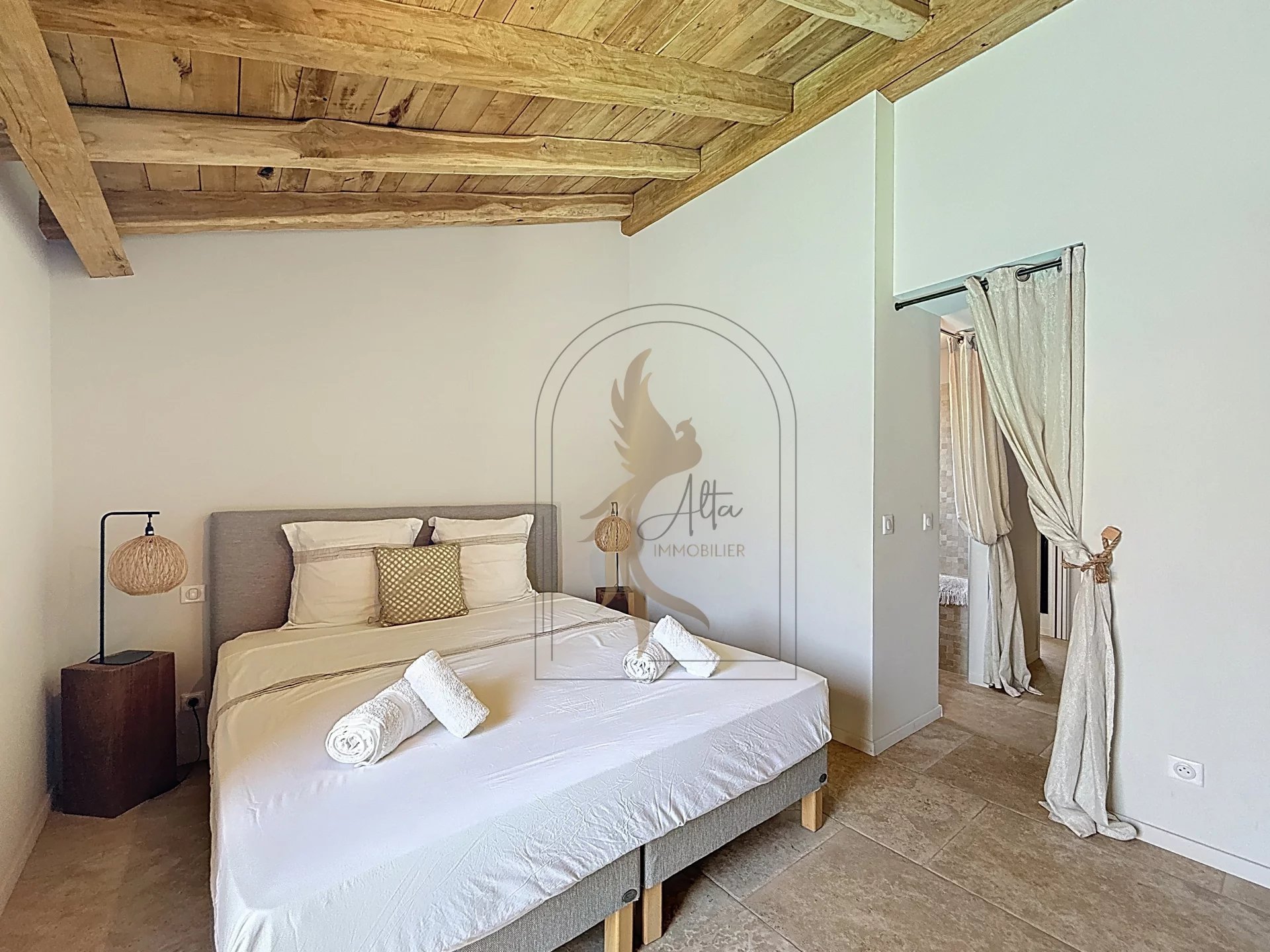 À cinq minutes de la plage du Cabanon Bleu, au sein d’un clos résidentiel de prestige composé de huit habitations de style bergerie en pierre de taille, cette villa offre un cadre de vie exceptionnel. Les prestations haut de gamme et la qualité des matériaux confèrent à ce bien un charme et un confort inimitables. Tout a été pensé avec soin, dans les moindres détails, afin de vous offrir une villégiature de rêve. La villa se compose d’un vaste salon-séjour baigné de lumière, avec poutres apparentes et charpente cathédrale, ouvert sur une cuisine entièrement équipée. De grandes baies vitrées à galandage prolongent l’espace de vie vers une belle terrasse semi-couverte et un jardin arboré. Le niveau inférieur accueille deux chambres lumineuses, une salle d’eau commune et un WC séparé. À l’étage, la suite parentale dispose d’un dressing, d’un WC indépendant et d’une salle de bains. En rez-de-jardin, une buanderie et une pièce de 22 m² offrent un espace supplémentaire pouvant servir de bureau, de salle de jeux ou de dortoir. Côté extérieur, vous profiterez d’une piscine de 7 x 3 mètres, entourée d’une terrasse en ipé de plus de 30 m², ainsi que d’une terrasse semi-couverte de 21 m². Le jardin, aménagé avec goût, est soigneusement planté et arboré. Deux places de stationnement extérieures complètent ce magnifique pied-à-terre de charme.