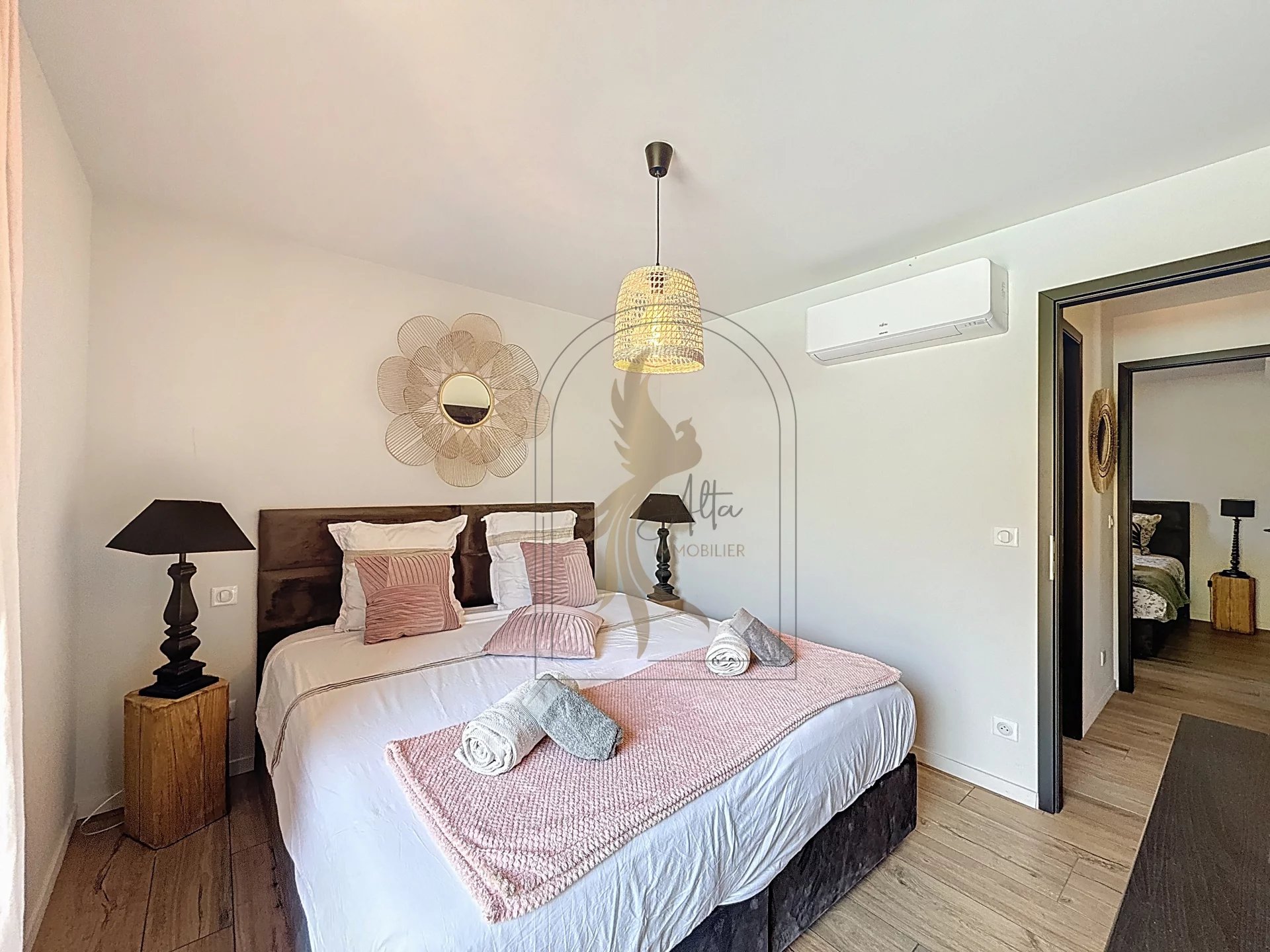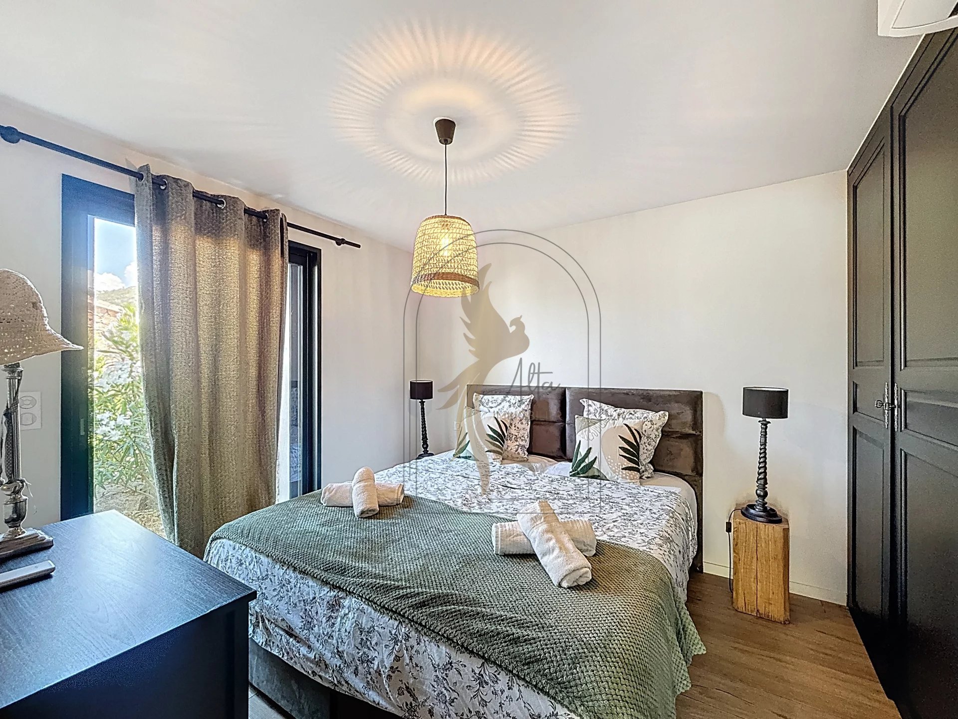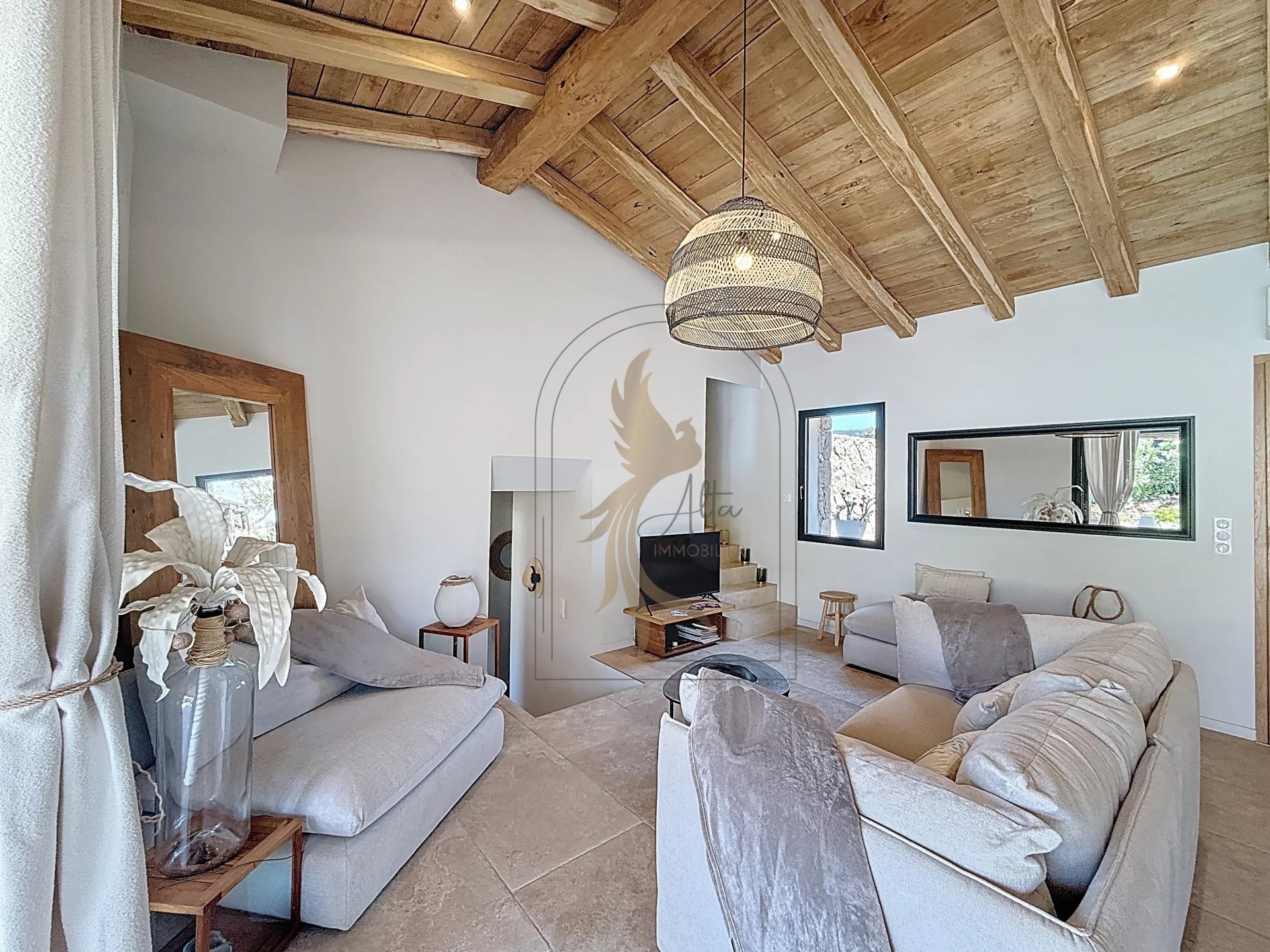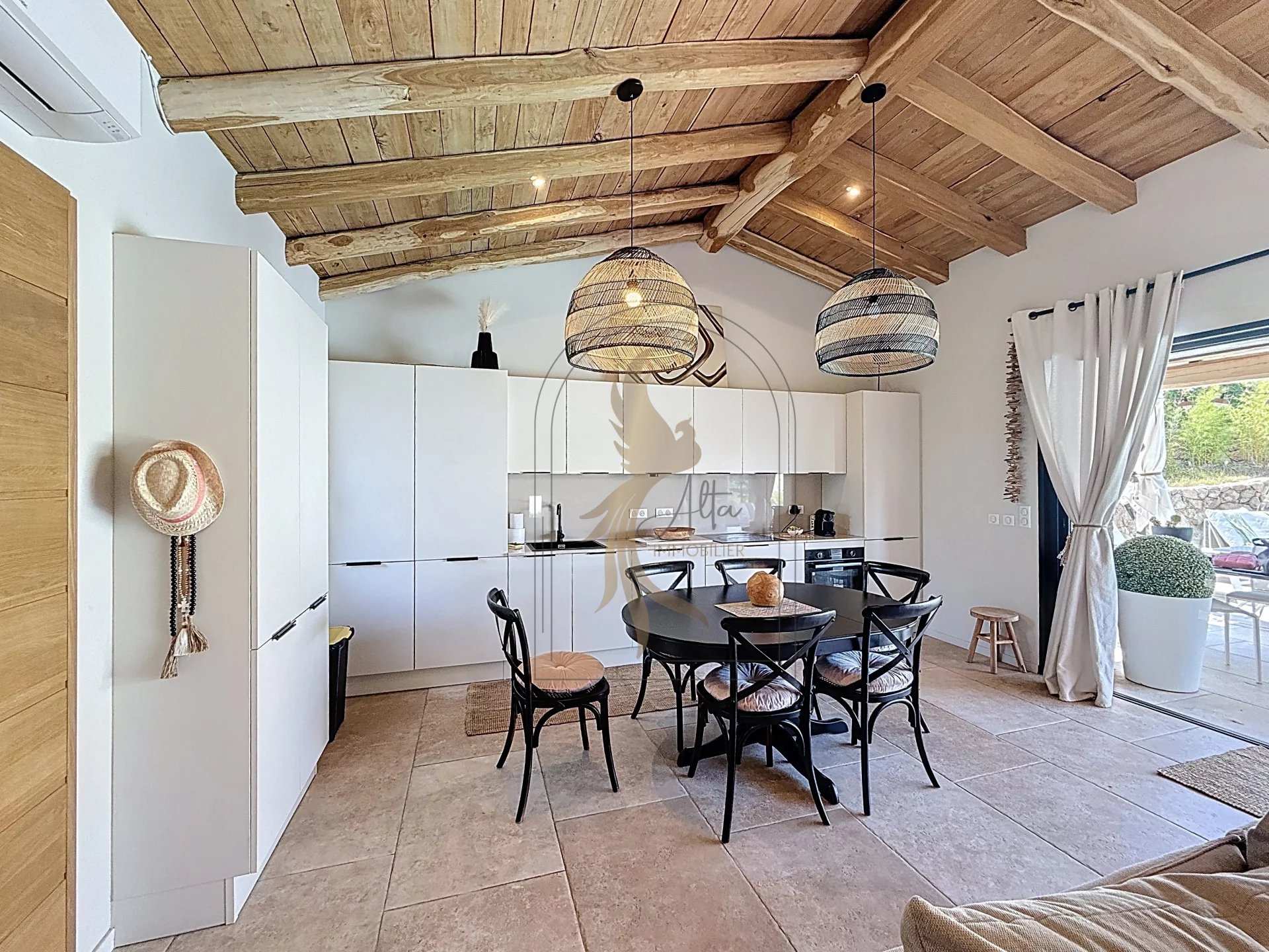À cinq minutes de la plage du Cabanon Bleu, au sein d’un clos résidentiel de prestige composé de huit habitations de style bergerie en pierre de taille, cette villa offre un cadre de vie exceptionnel. Les prestations haut de gamme et la qualité des matériaux confèrent à ce bien un charme et un confort inimitables. Tout a été pensé avec soin, dans les moindres détails, afin de vous offrir une villégiature de rêve. La villa se compose d’un vaste salon-séjour baigné de lumière, avec poutres apparentes et charpente cathédrale, ouvert sur une cuisine entièrement équipée. De grandes baies vitrées à galandage prolongent l’espace de vie vers une belle terrasse semi-couverte et un jardin arboré. Le niveau inférieur accueille deux chambres lumineuses, une salle d’eau commune et un WC séparé. À l’étage, la suite parentale dispose d’un dressing, d’un WC indépendant et d’une salle de bains. En rez-de-jardin, une buanderie et une pièce de 22 m² offrent un espace supplémentaire pouvant servir de bureau, de salle de jeux ou de dortoir. Côté extérieur, vous profiterez d’une piscine de 7 x 3 mètres, entourée d’une terrasse en ipé de plus de 30 m², ainsi que d’une terrasse semi-couverte de 21 m². Le jardin, aménagé avec goût, est soigneusement planté et arboré. Deux places de stationnement extérieures complètent ce magnifique pied-à-terre de charme.