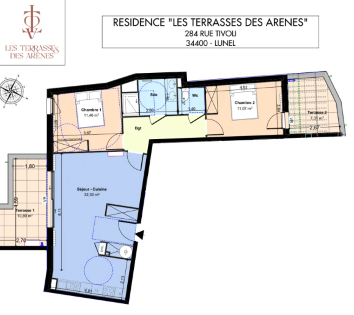 Situé au coeur de Lunel, au sein de la résidence sécurisée Les Terrasses des Arènes, découvrez le dernier lot disponible dans ce programme neuf recherché. *Les atouts du bien Résidence intimiste de 23 logements seulement Résidence sécurisée avec prestations modernes Commerces en rez-de-chaussée Emplacement premium en plein centre-ville Accès immédiat au marché et aux commodités A deux pas du parc Jean Hugo et des arènes *Surfaces Surface habitable : 67,68 m² Terrasse 1 : 10,89 m² Terrasse 2 : 7,31 m² Total extérieur : 18,20 m² Surface totale privative : 85,88 m² *Agencement : Séjour / cuisine : 32,30 m² (grand espace de vie lumineux) Chambre 1 : 11,46 m² Chambre 2 : 11,07 m² Salle de bain : 4,87 m² WC séparés Dégagement avec rangements *Les + qui font la différence Double terrasse (rare) : une côté séjour (10,89 m²) une côté chambre (7,31 m²) Dernier étage = calme + luminosité maximale Résidence récente et sécurisée Commerces en pied d'immeuble Tout à pied : marché, centre, commodités Produit rare sur Lunel : dernier T3 disponible avec extérieur généreux en centre-ville. Idéal résidence principale ou investissement locatif. Pour plus d'informations ou organiser une visite, merci de prendre contact avec Bruno de l'agence Orfèvre.