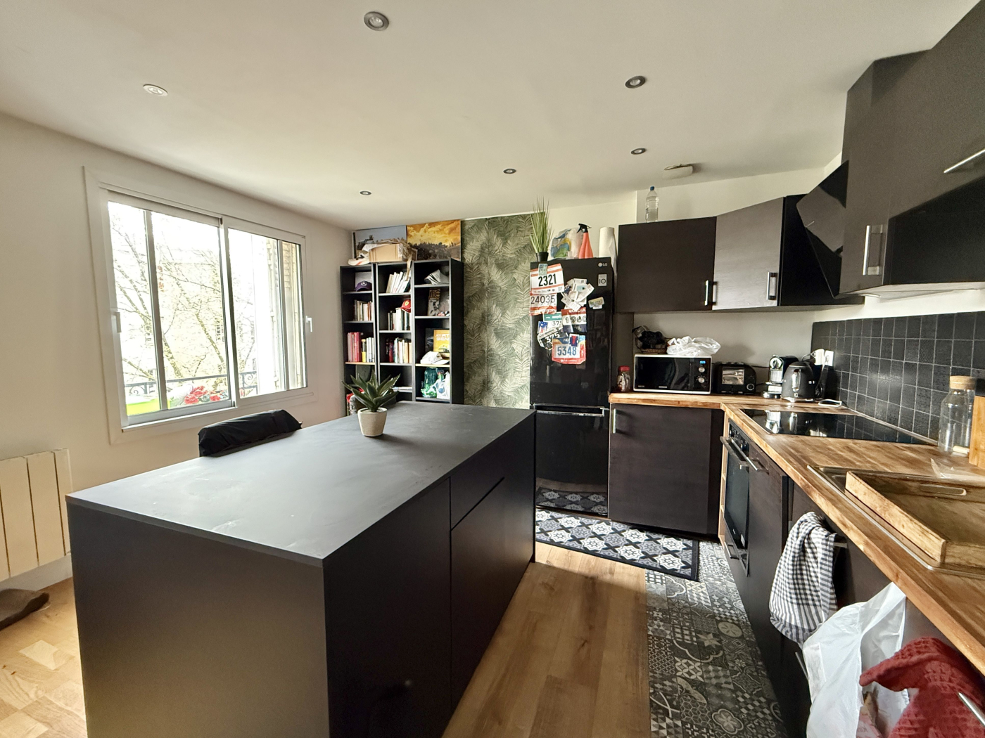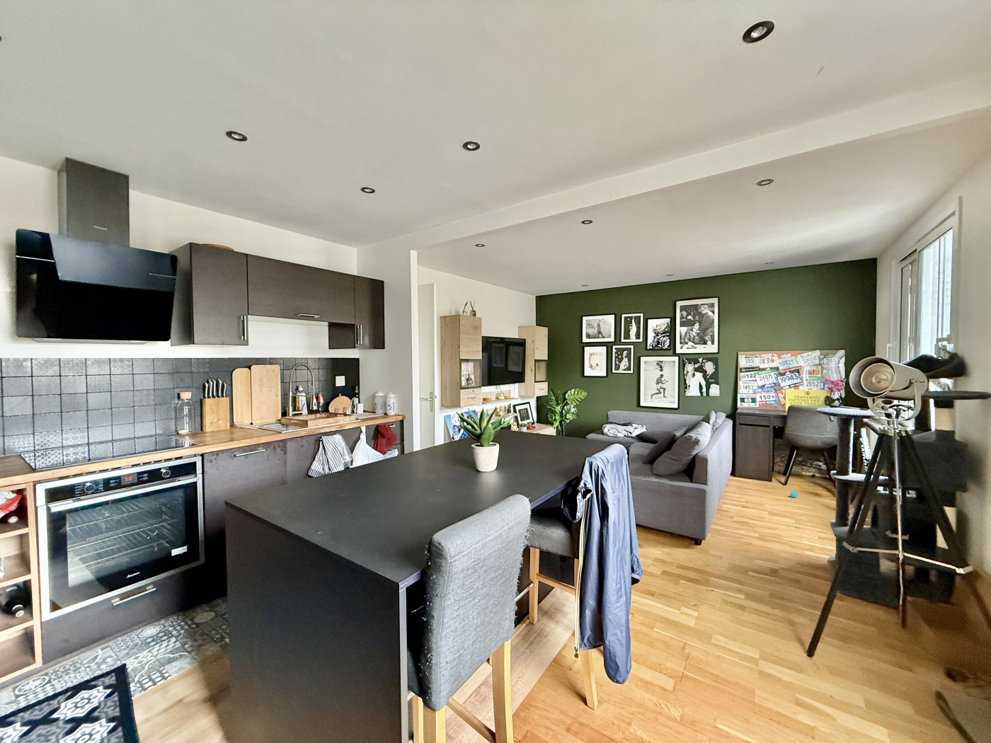 Il comprend une entrée avec placard, un séjour de 26,59 m², une cuisine aménagée et équipée ouverte sur le séjour, deux chambres sur cour, une salle d'eau avec WC. Nombreux rangements.