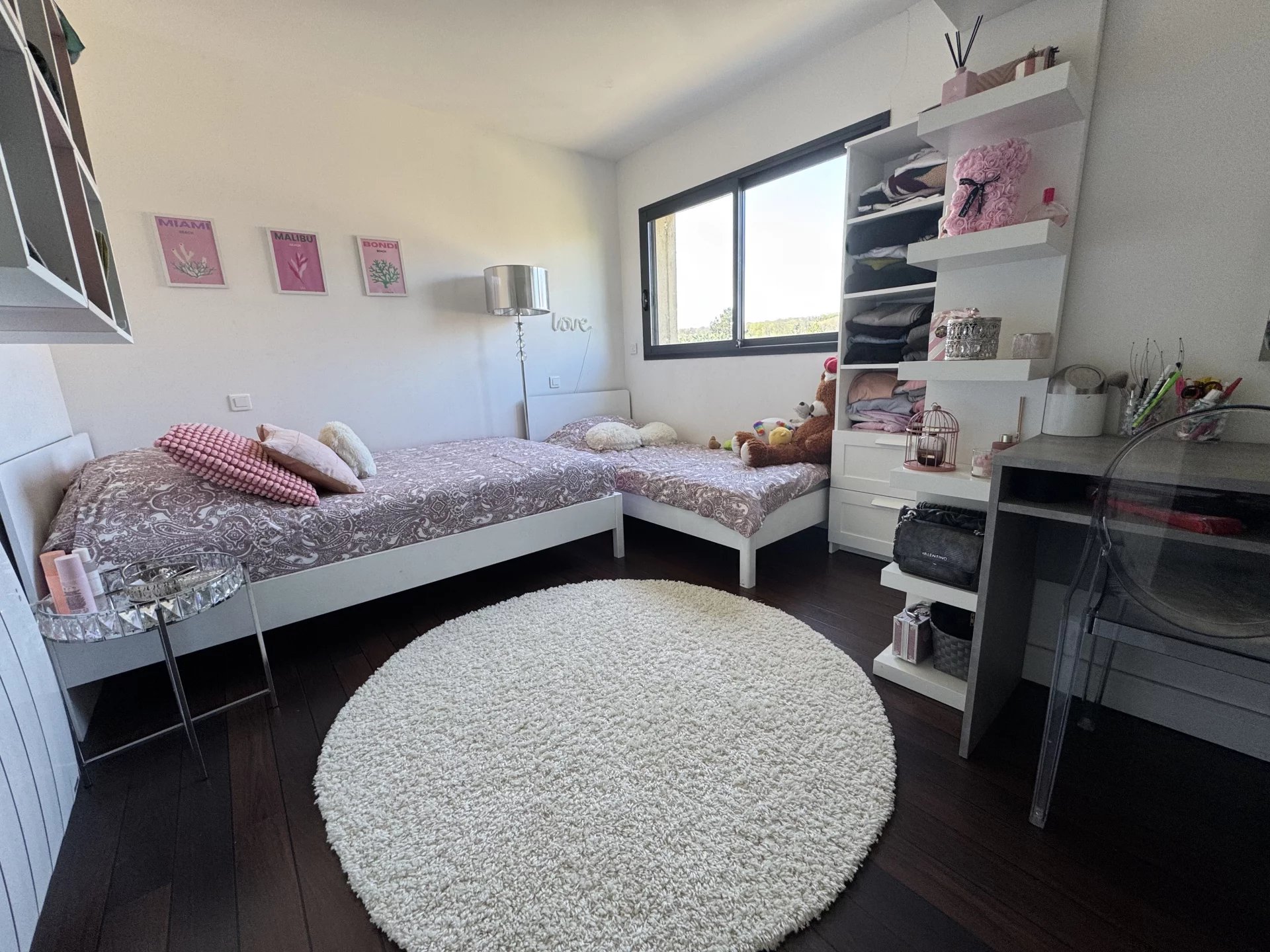 La maison possède des menuiseries en aluminium double vitrage, volets roulant alu, pompe à chaleur air/air.