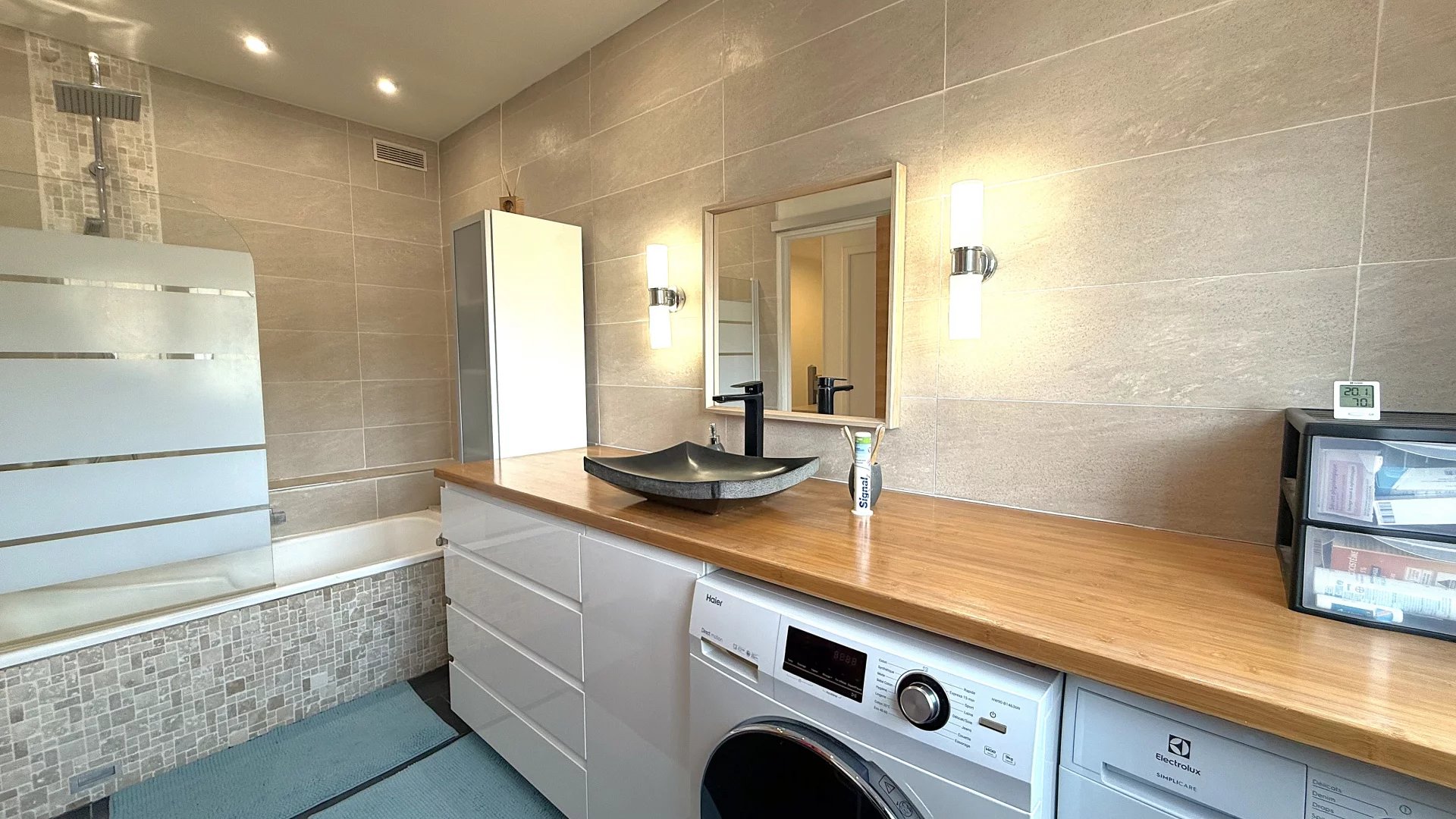 Au RDC, le garage peut recevoir 1 voiture et motos + espace buanderie.