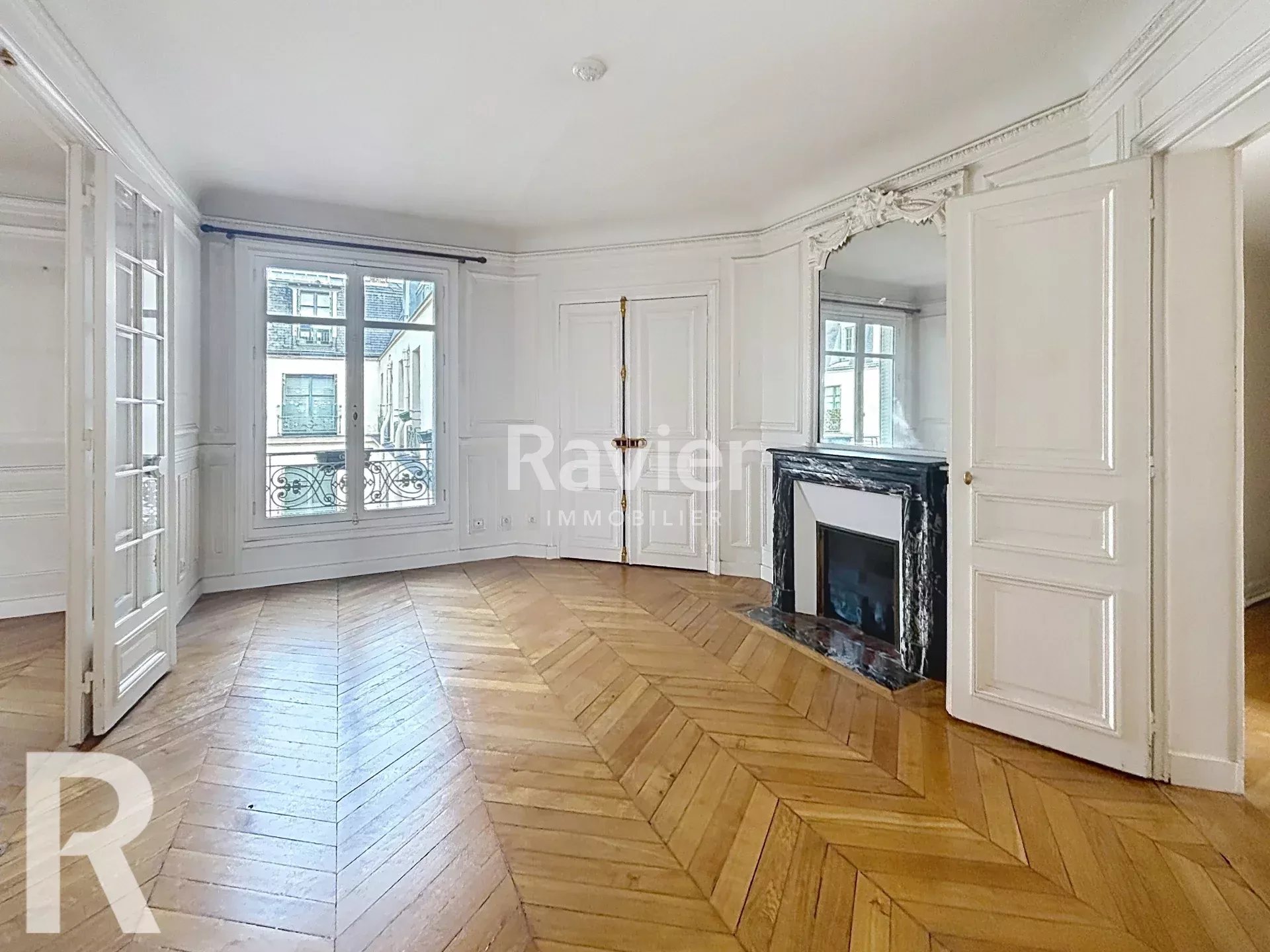 Cet appartement reflète tout le charme de l’haussmannien : parquet, élégantes moulures, cheminées.