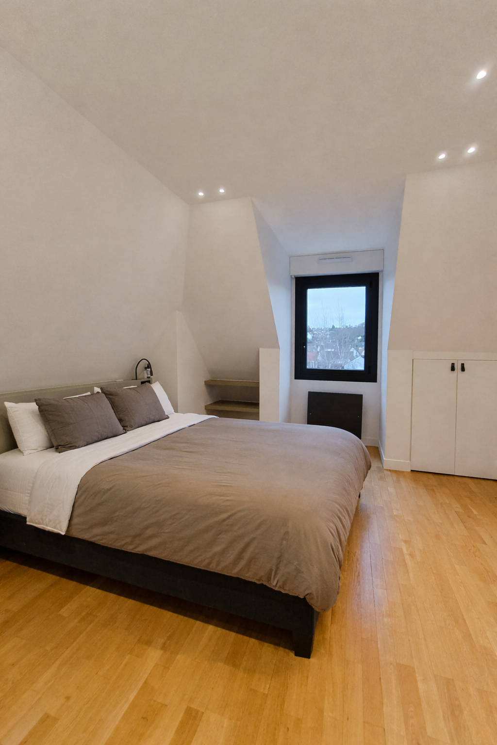 La maison dispose de 4 suites parentales ainsi que d'un palier aménagé en bureau. Chaque suite est dotée de sa propre salle d'eau, garantissant confort et intimité à tous les occupants. Les volumes ont été pensés pour offrir une atmosphère sereine et harmonieuse.