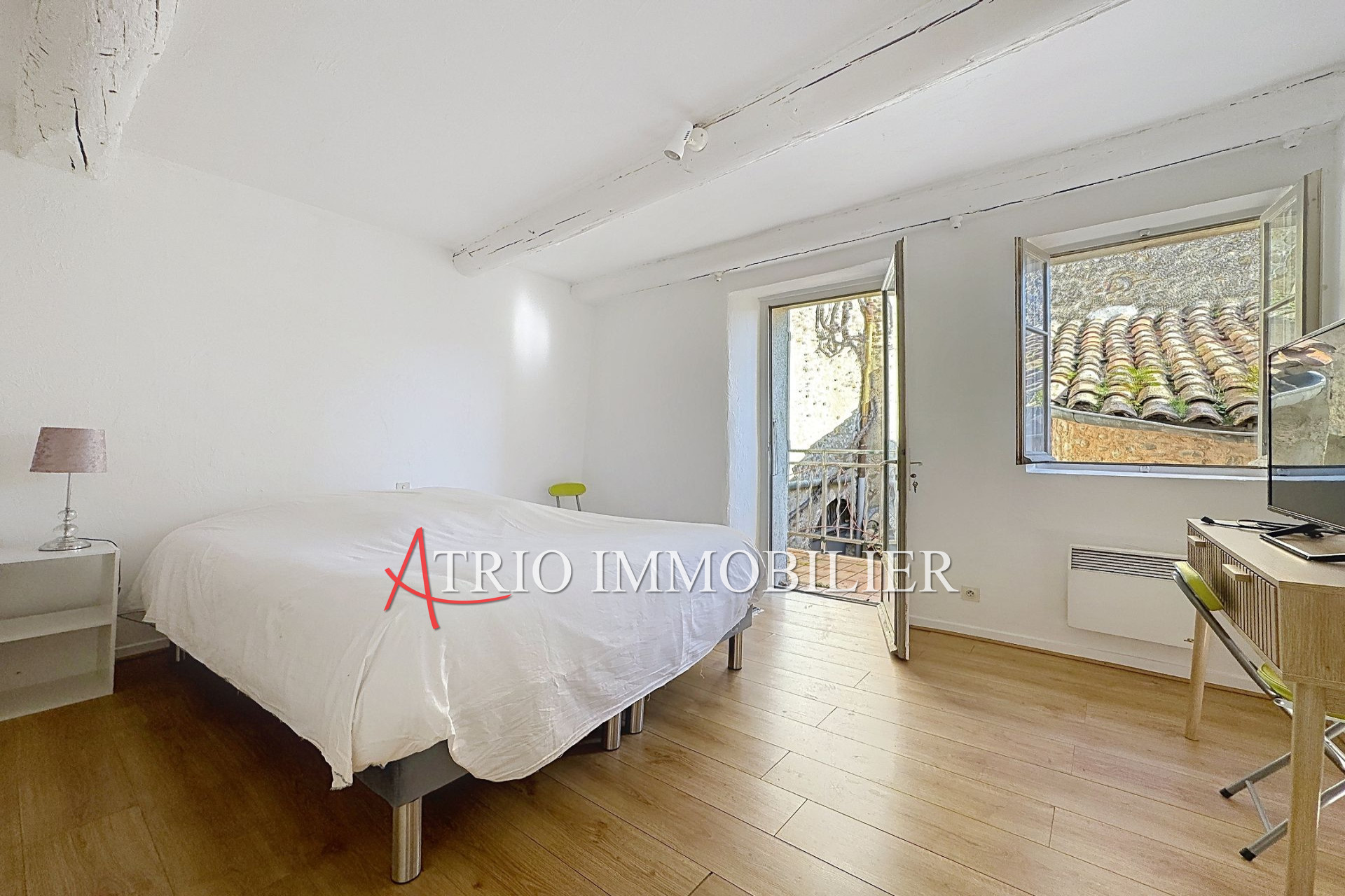 À l'étage, une suite avec chambre et salle de bains bénéficie d'une vue exceptionnelle mêlant la pierre historique des bâtiments du Haut de Cagnes et un aperçu de la mer, offrant un cadre de vie rare et inspirant.