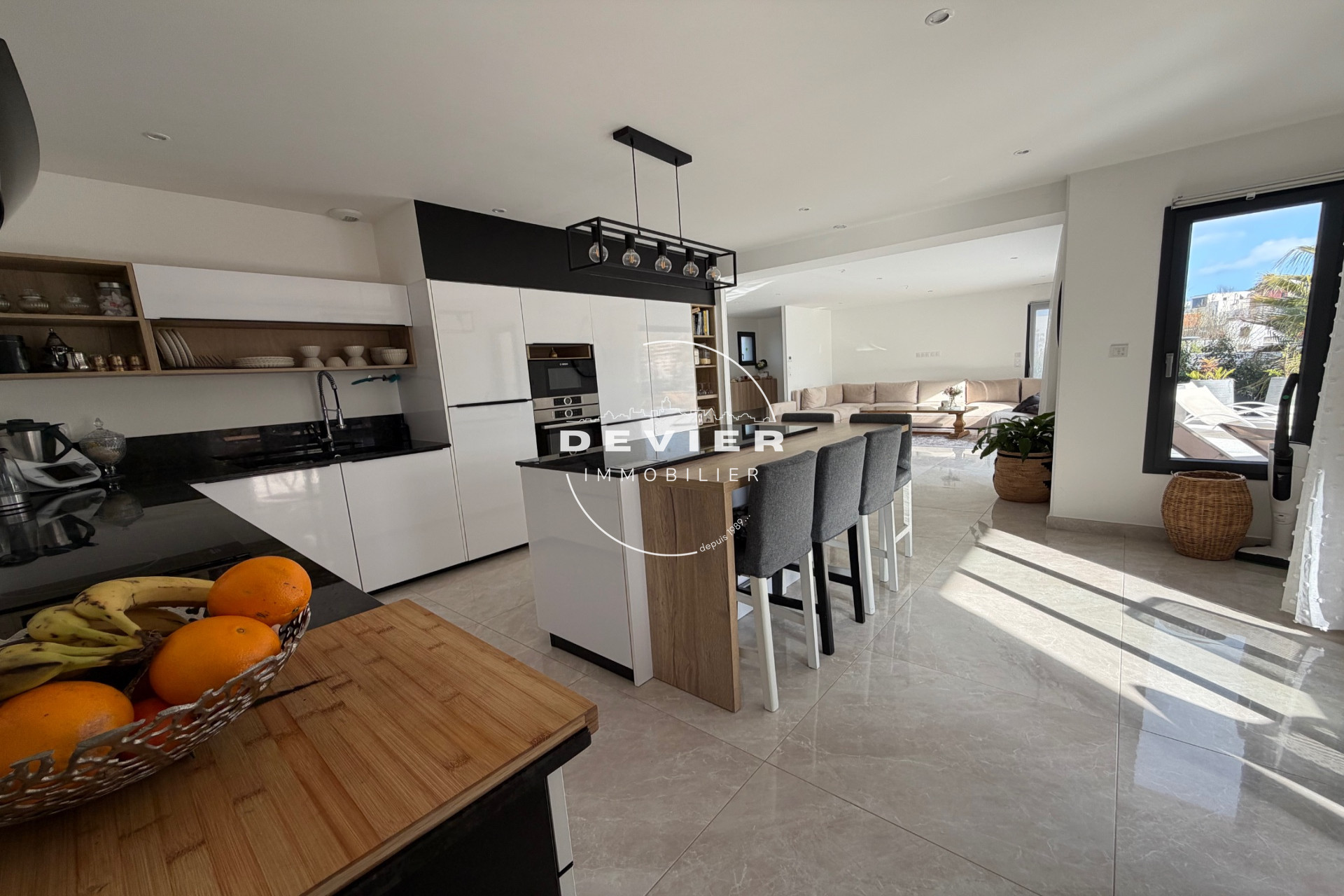 Superbe maison contemporaine de 2022, de 152 m² + 70 m² de sous-sol, bien pensée et baignée de lumière. Elle est composée au rez-de-chaussée d'un salon séjour avec cuisine américaine ouverte entièrement aménagée et équipée, une arrière-cuisine, une chambre de plain-pied (actuellement agencée en salon télé) avec sa salle d'eau et Wc.