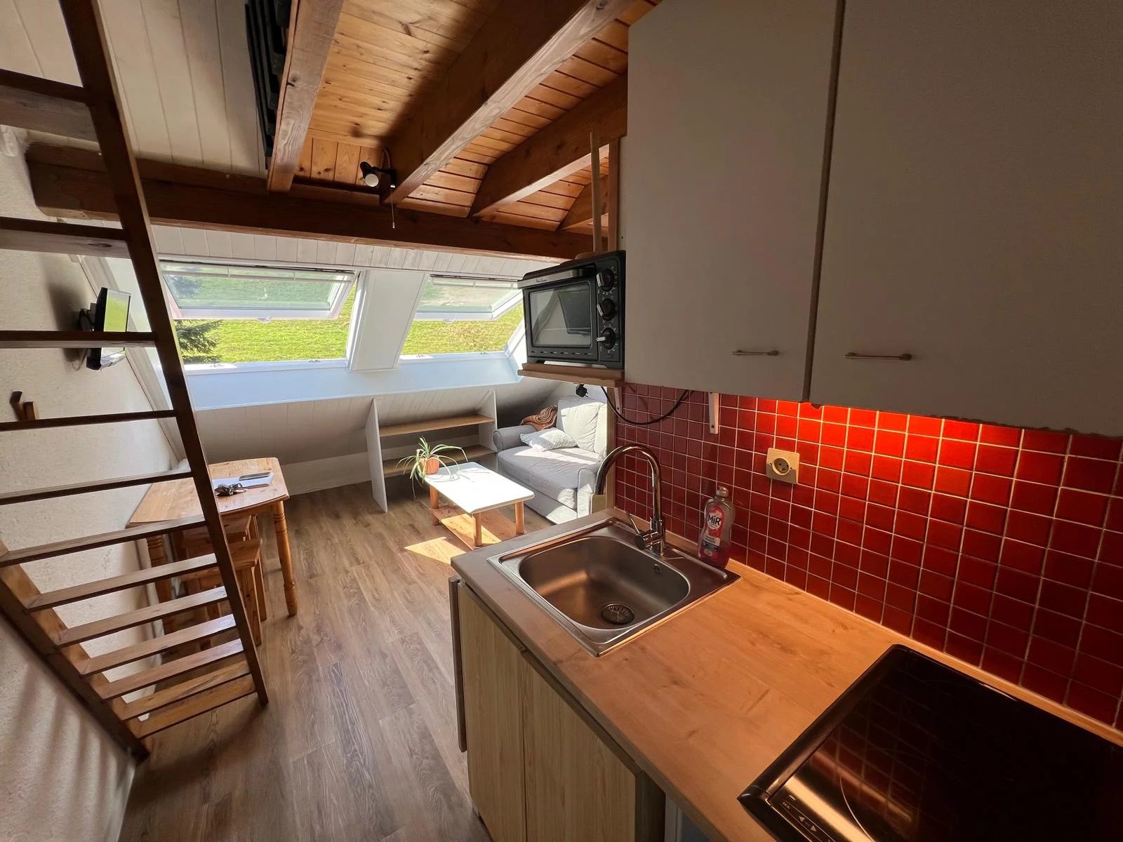 Ce charmant studio T1 a été rénové avec goût.(12.20 m² carrez) 34.79 m² au sol Malgré sa petite superficie l'appartement propose tout le confort et les commodités. Une cuisine équipée, une salle de douche à l'italienne entièrement rénovée avec toilette, un espace bureau. Une mezzanine propose un coin nuit indépendant, accessible par un escalier de meunier, les deux grandes fenêtres de toit neuves s'ouvrent sur les prairies. Idéal pour investisseur locatif. Le studio se situe au 6ème étage de la résidence Ste Anne à Aillon le Jeune. Casier de rangement en face du studio. Vendu meublé. Nombreuses activités estivales et hivernales: piscine extérieure avec SPA ouvert en 2025, accès à la station de ski alpin du Margériaz à 15 mn en hiver. Renseignements Gisèle 0679197139 ou Killian 0770546293