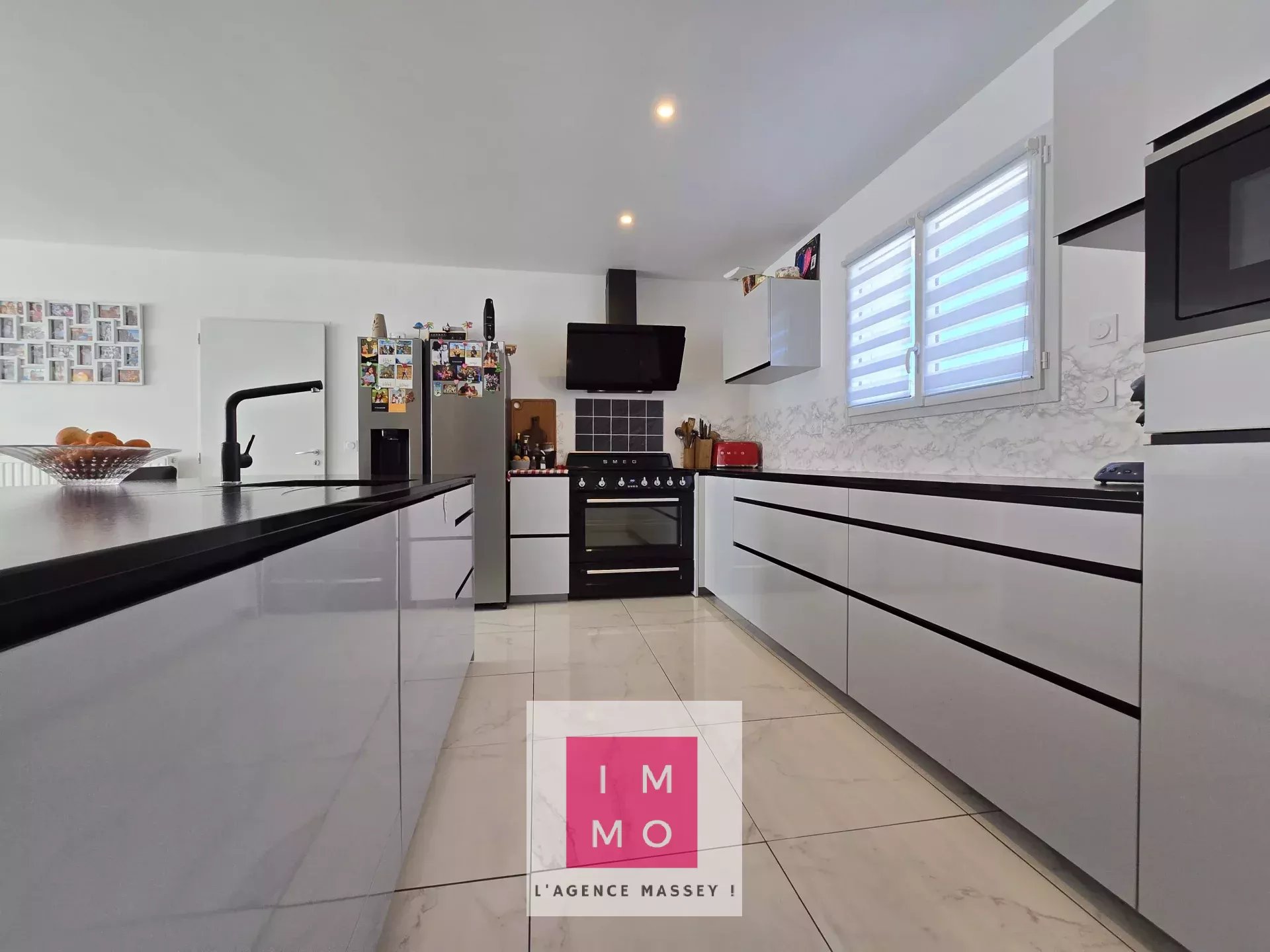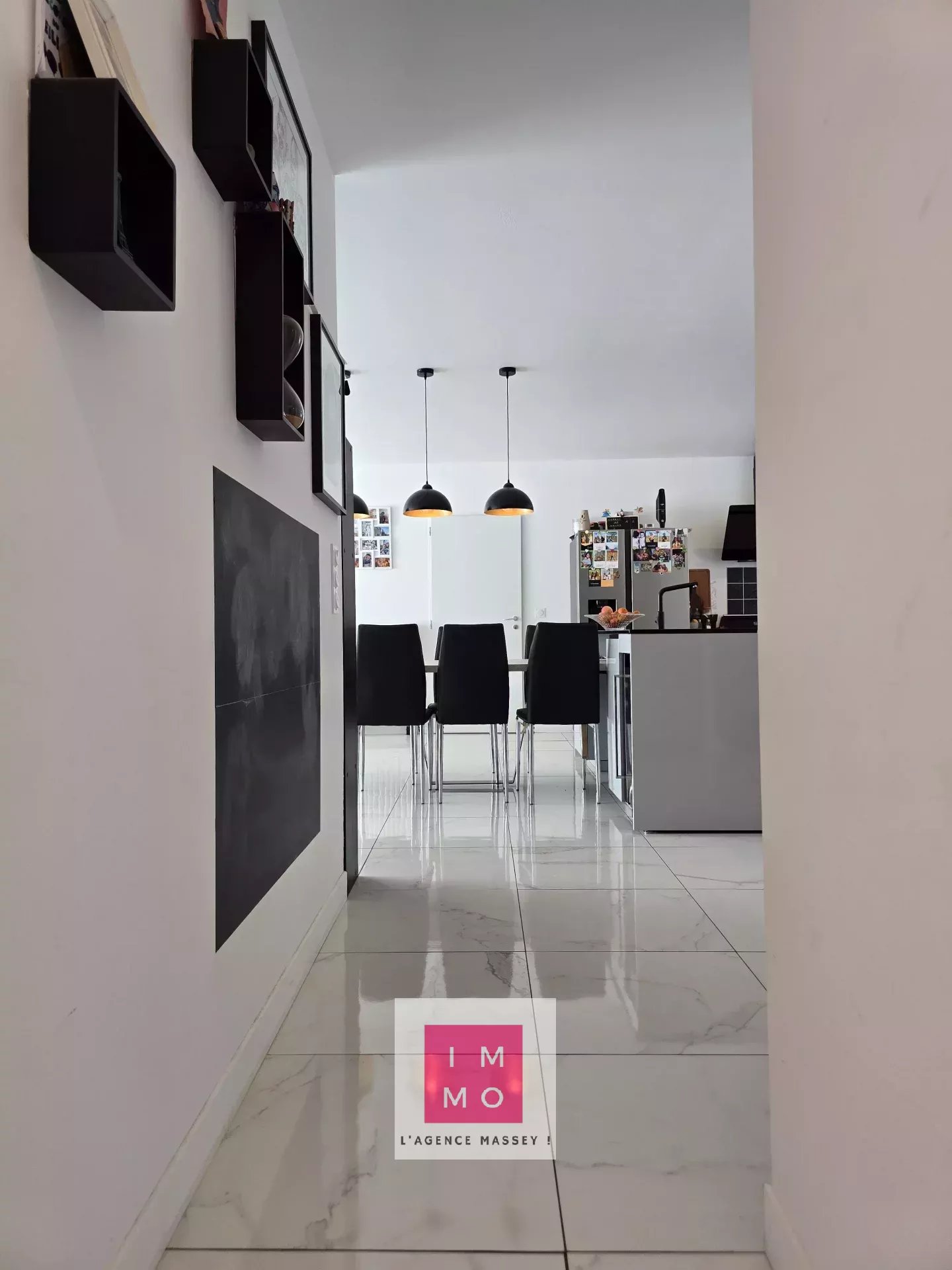 - l'espace repas pour accueillir famille et amis; belle table fixée à l'ilot central avec accès à la cave à vin intégrée.