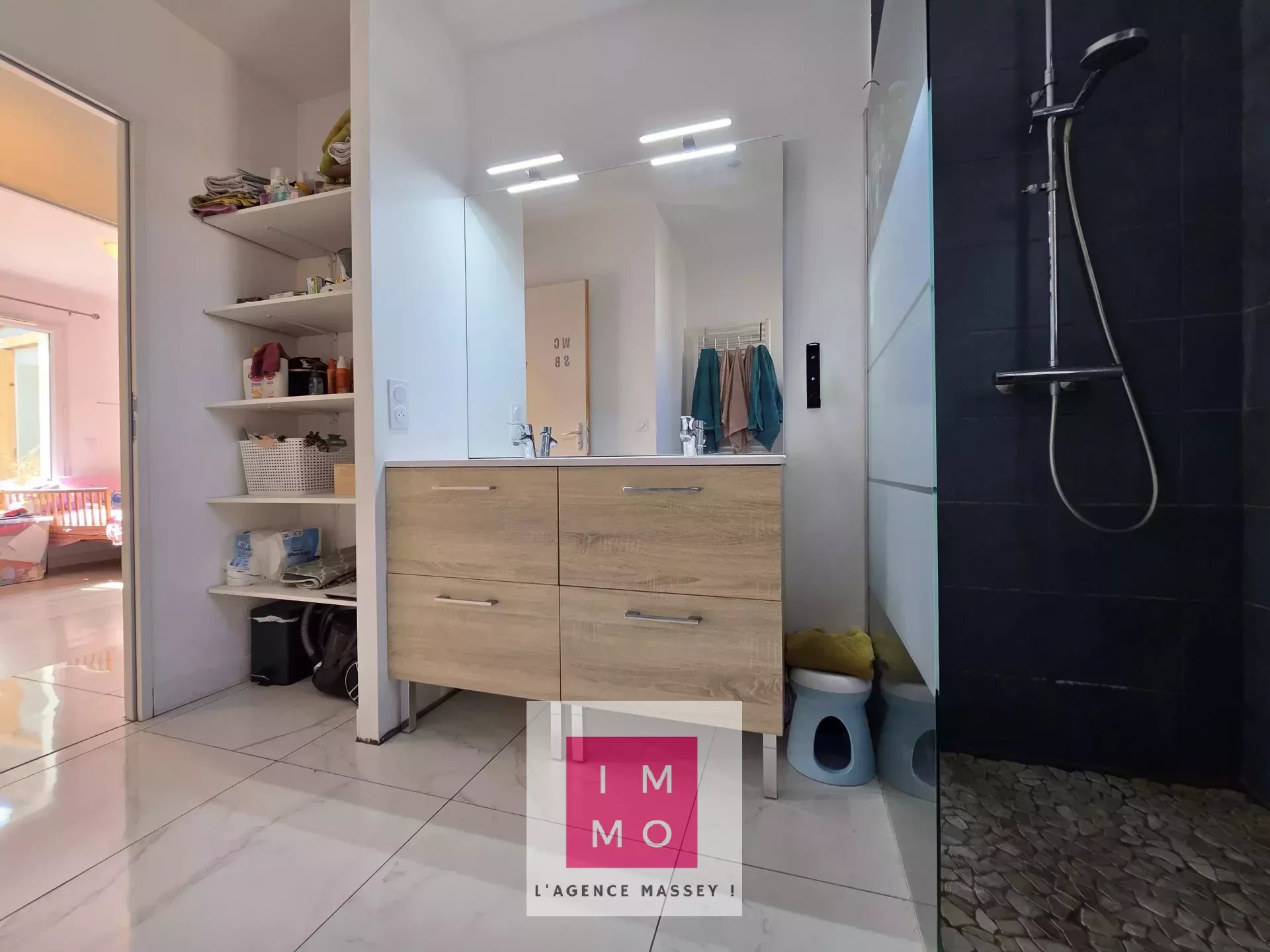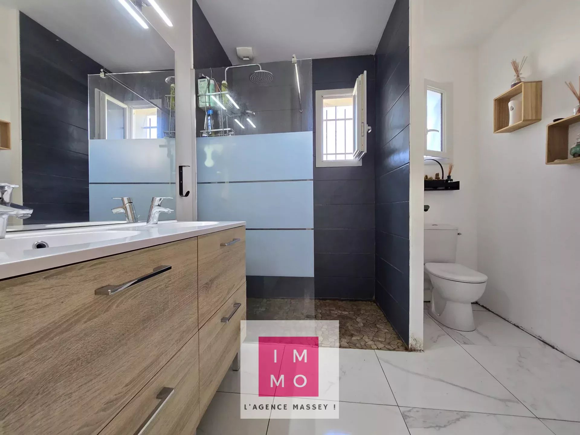 - d'une salle de bain avec double vasques, douche à l'italienne et toilettes.