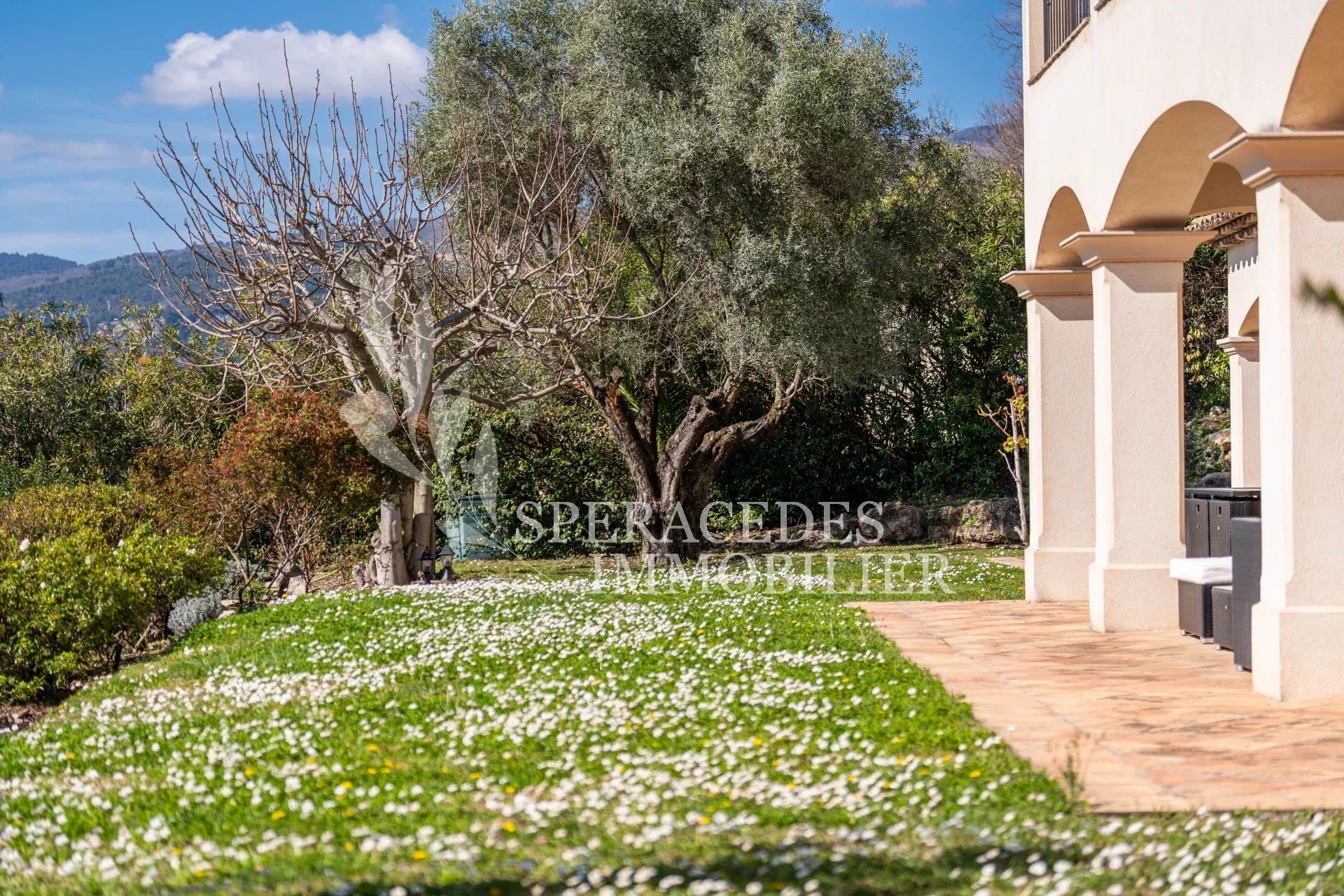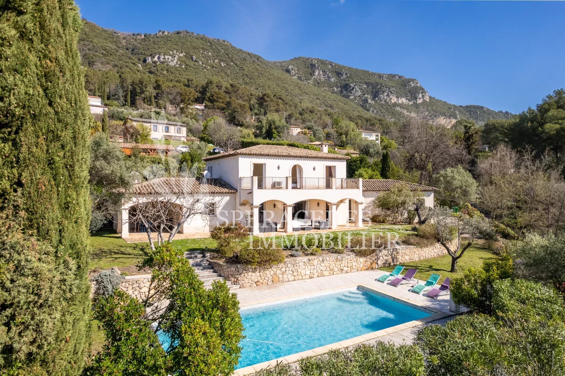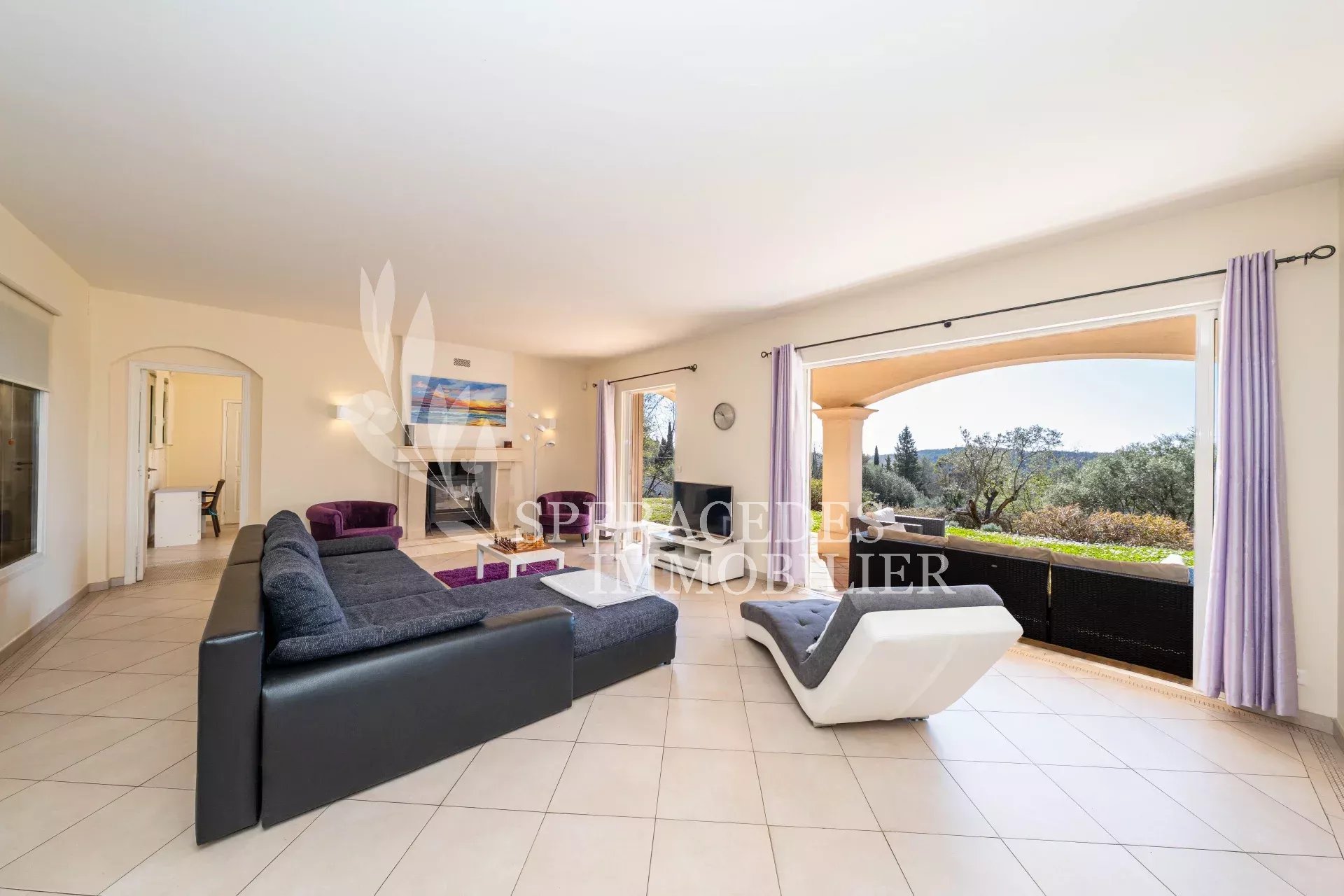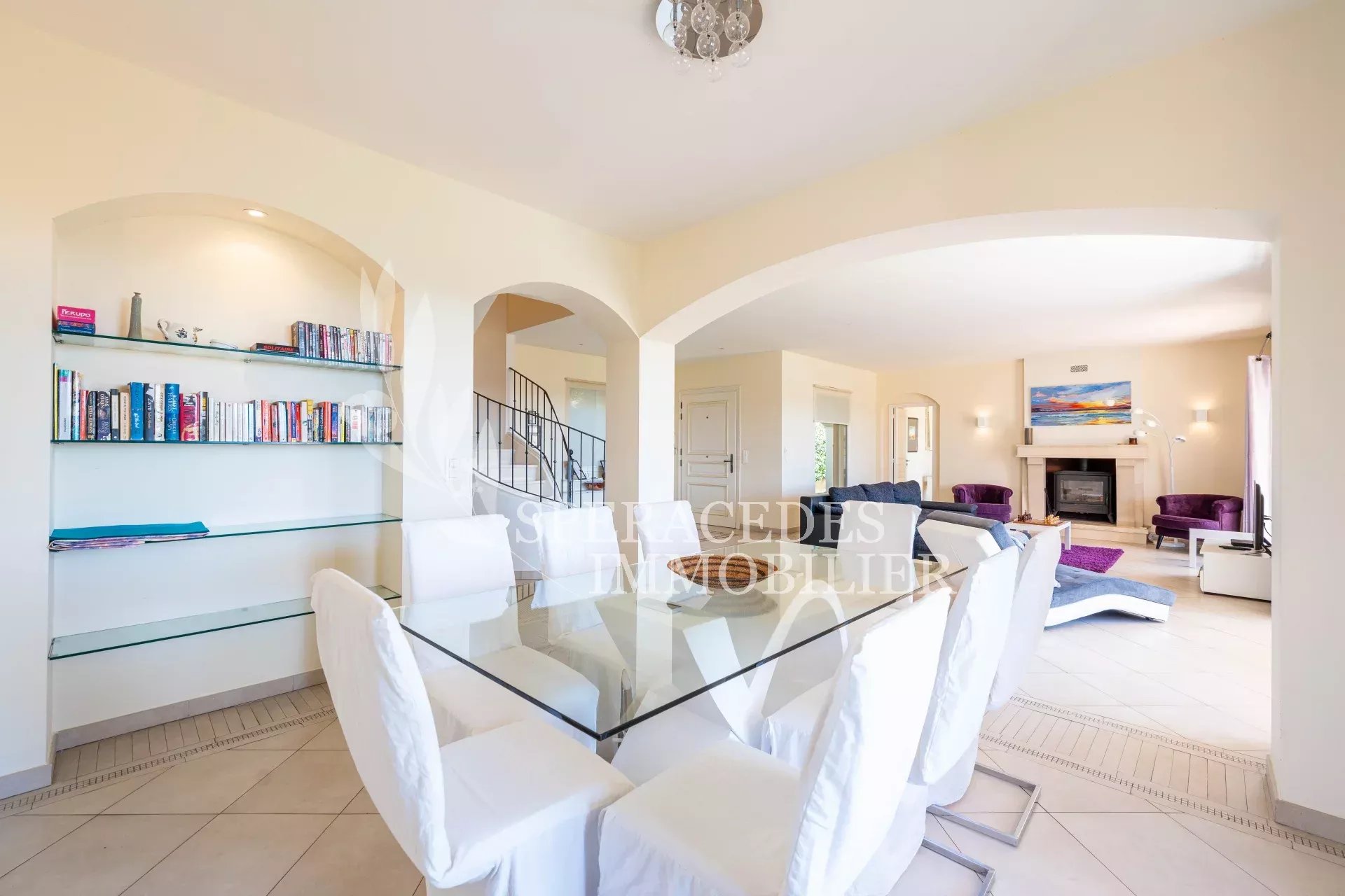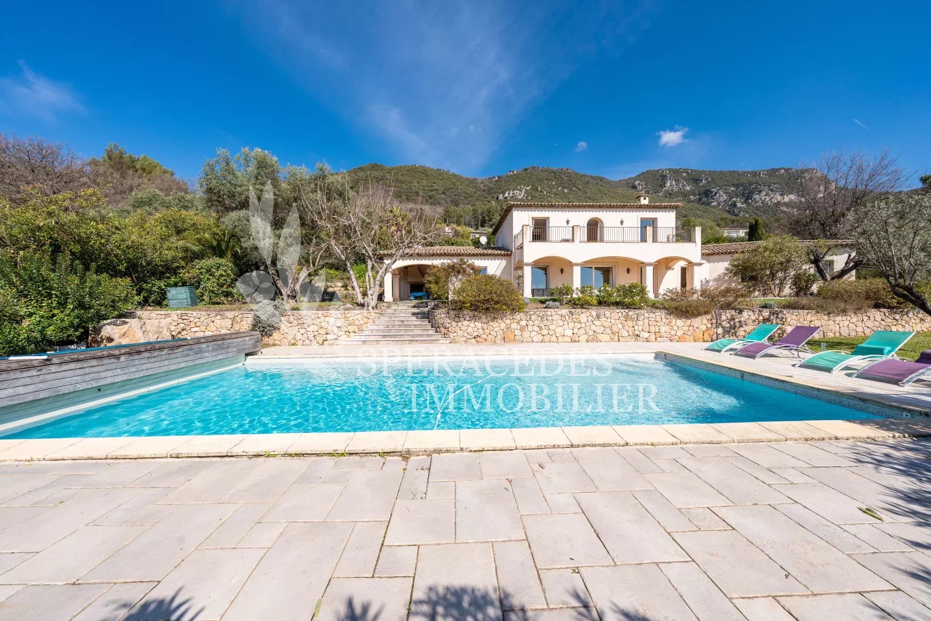 Située au coeur d’un environnement calme et sans vis-à-vis, cette élégante maison exposée sud et construite en 2005 bénéficie d’une belle vue dégagée sur les collines. D’une surface d’environ 210m², cette maison confortable, aux prestations actuelles est la parfaite combinaison du charme et de la modernité. Elle comprend: - Au niveau de l’entrée: un spacieux et lumineux séjour/salle à manger avec poêle à bois, le tout donnant sur une profonde terrasse, un toilettes invités, une cuisine équipée donnant sur une terrasse ombragée avec barbecue, une chambre avec salle de douche en suite. - A l’étage: une chambre de maitre avec salle de bains en suite et dressing, 2 chambres, une salle de bains. Chaque chambre donne sur une terrasse exposée Sud. - Un garage, plusieurs places de parking et une grande cave. Joli terrain de 2400m² complanté d’essences méditerranéennes avec piscine en mosaïque 11x5 mètres.