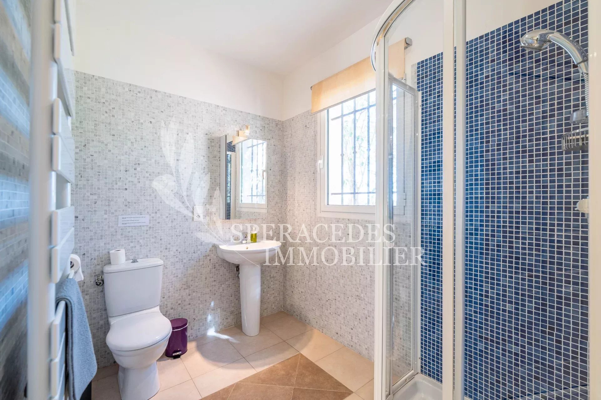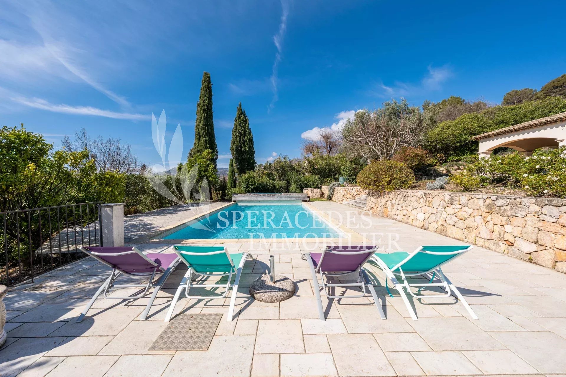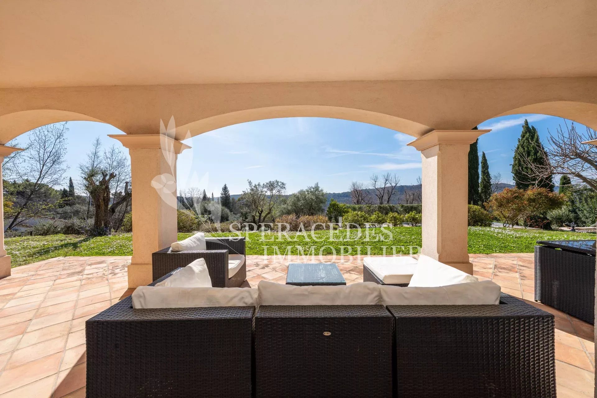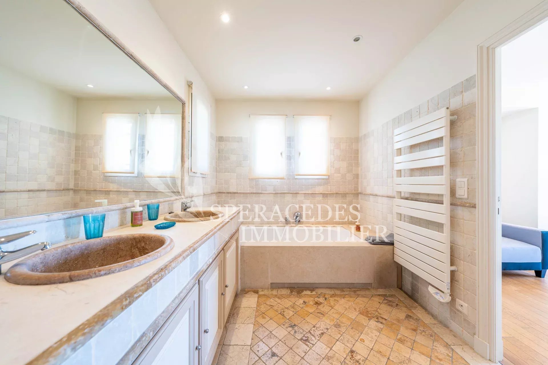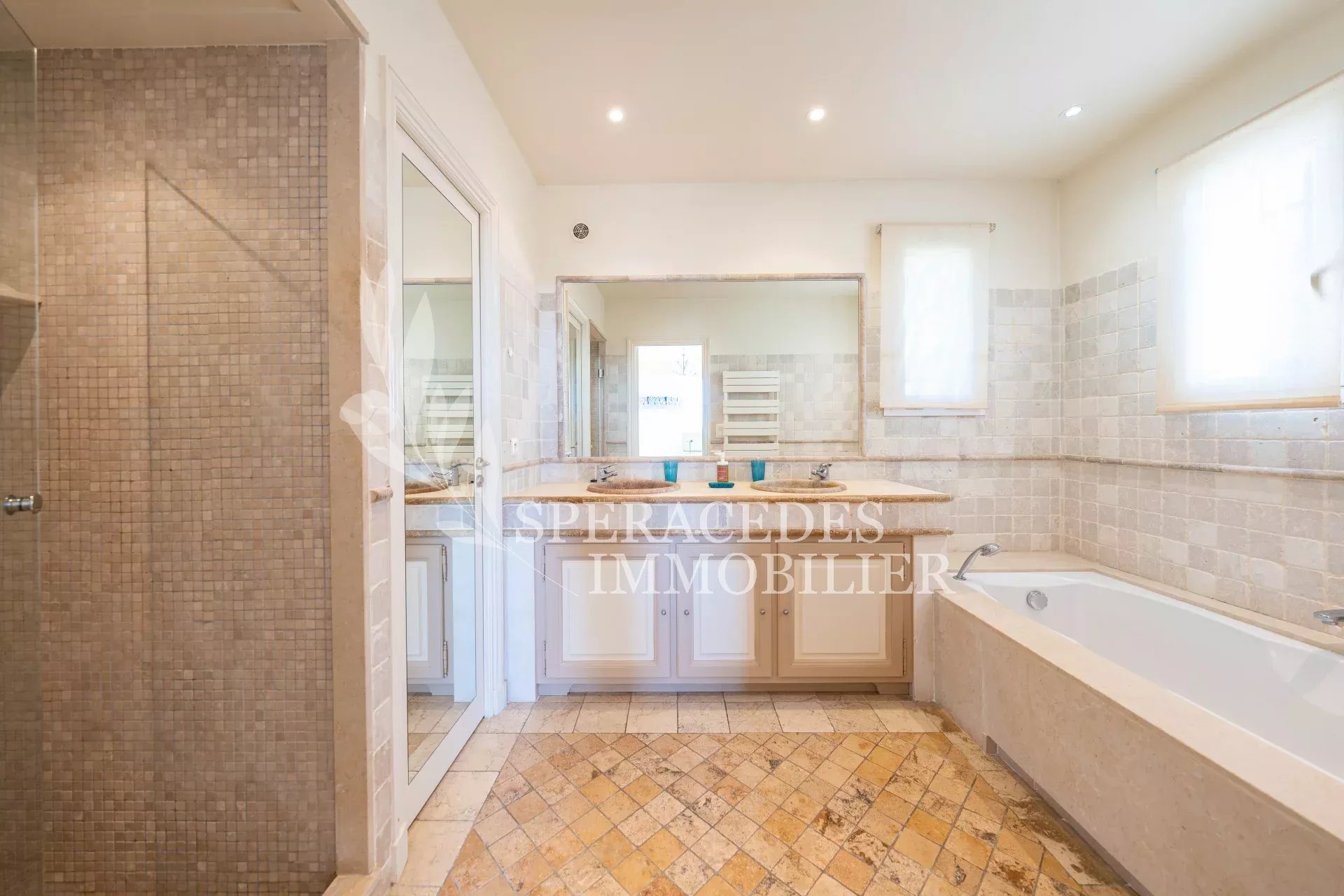 Située au coeur d’un environnement calme et sans vis-à-vis, cette élégante maison exposée sud et construite en 2005 bénéficie d’une belle vue dégagée sur les collines. D’une surface d’environ 210m², cette maison confortable, aux prestations actuelles est la parfaite combinaison du charme et de la modernité. Elle comprend: - Au niveau de l’entrée: un spacieux et lumineux séjour/salle à manger avec poêle à bois, le tout donnant sur une profonde terrasse, un toilettes invités, une cuisine équipée donnant sur une terrasse ombragée avec barbecue, une chambre avec salle de douche en suite. - A l’étage: une chambre de maitre avec salle de bains en suite et dressing, 2 chambres, une salle de bains. Chaque chambre donne sur une terrasse exposée Sud. - Un garage, plusieurs places de parking et une grande cave. Joli terrain de 2400m² complanté d’essences méditerranéennes avec piscine en mosaïque 11x5 mètres.