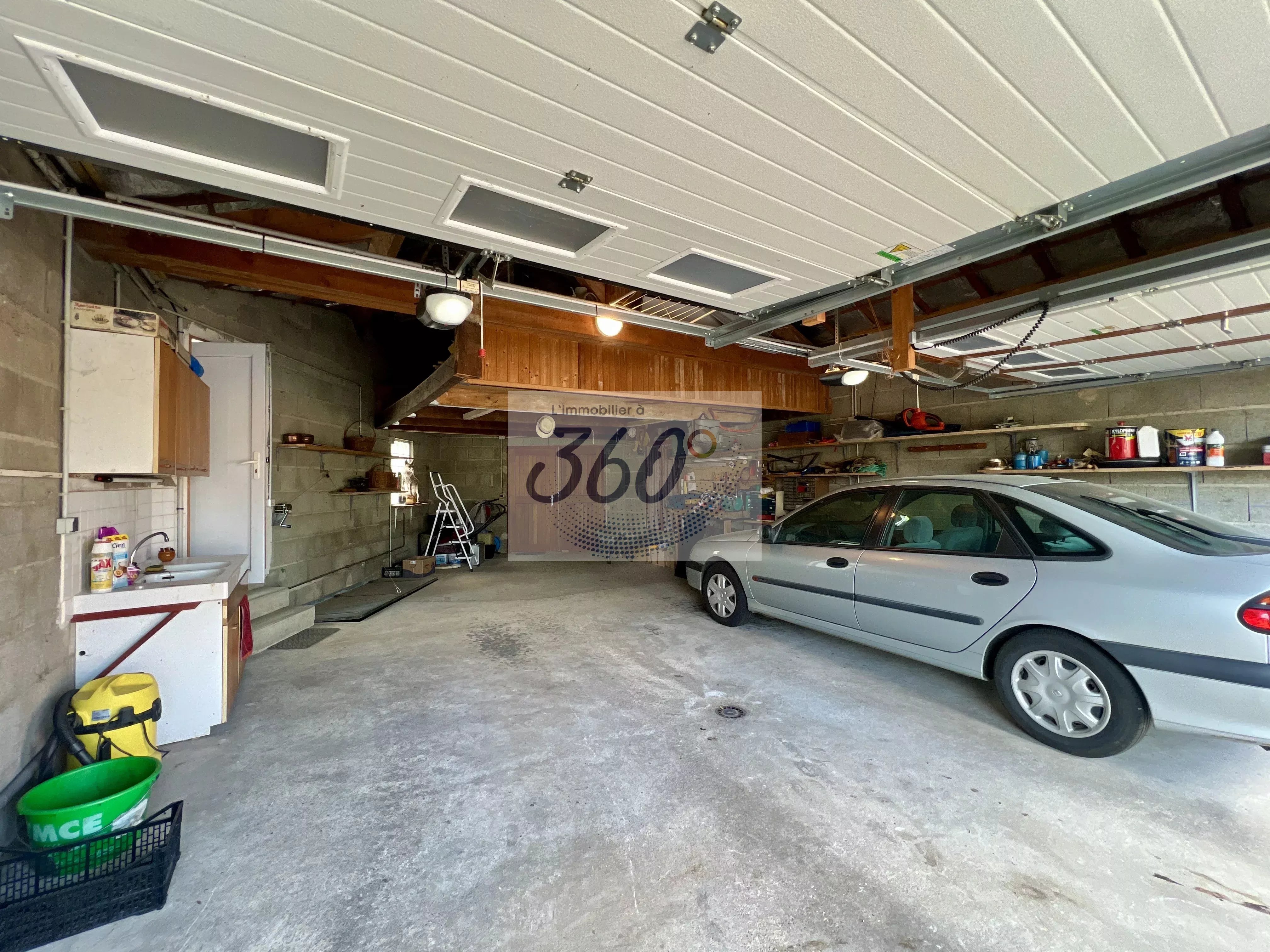 Un immense garage double d’environ 60 m² complète l’ensemble : portes automatisées, espace bricolage, point d’eau, évacuations… Un véritable atout pour les passionnés de rangement, de jardinage ou de loisirs.